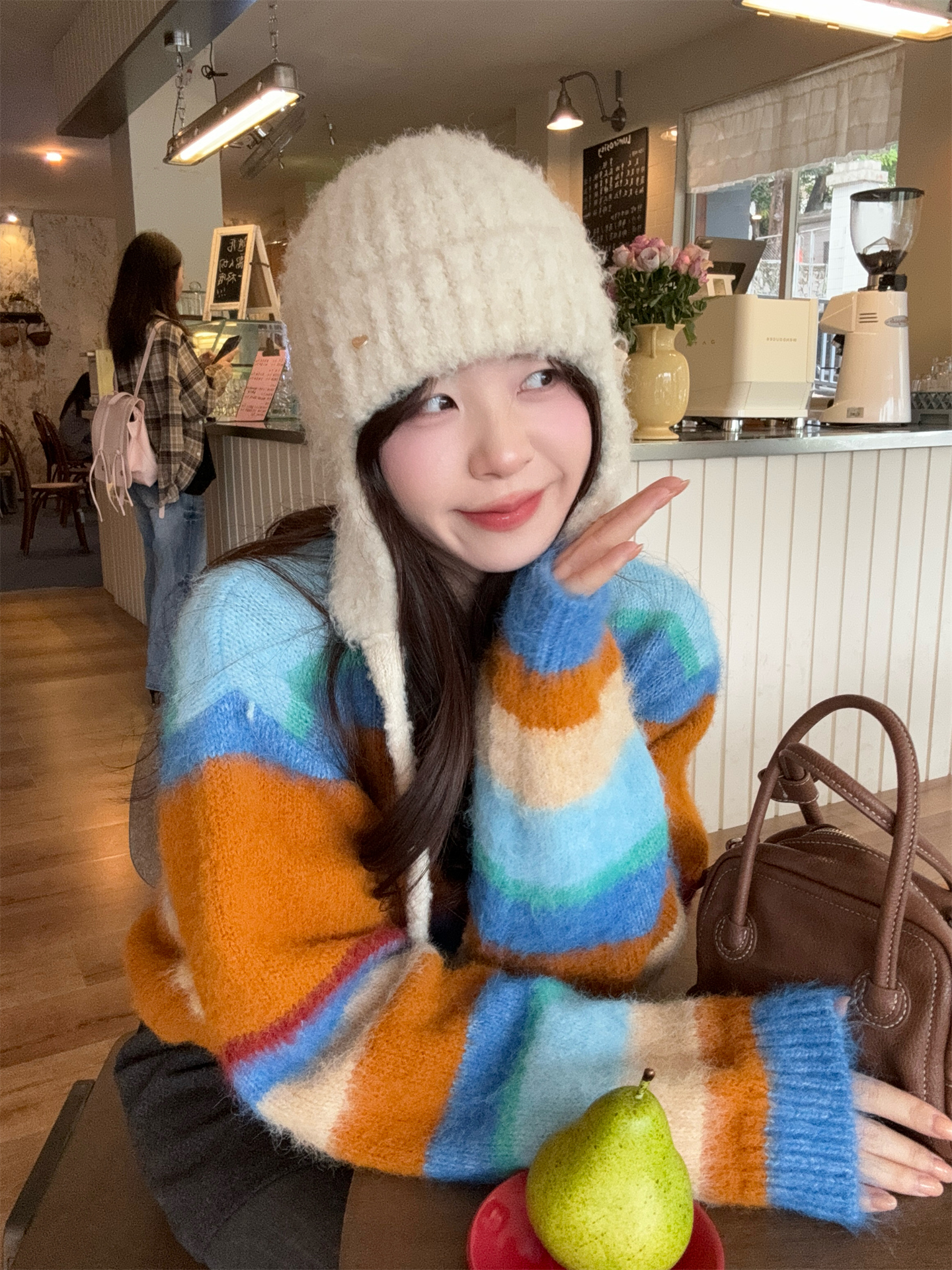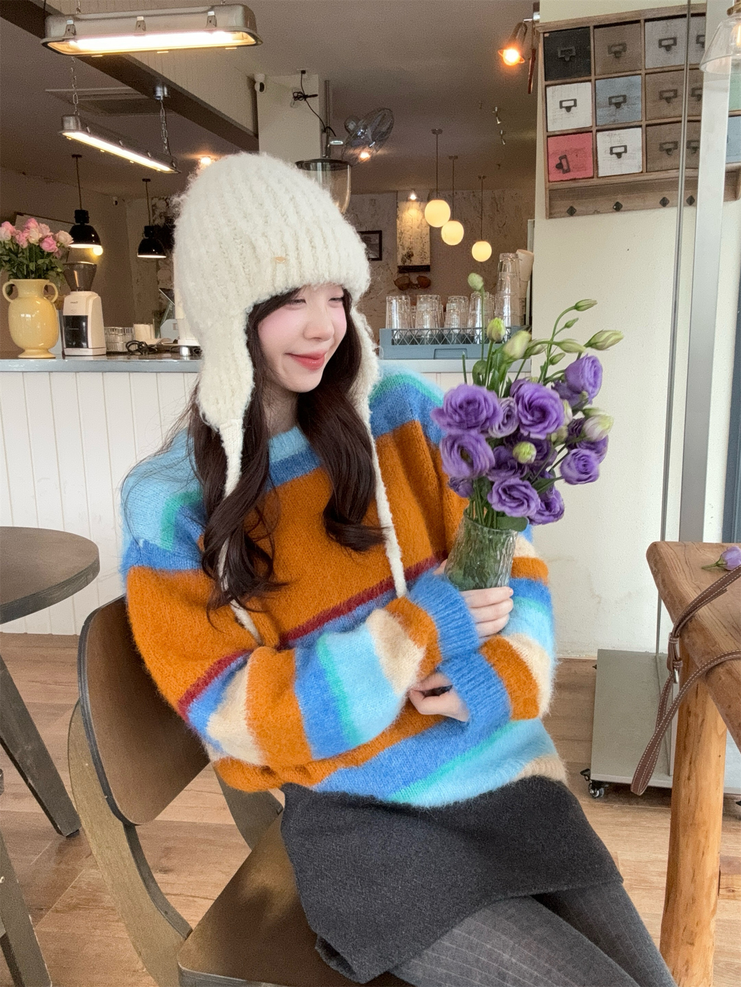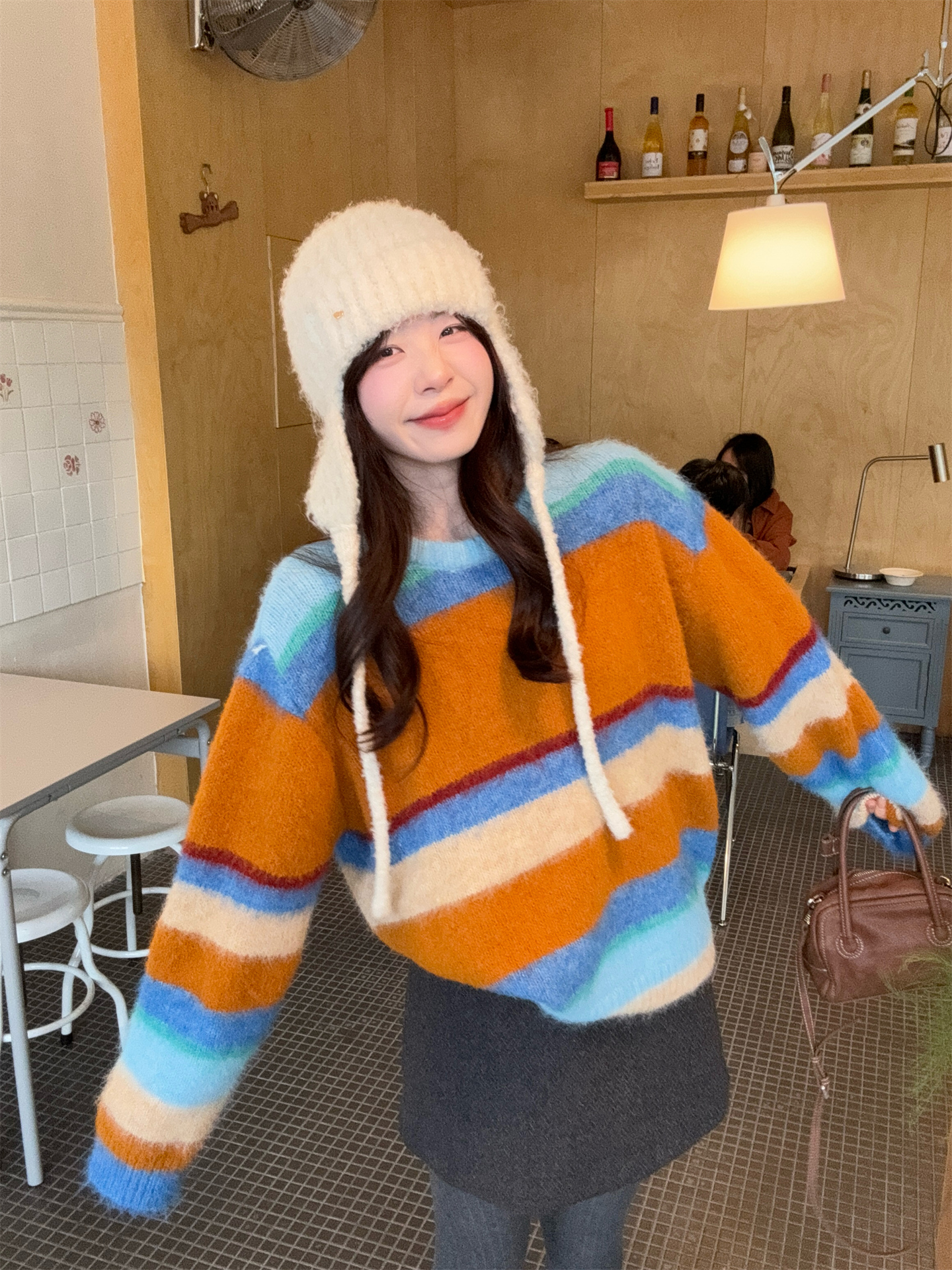 实拍 2025秋冬新款韩版拼色条纹撞色宽松长袖毛衣女宽松针织衫