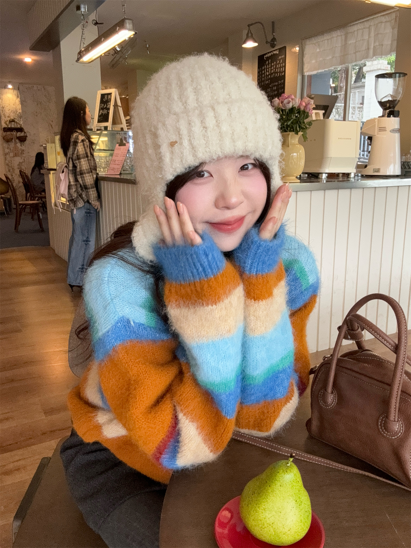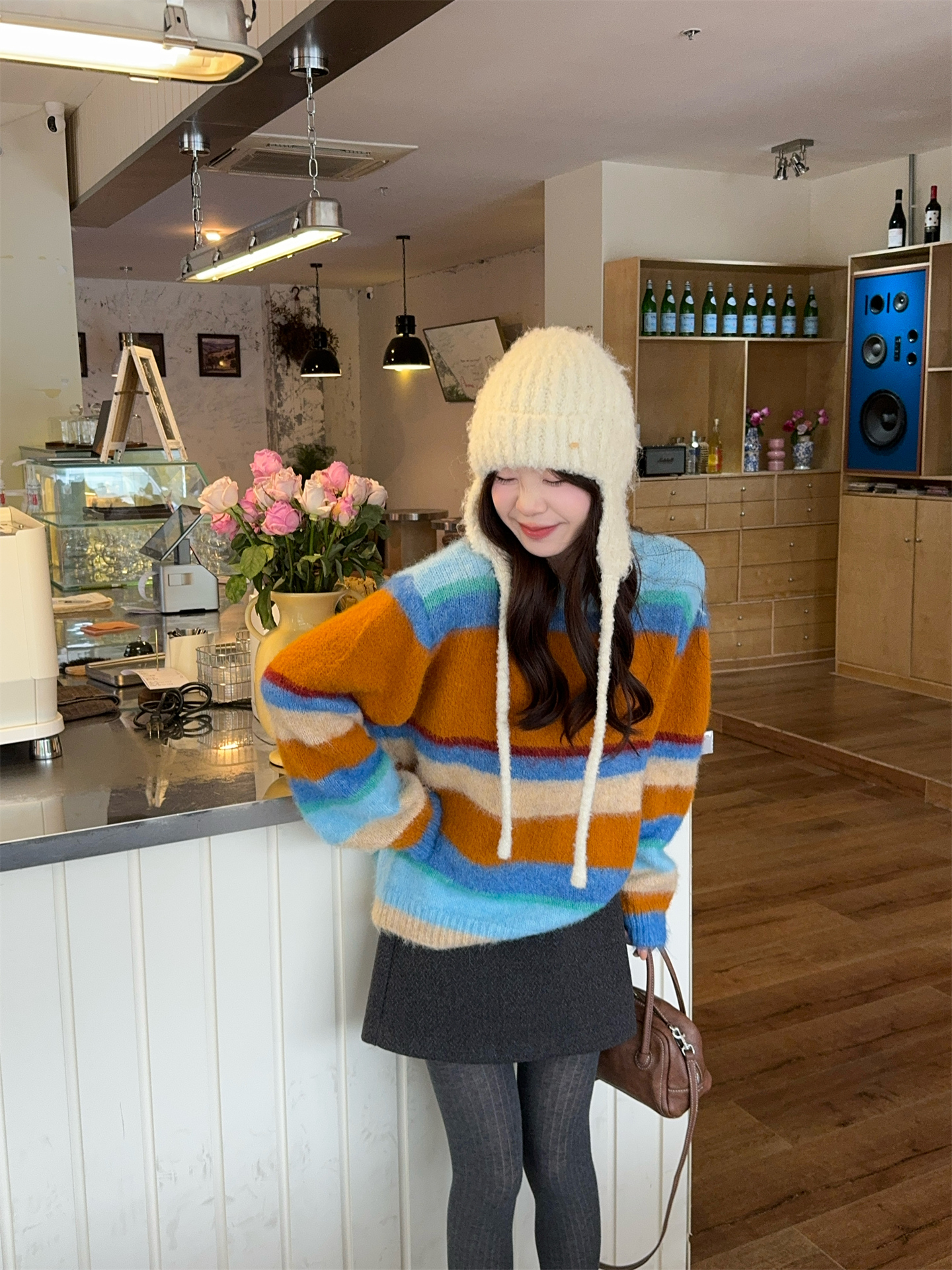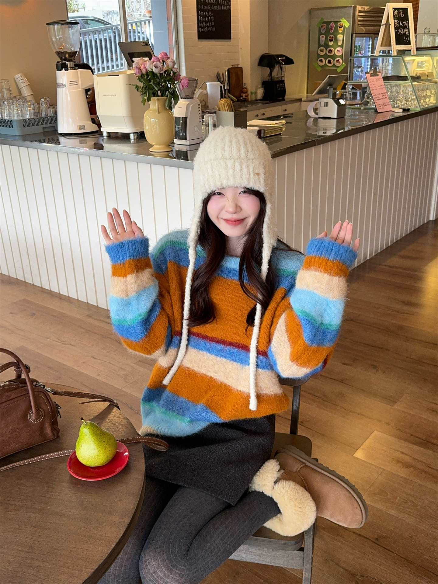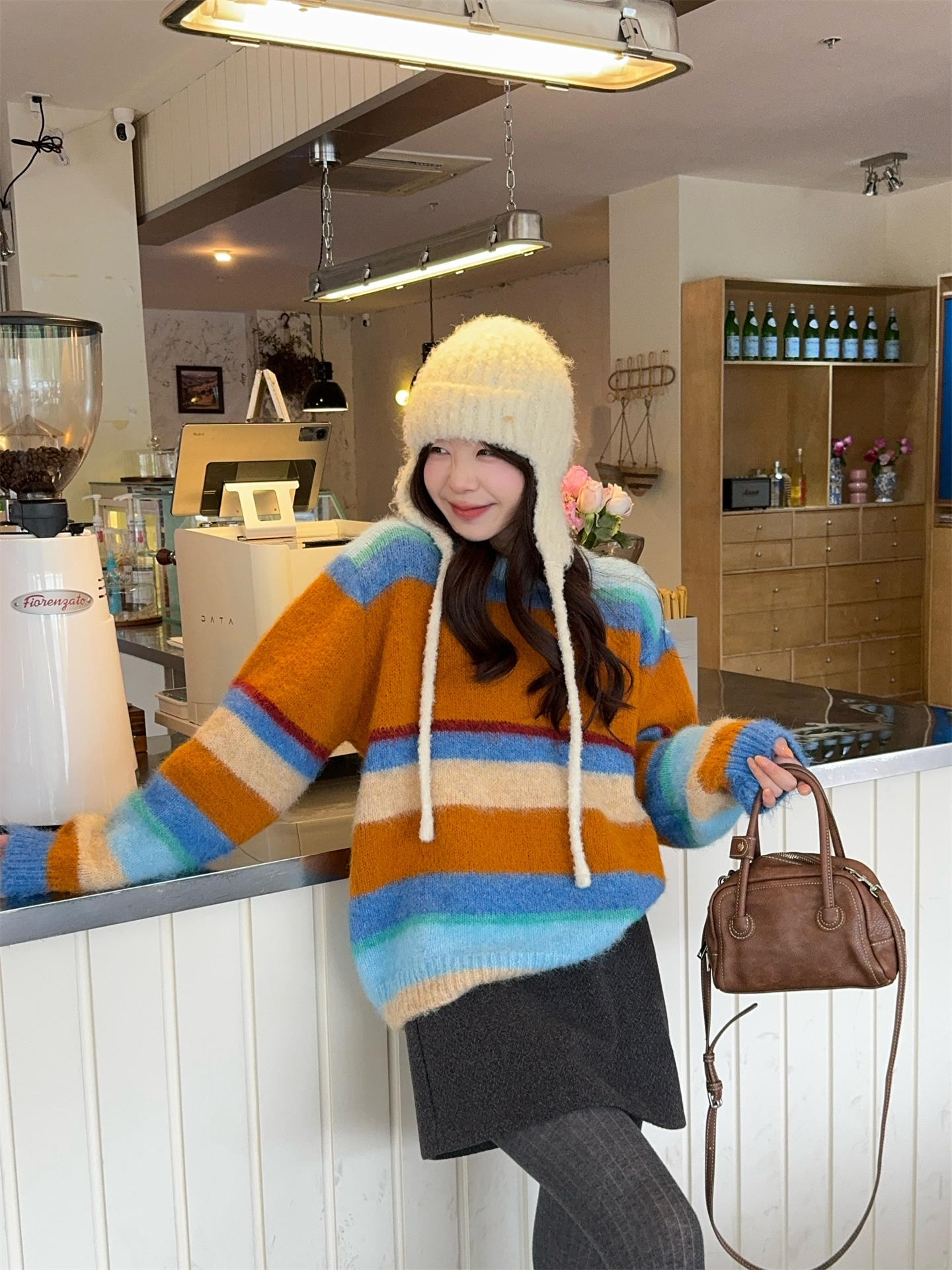 实拍 2025秋冬新款韩版拼色条纹撞色宽松长袖毛衣女宽松针织衫