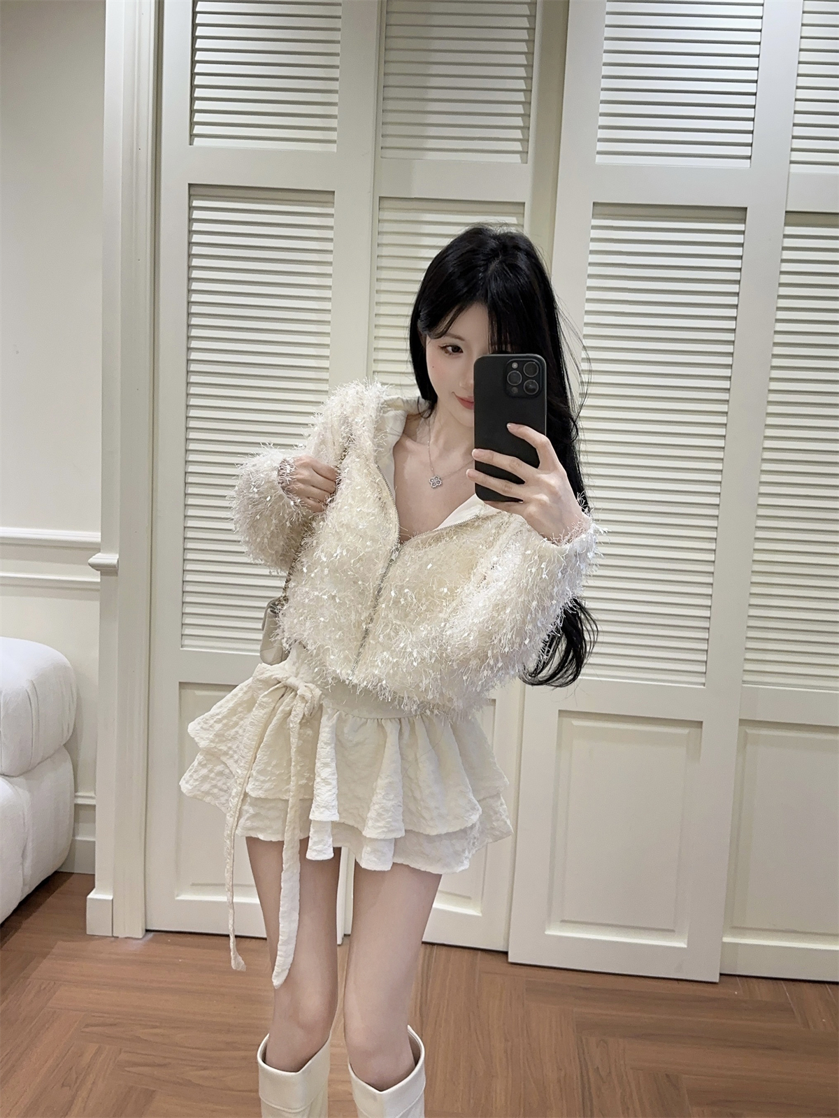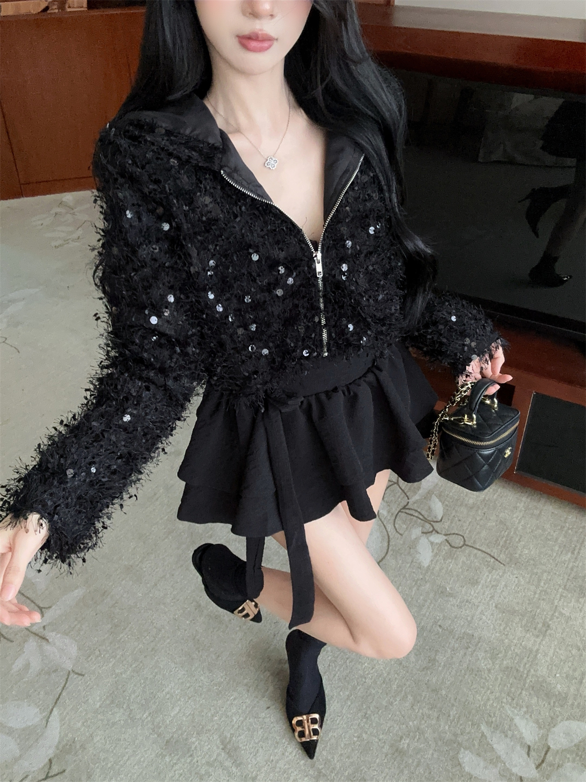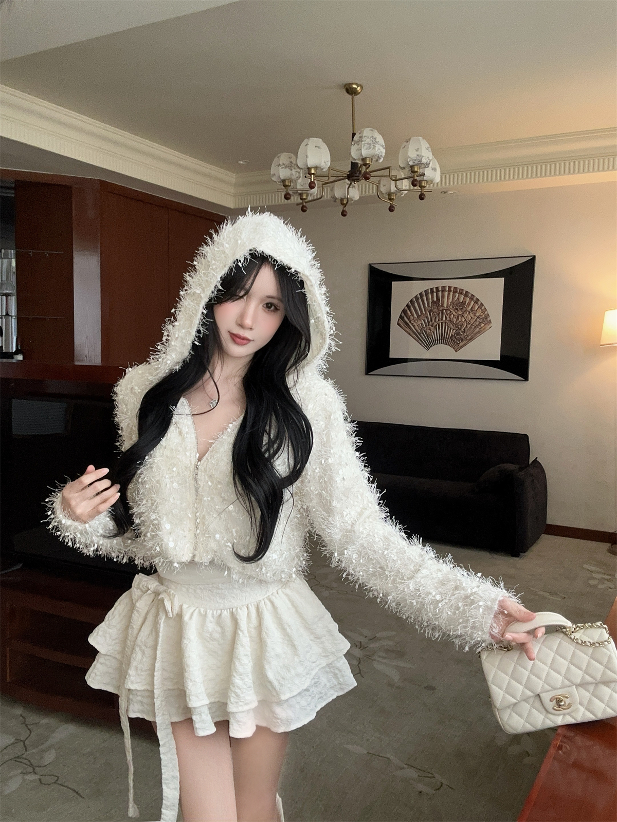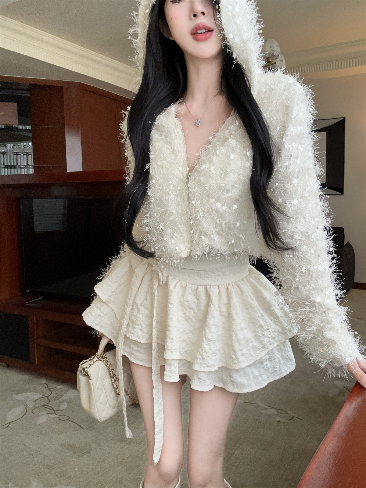 实拍实价 甜美毛毛绒亮片连帽短外套荷叶边裙裤时尚套装女冬