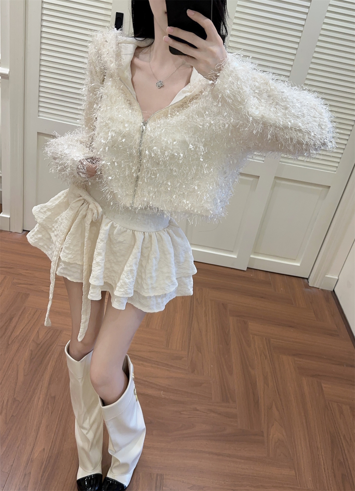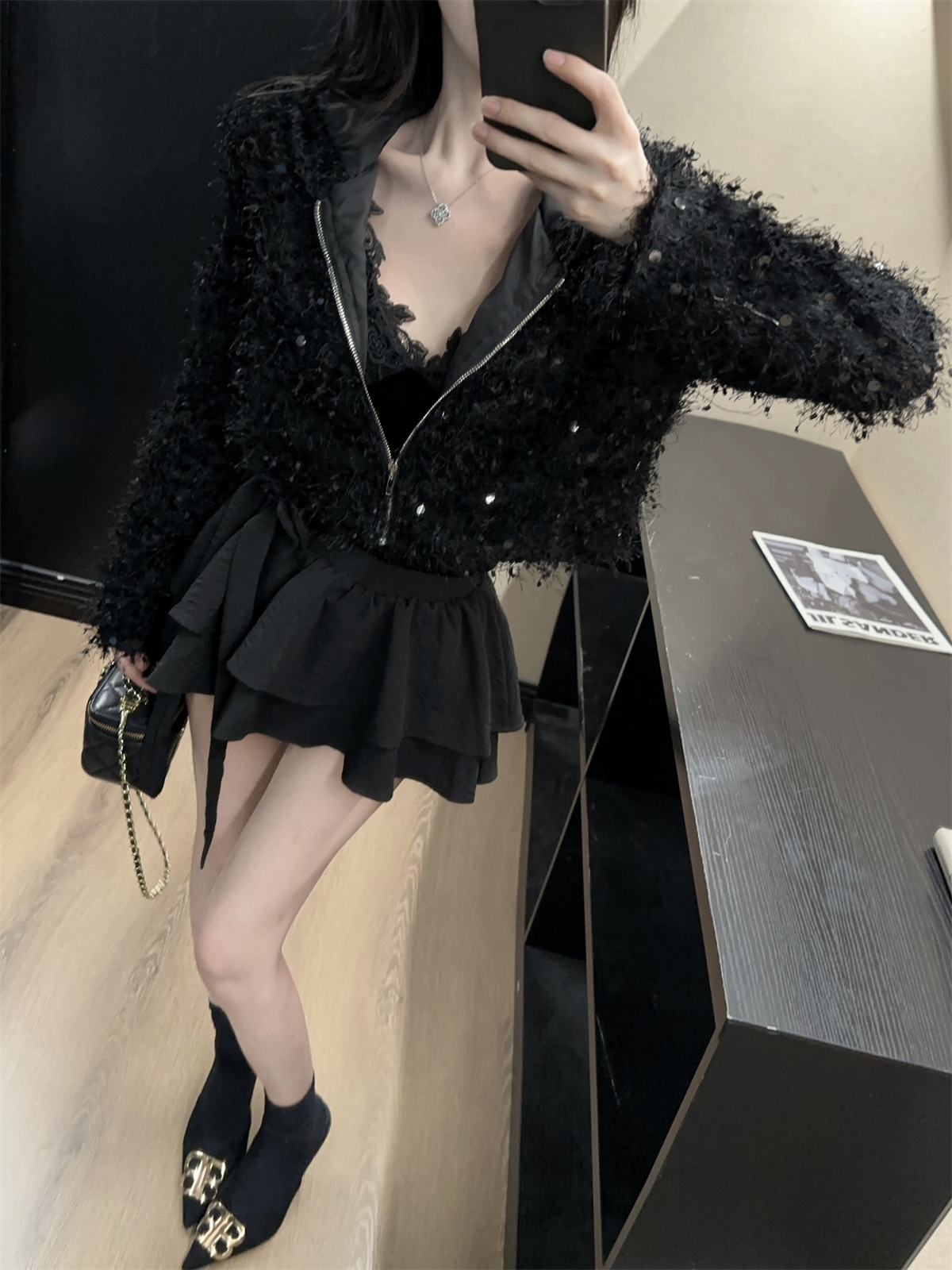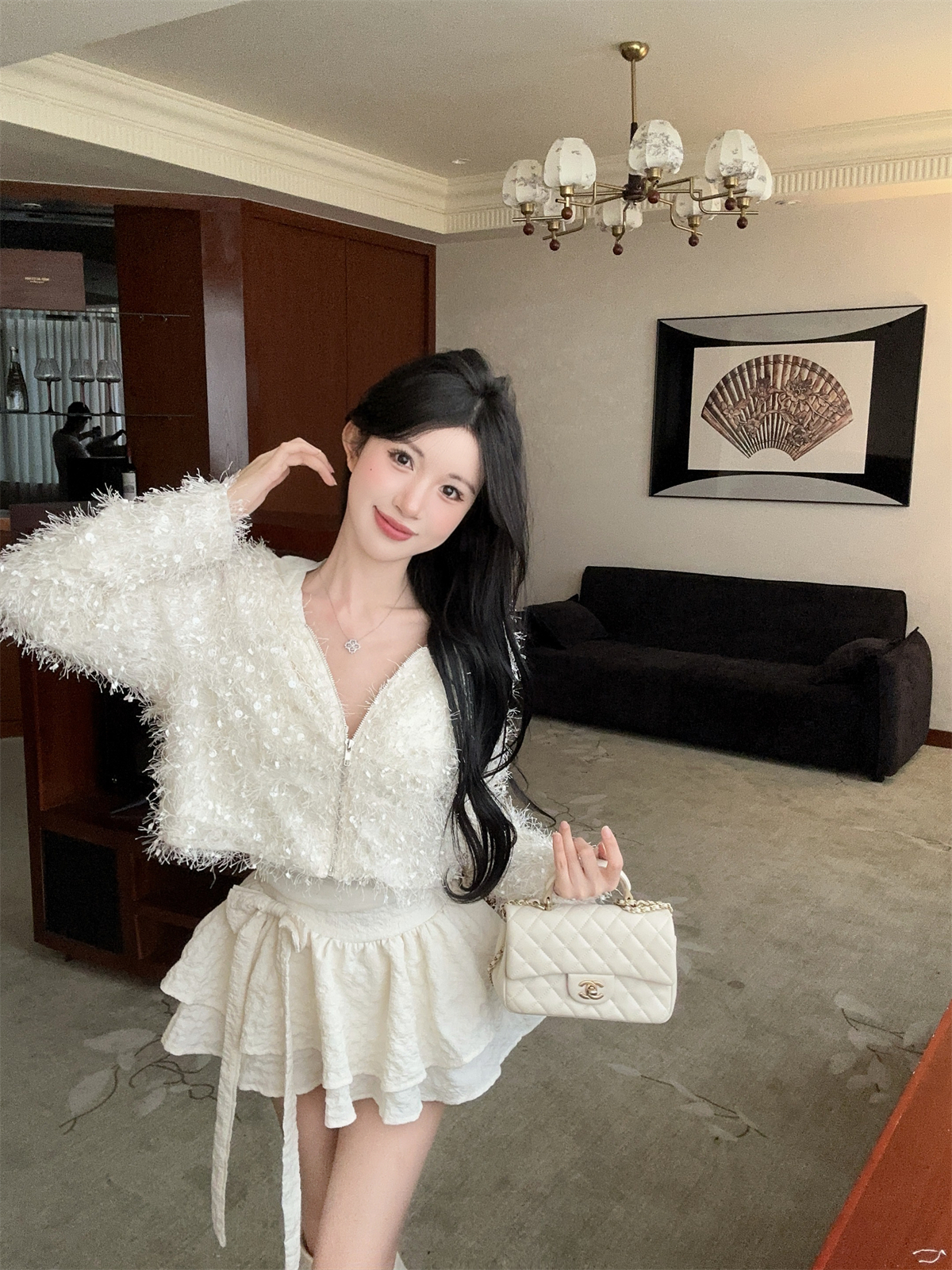 实拍实价 甜美毛毛绒亮片连帽短外套荷叶边裙裤时尚套装女冬
