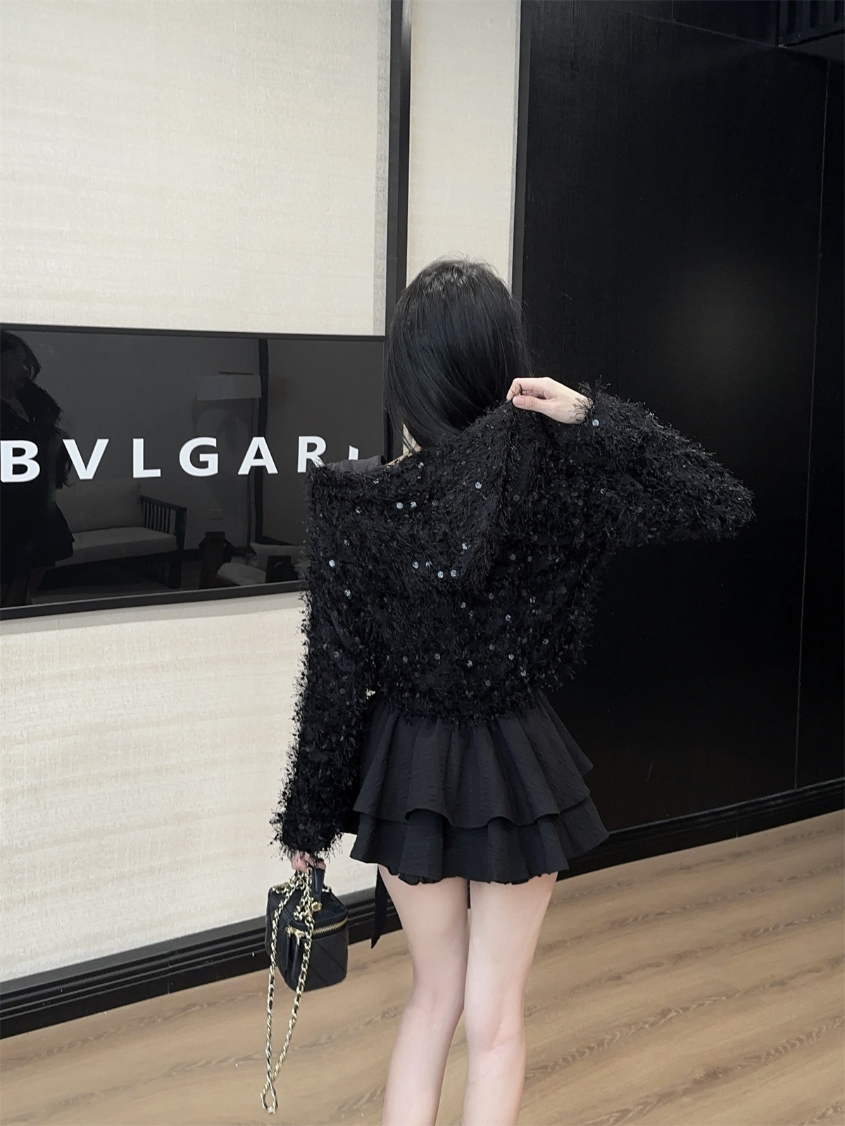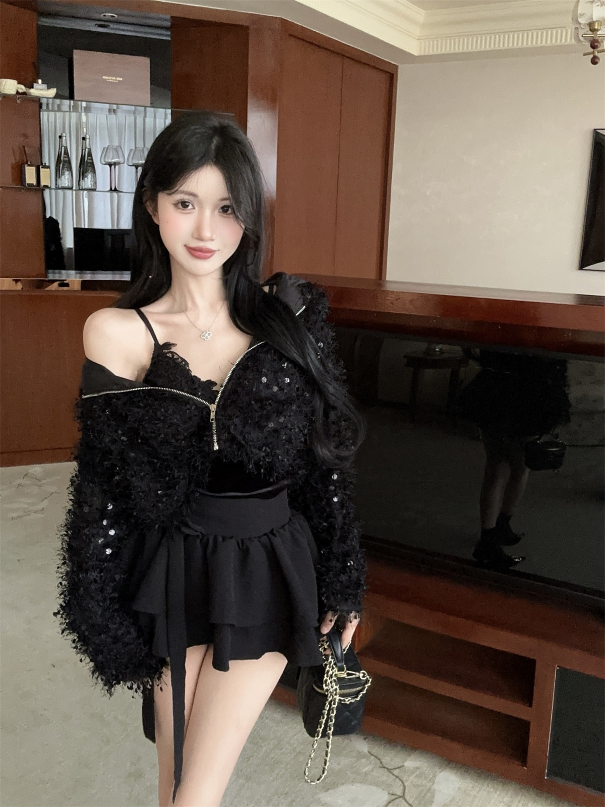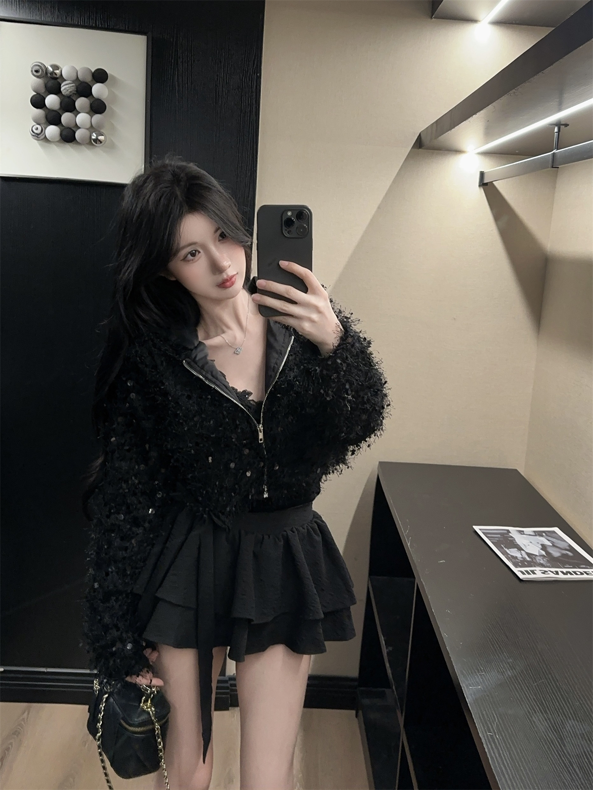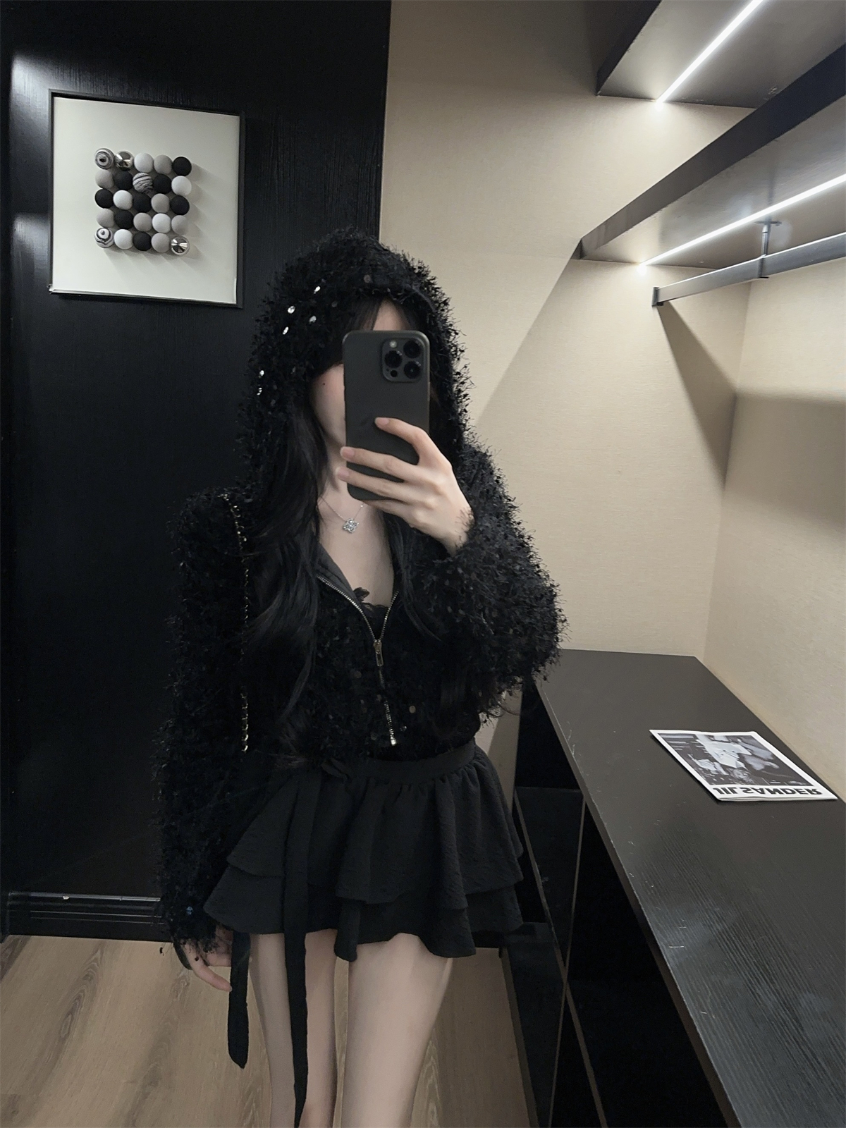 实拍实价 甜美毛毛绒亮片连帽短外套荷叶边裙裤时尚套装女冬