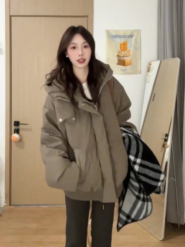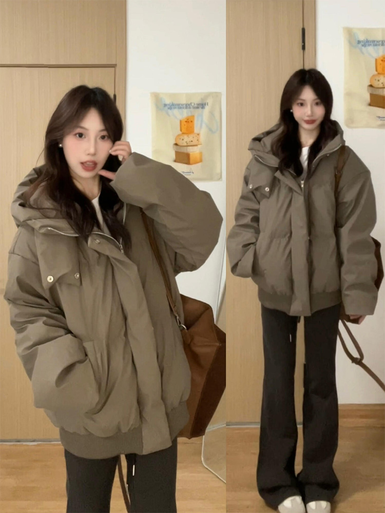 咖色连帽棉衣棉服外套女2024年新款冬季韩系穿搭美式复古棉袄外套