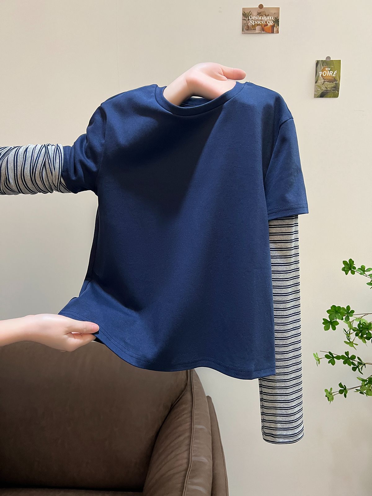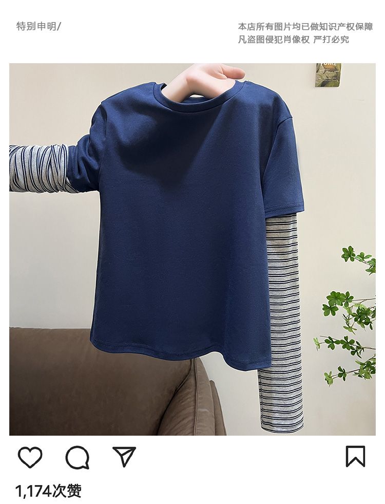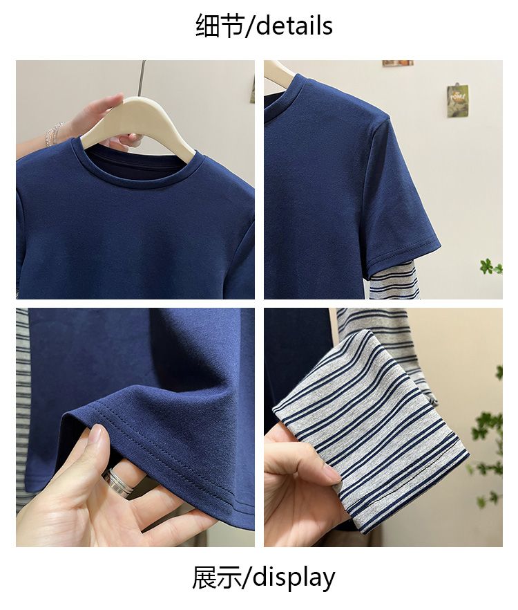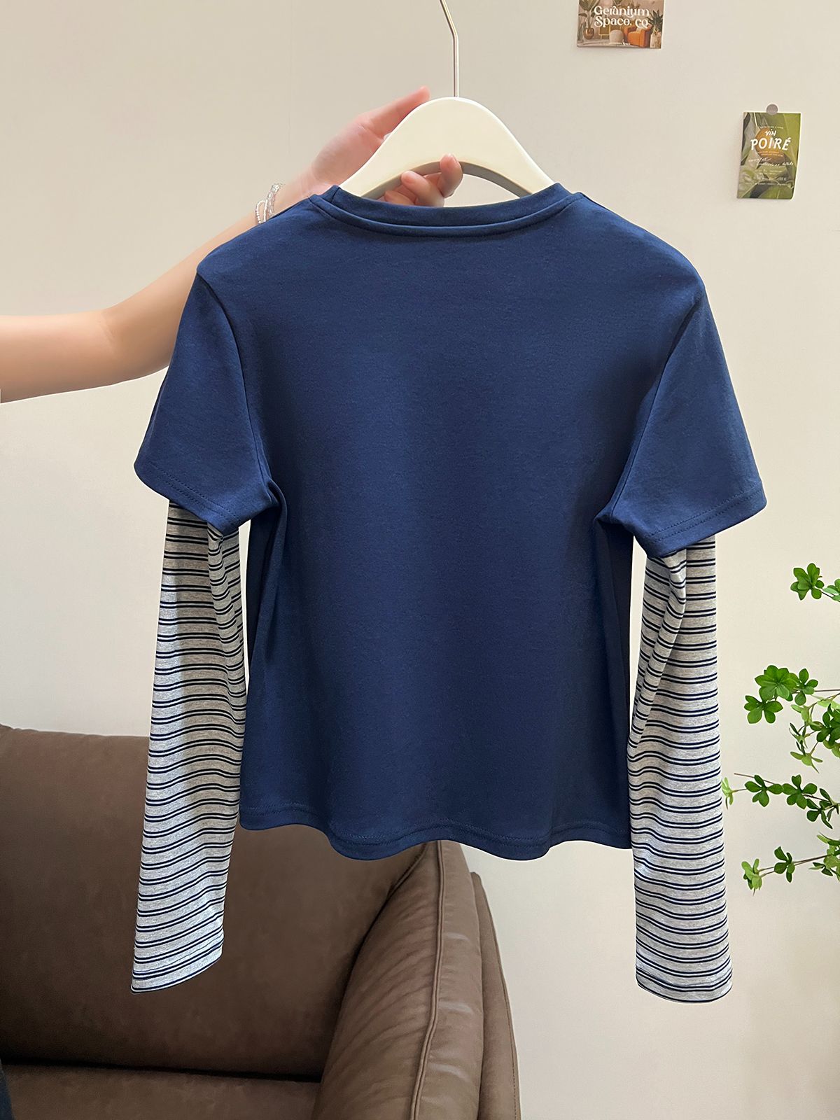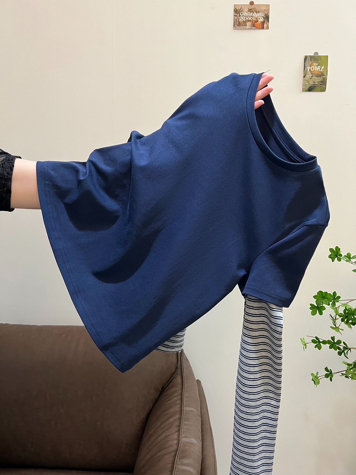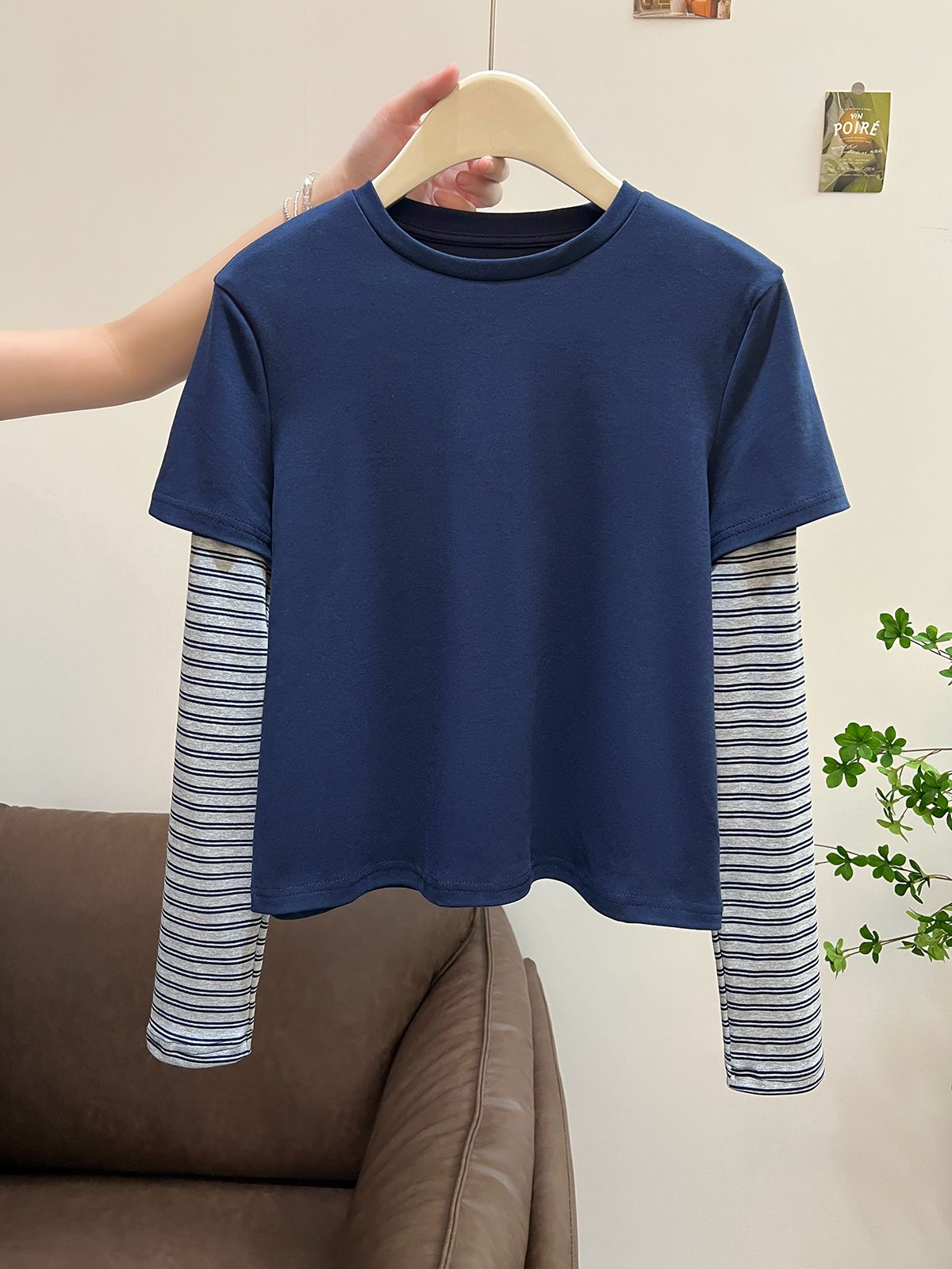 实拍 40支220克93棉1*1小个子短款假两件条纹长袖t恤女秋季上衣