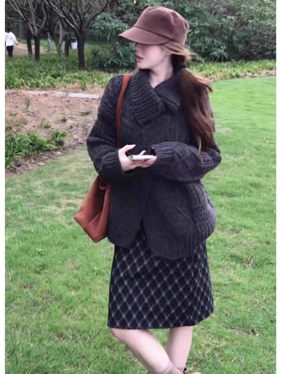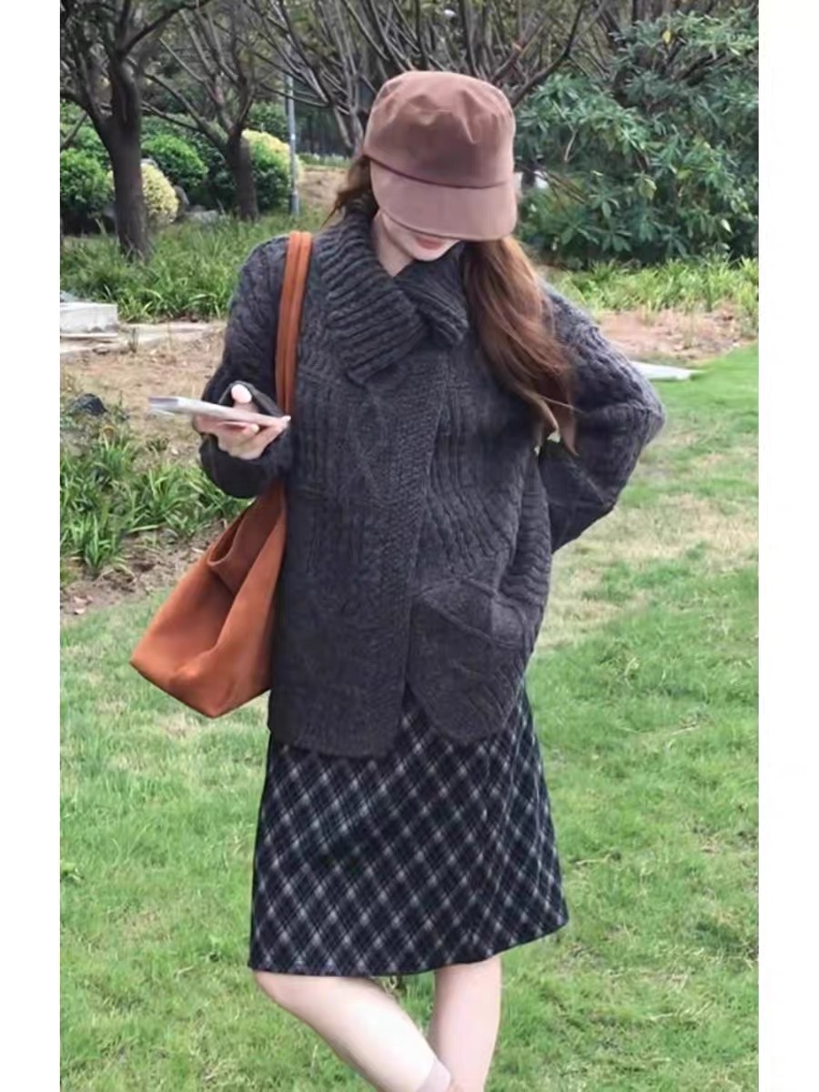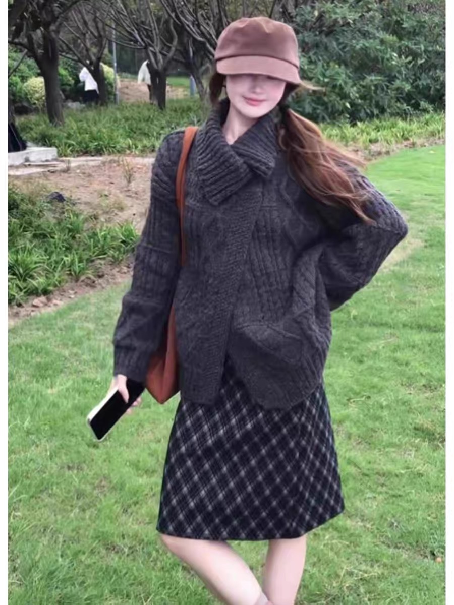 法式翻领软糯麻花毛衣开衫女秋冬加厚宽松慵懒风外搭针织外套上衣