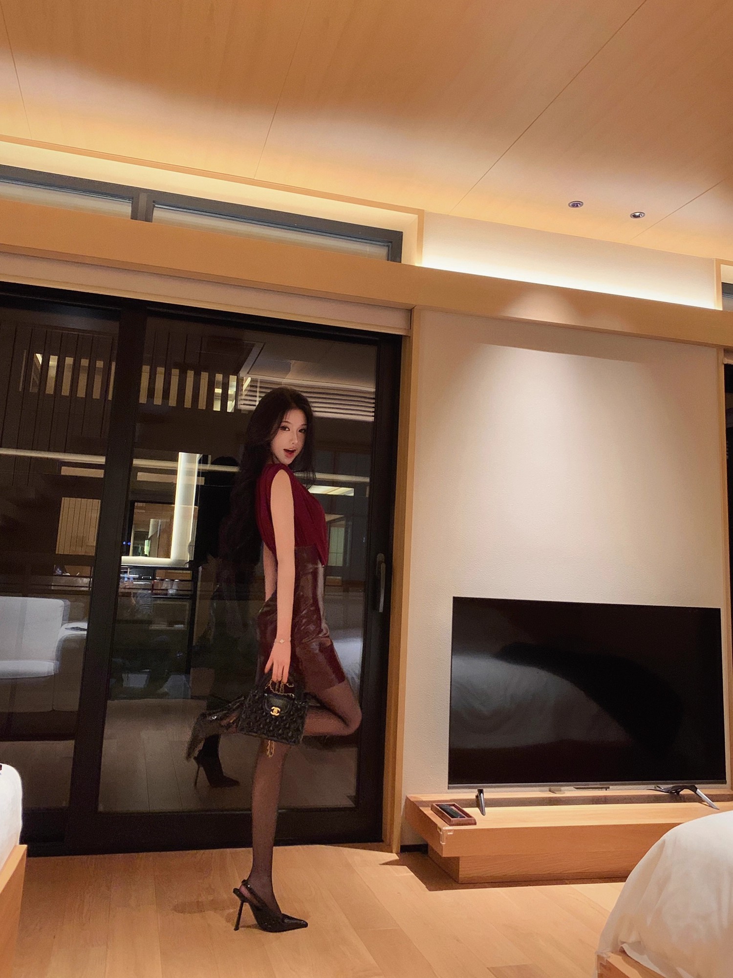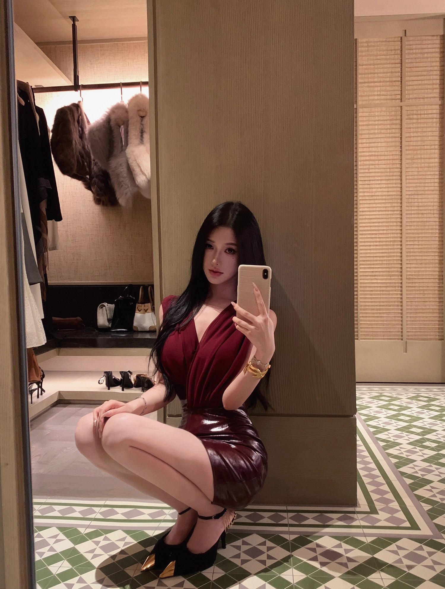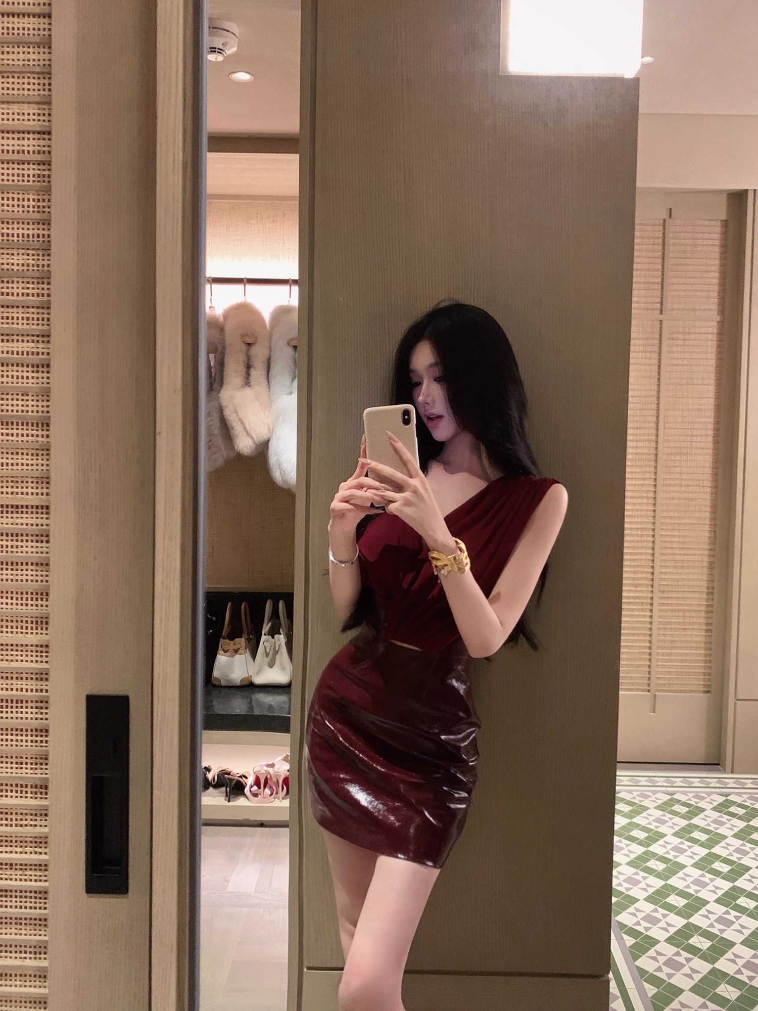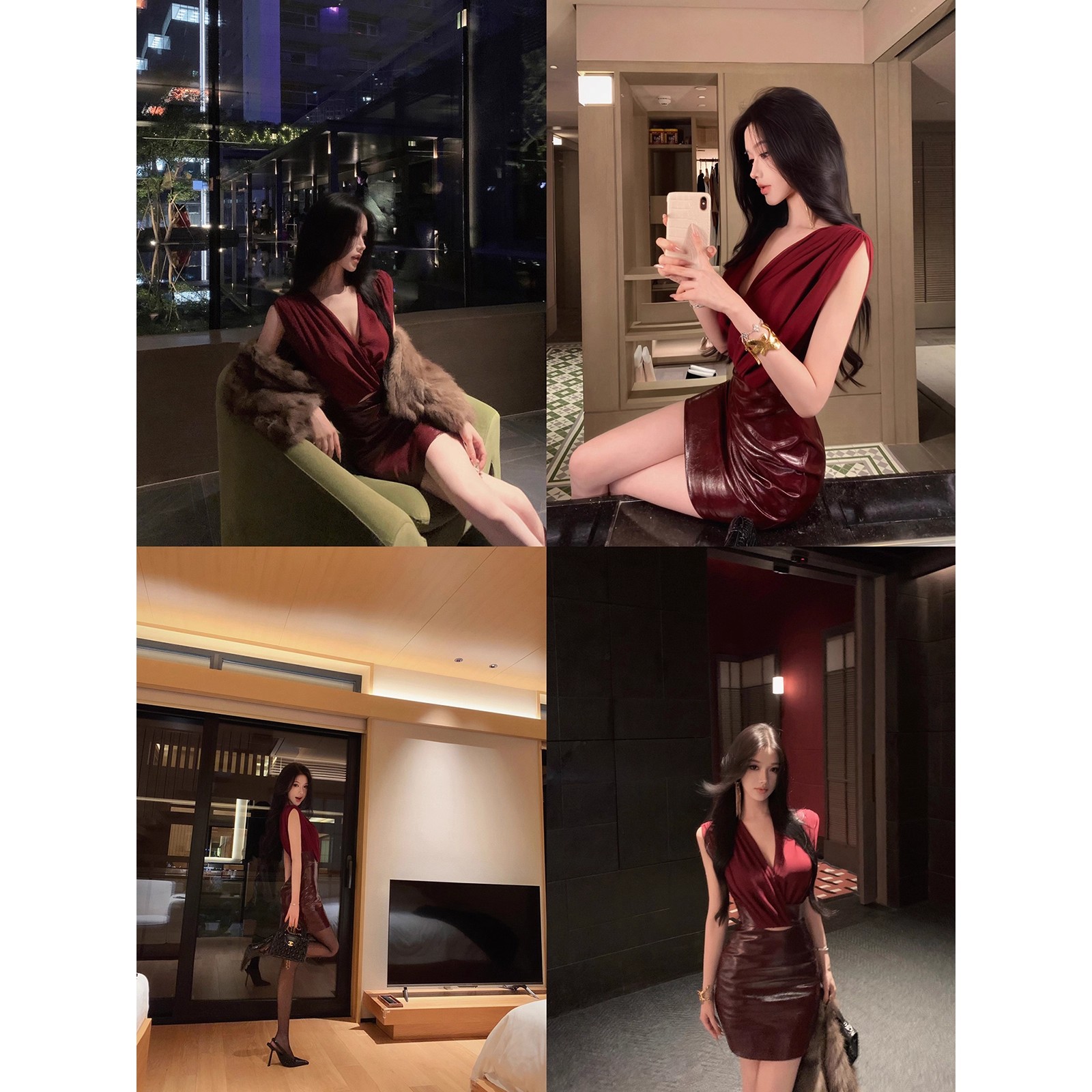 JAYKY YANG 红色V领皮革裙