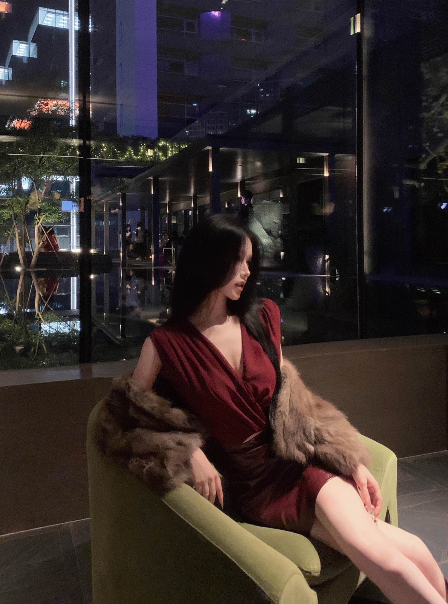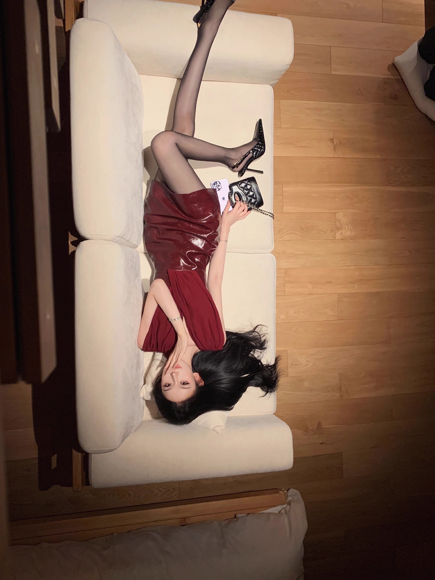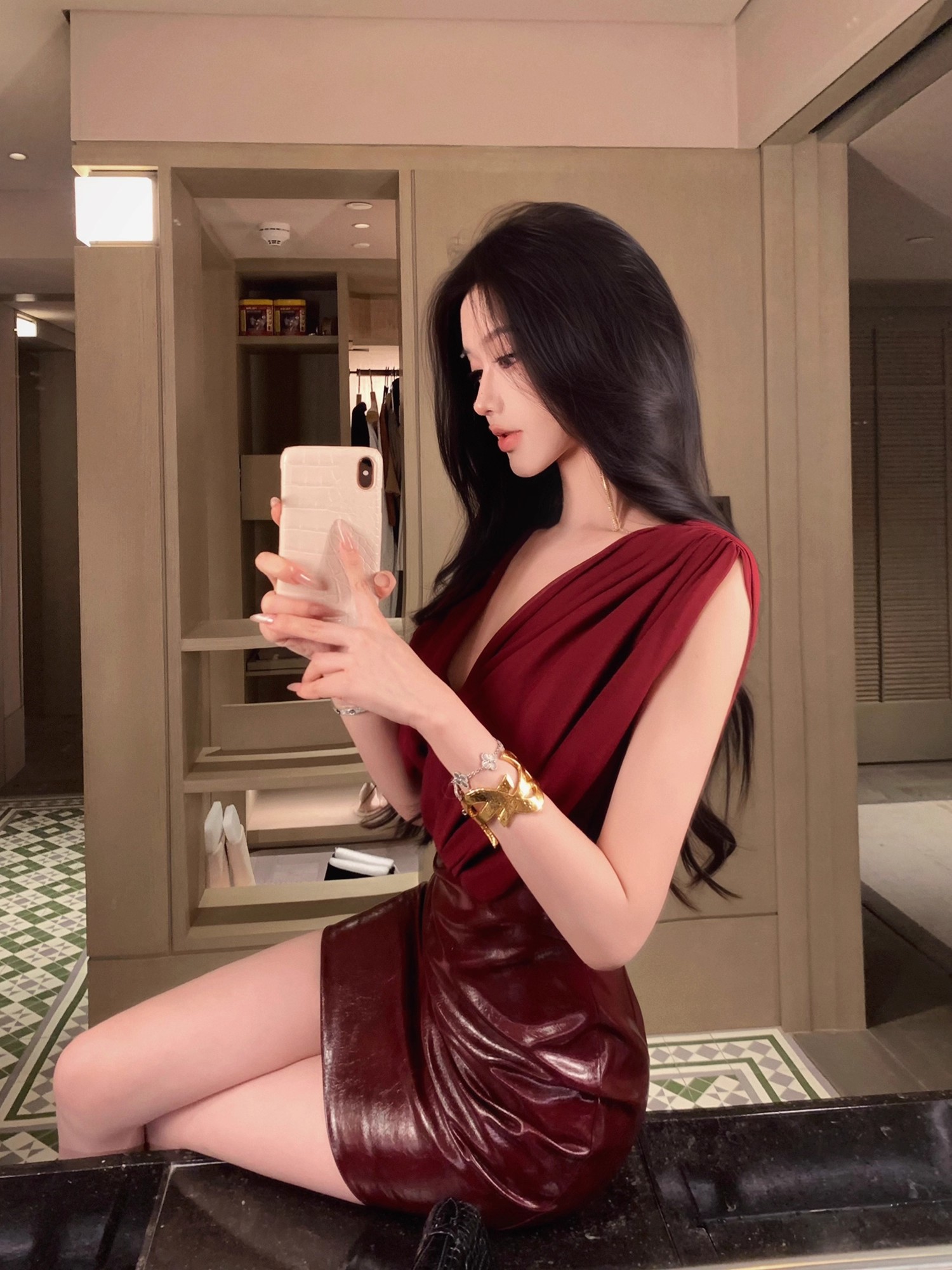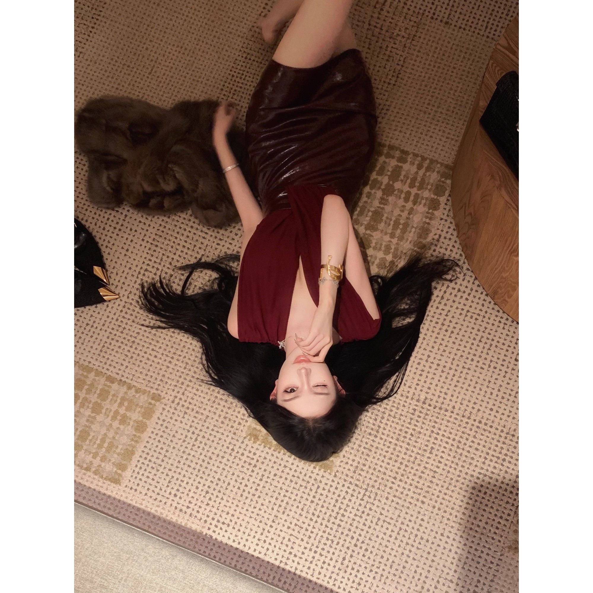 JAYKY YANG 红色V领皮革裙