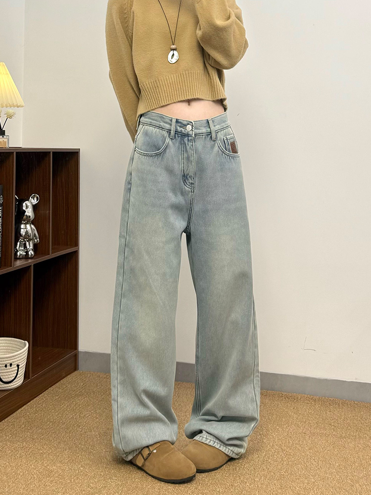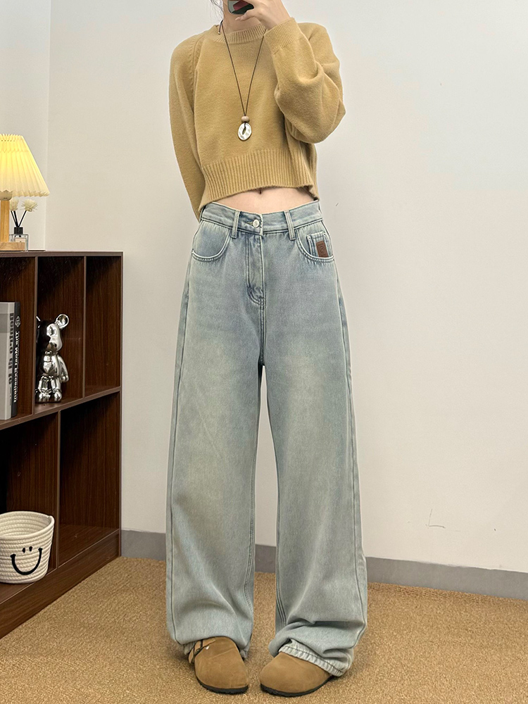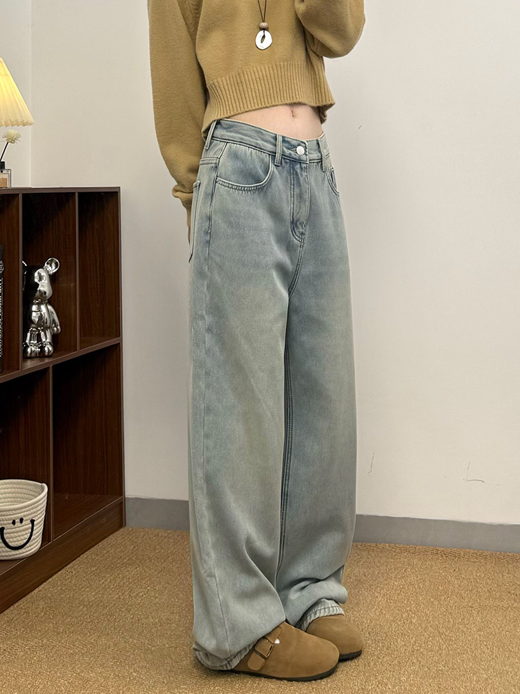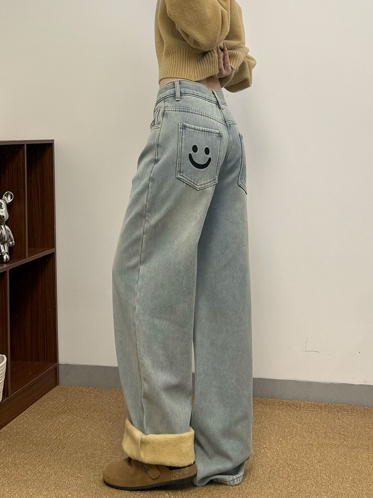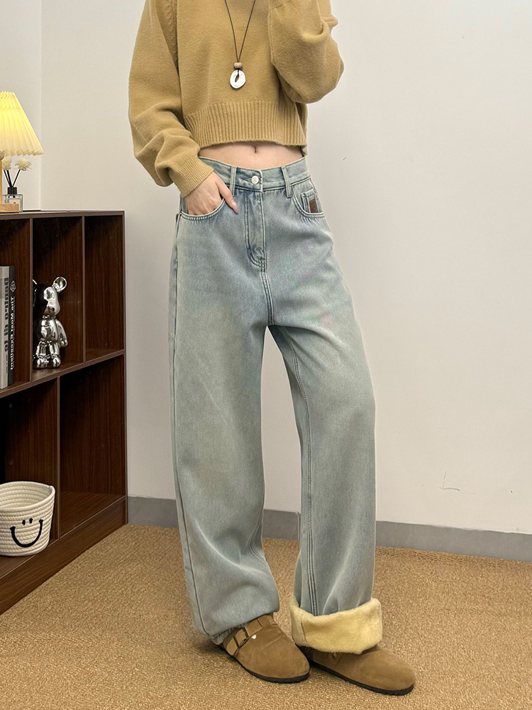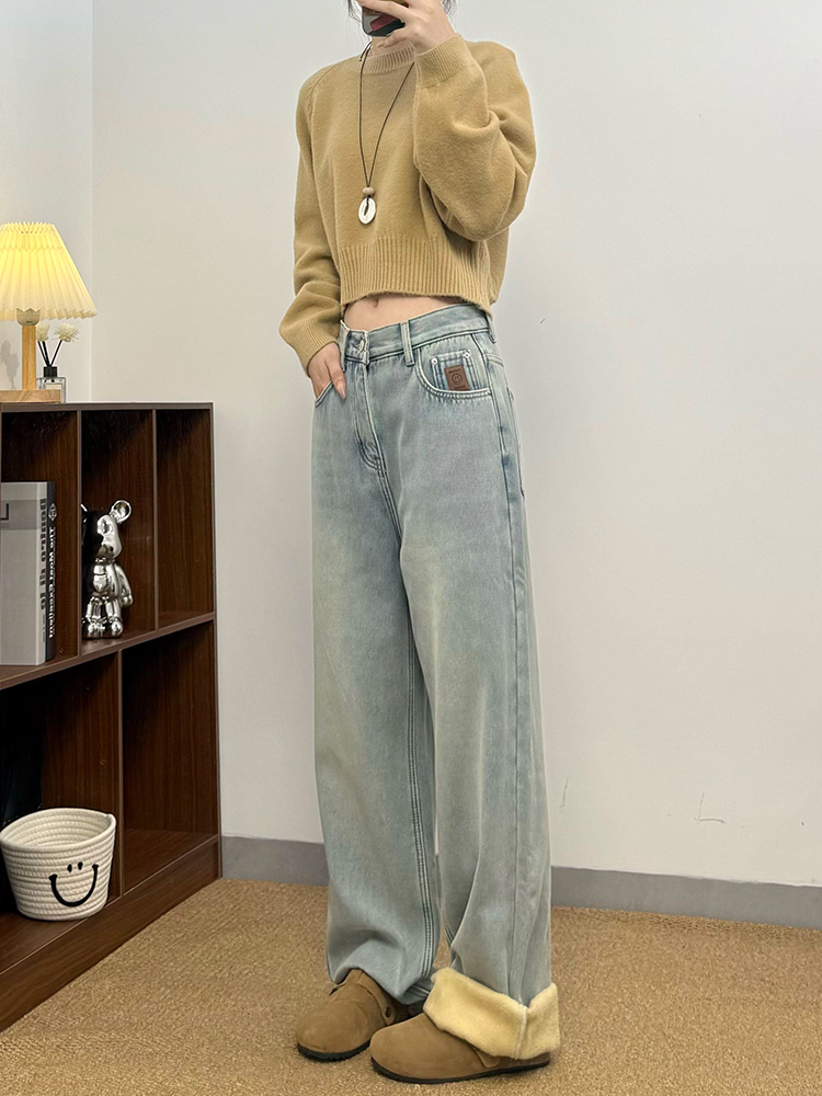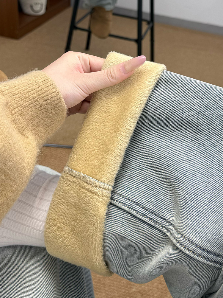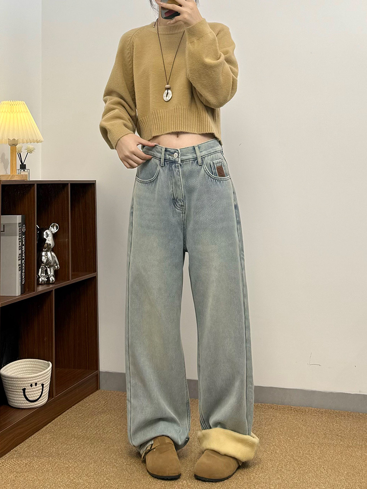 实拍~~加绒加厚牛仔裤女秋冬装新款时尚复古侧压线直筒阔腿裤