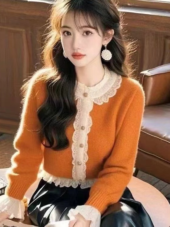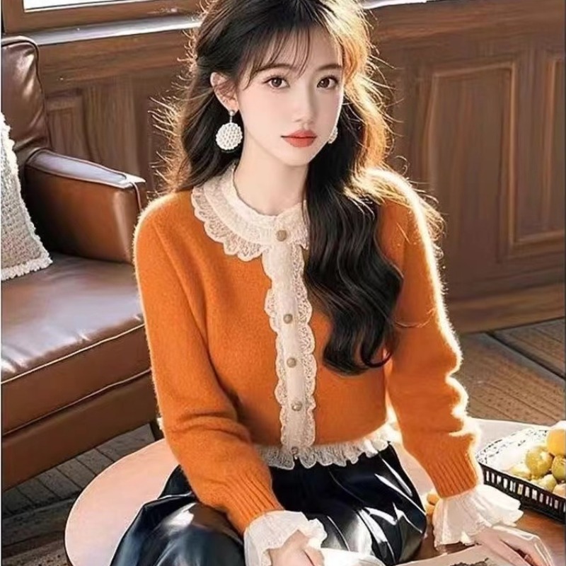 新品今年流行高级感花边拼接超好看减龄显白橙色漂亮毛衣春秋冬