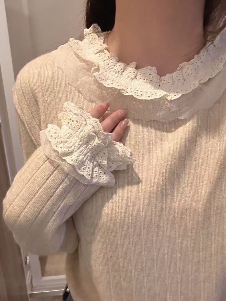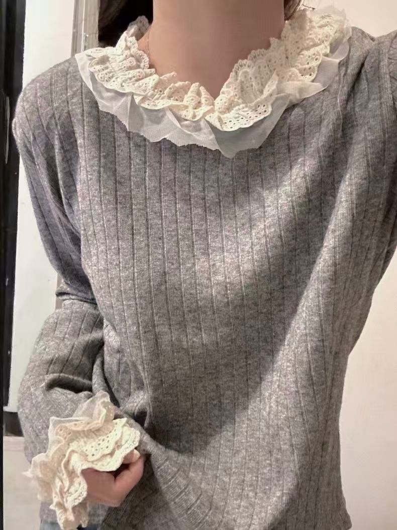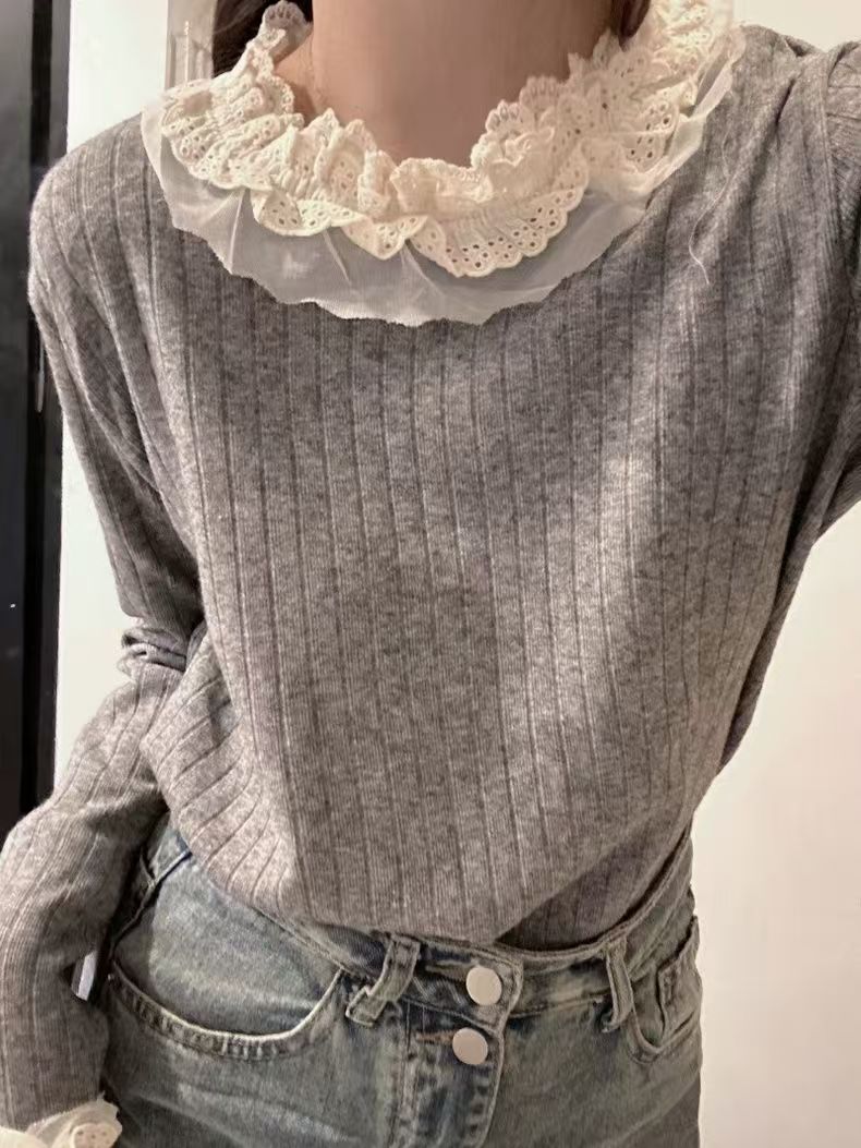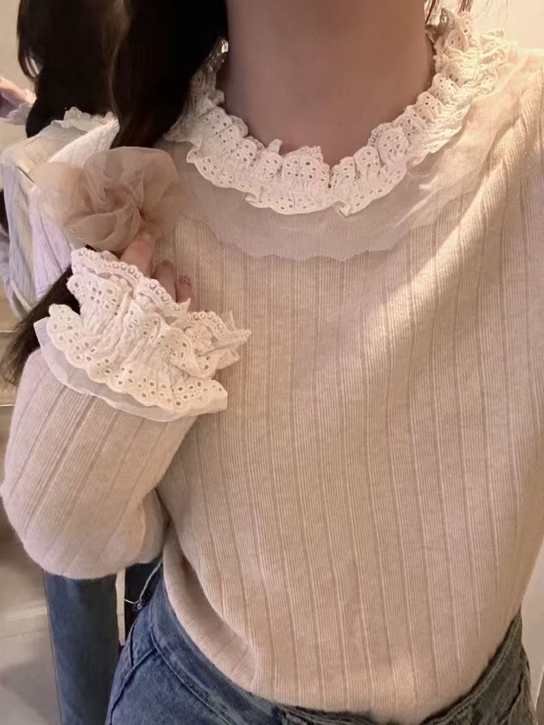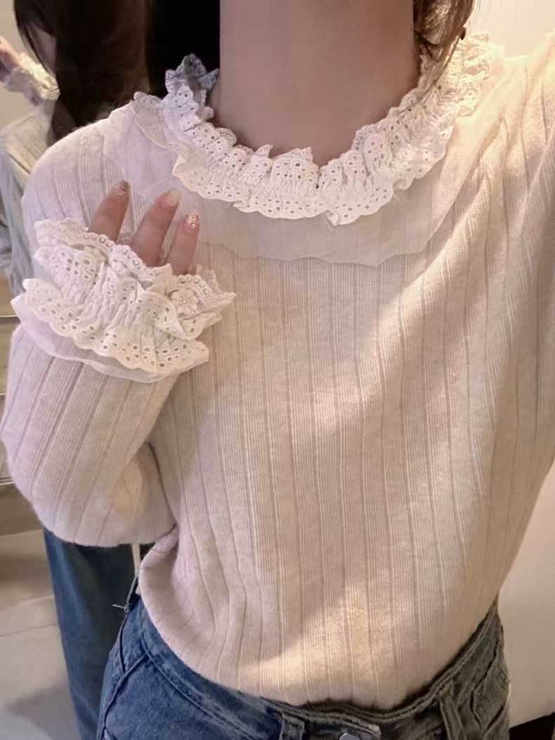 蕾丝花边拼接坑条长袖新款显瘦百搭打底上衣女