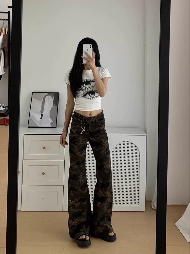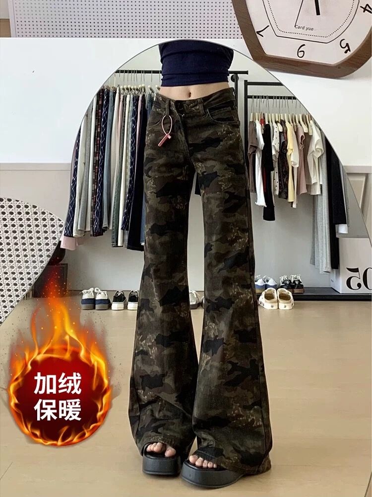秋冬季加绒加厚美式复古迷彩工装微喇牛仔裤女低腰不贴腿喇叭裤子