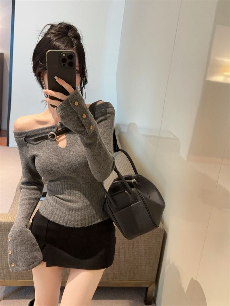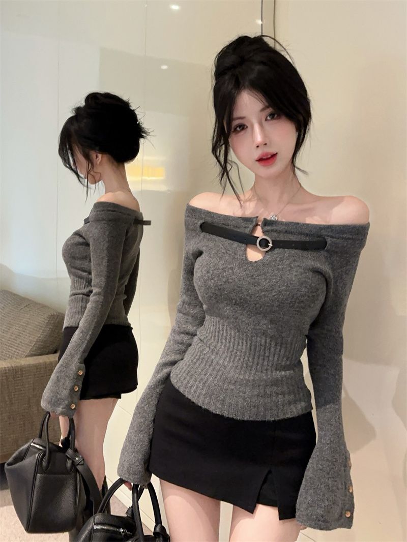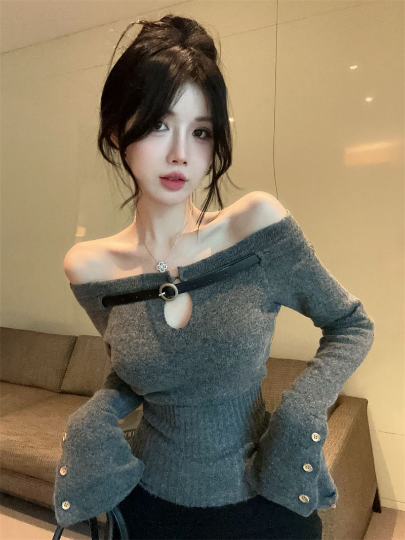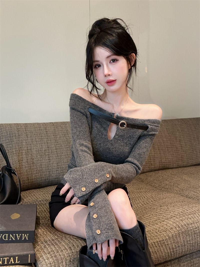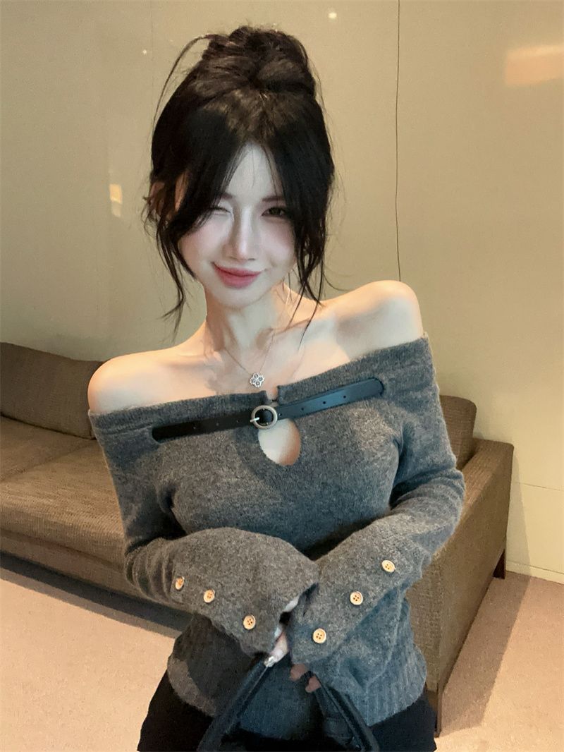 辣妹纯欲一字肩镂空针织上衣女秋冬设计感内搭打底衫洋气显瘦毛衣