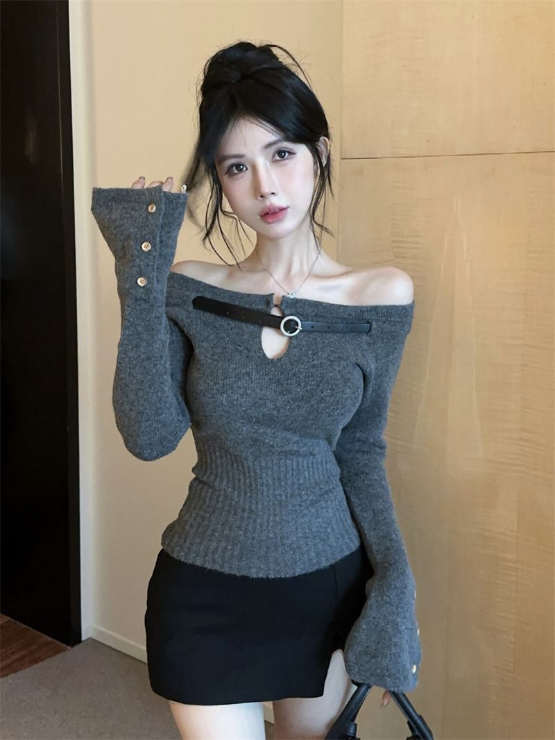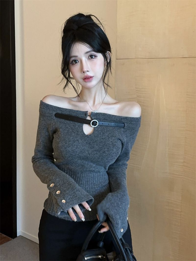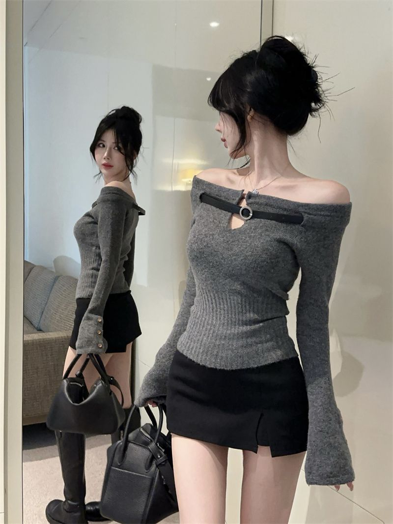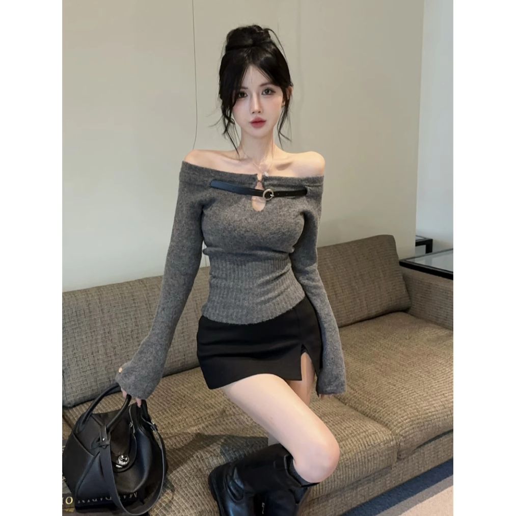辣妹纯欲一字肩镂空针织上衣女秋冬设计感内搭打底衫洋气显瘦毛衣