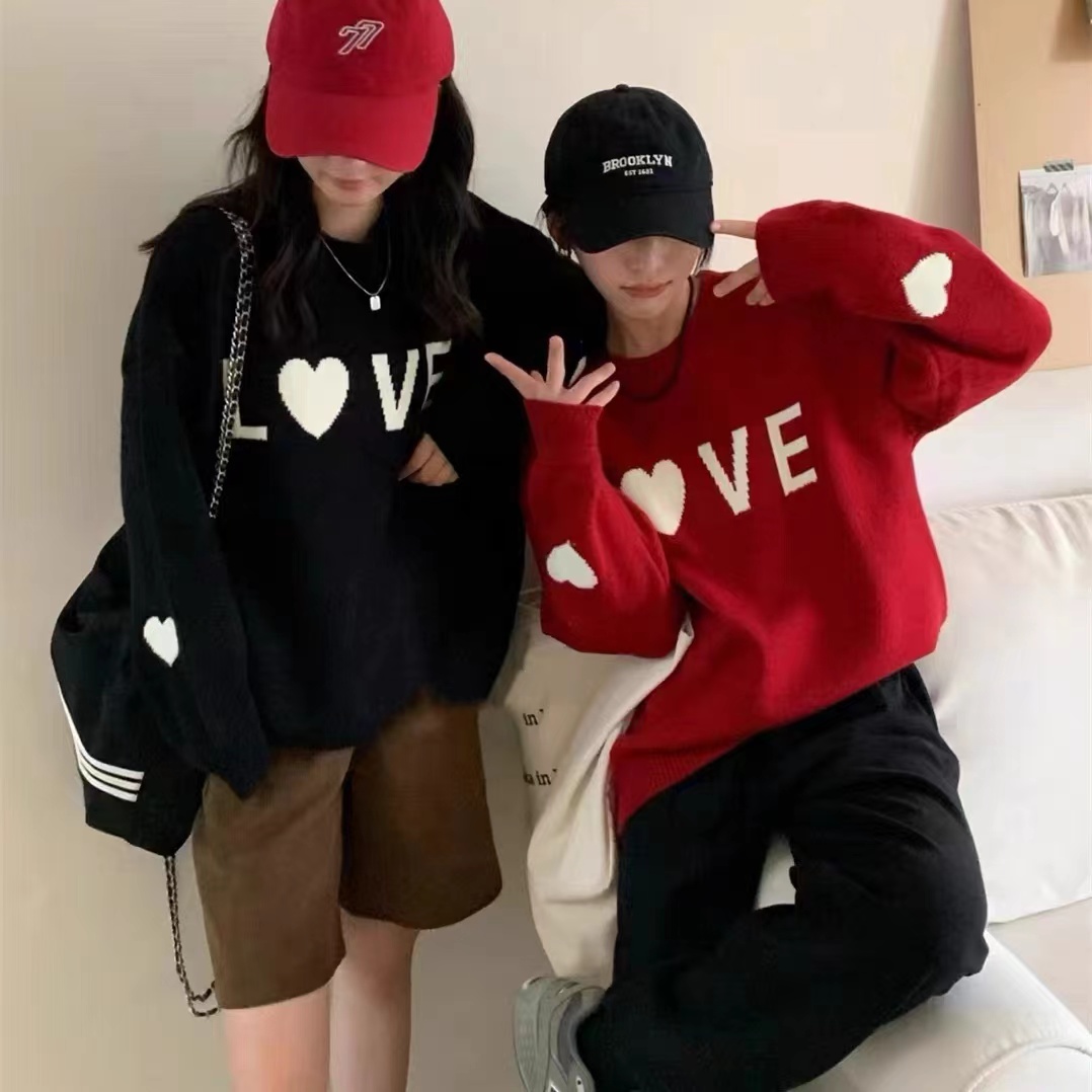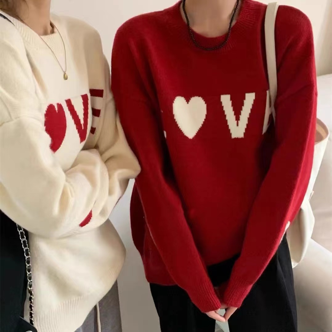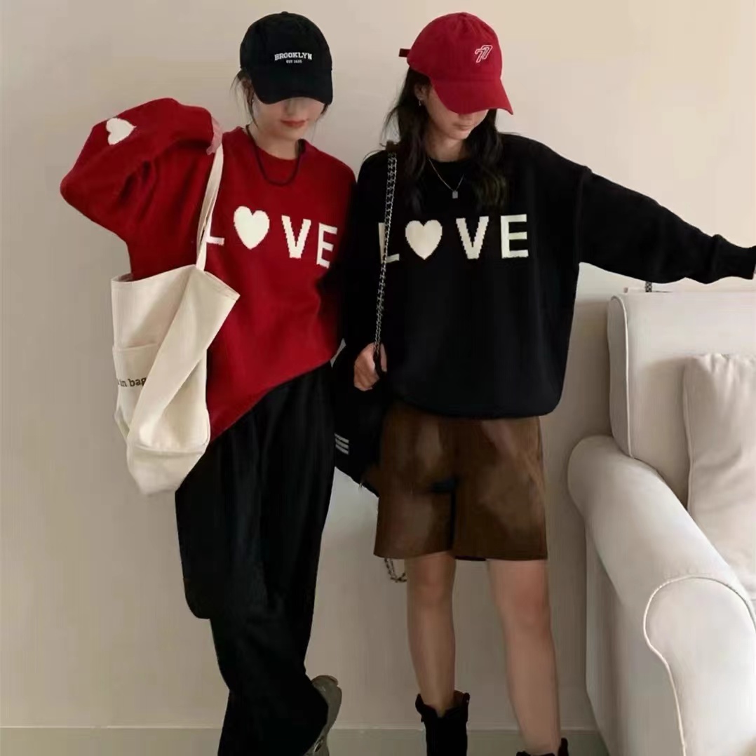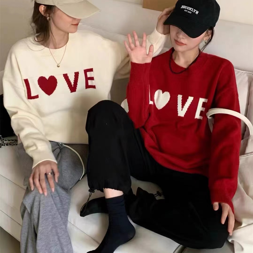 韩版爱心字母刺绣圆领套头毛衣女秋冬新款宽松甜美百搭针织衫上衣