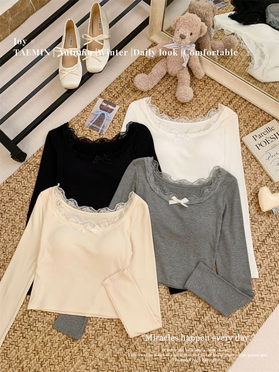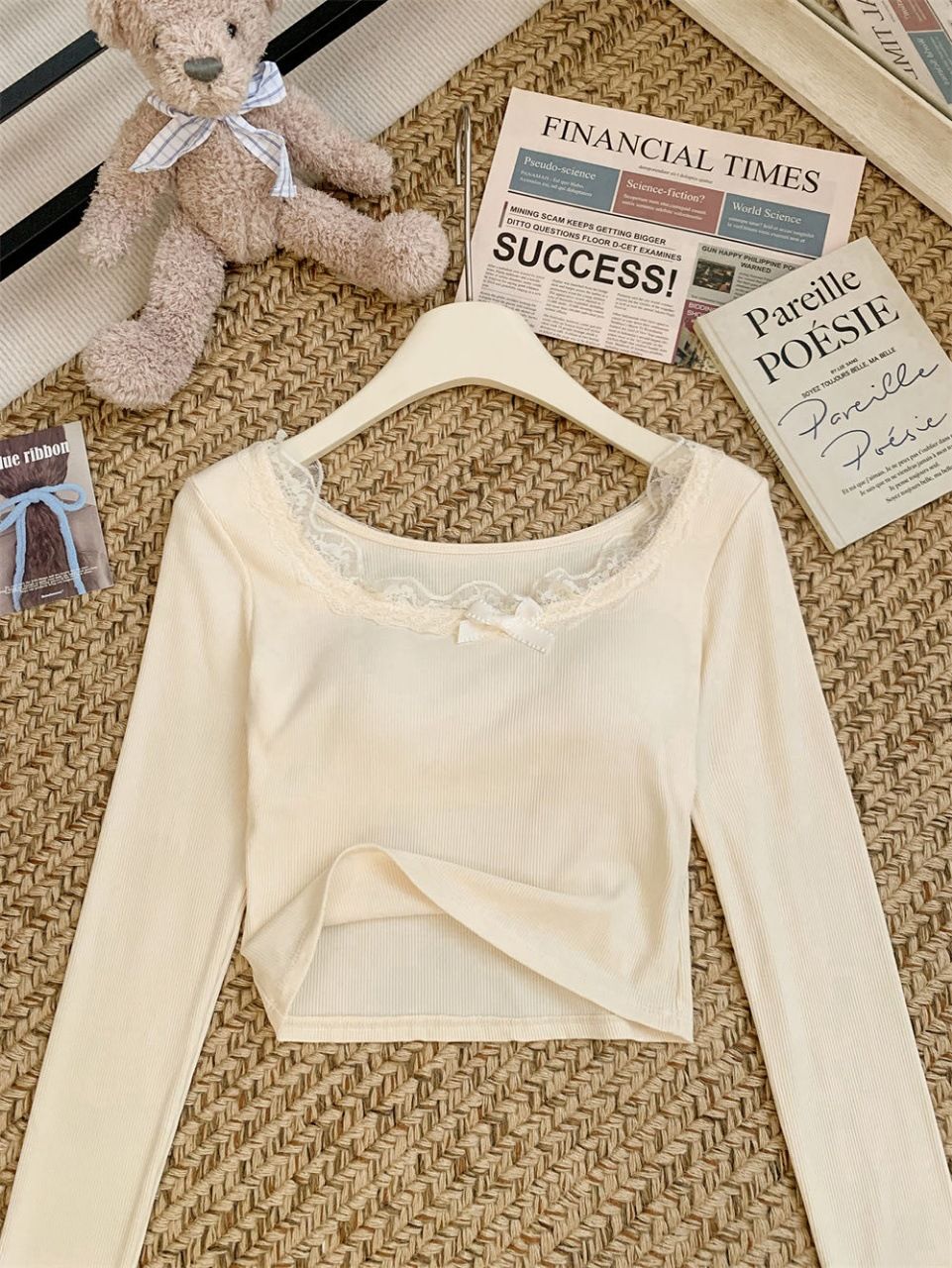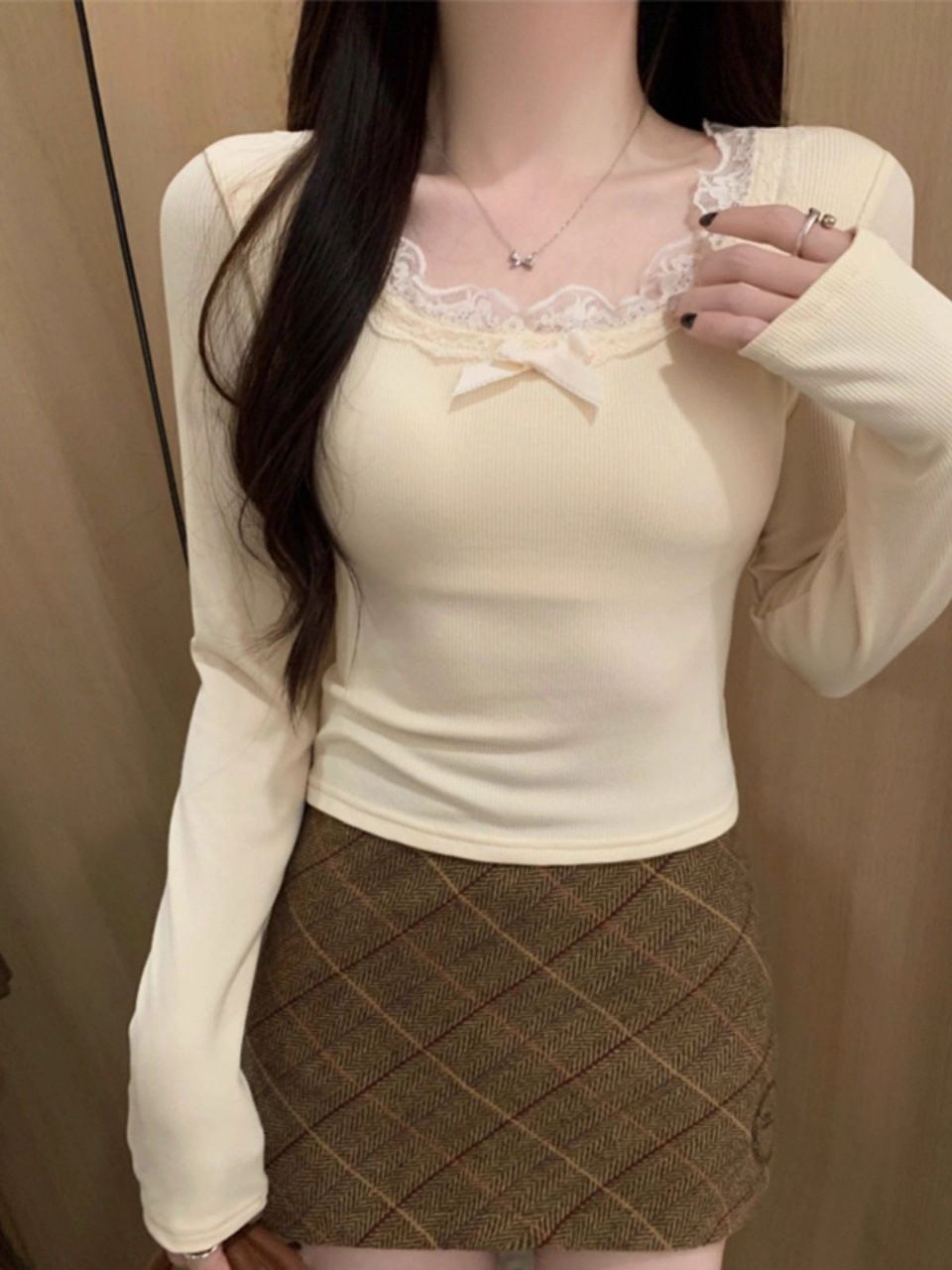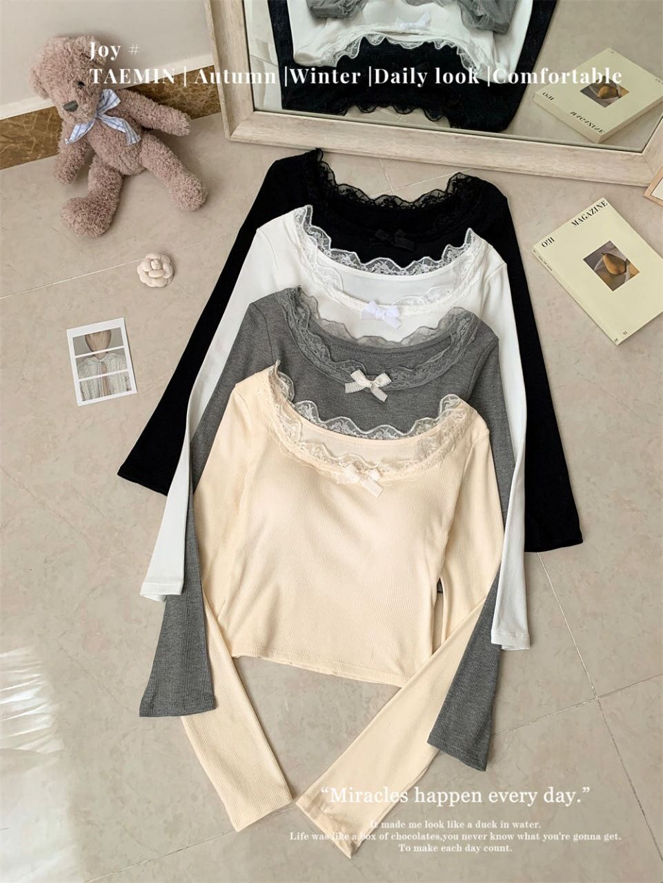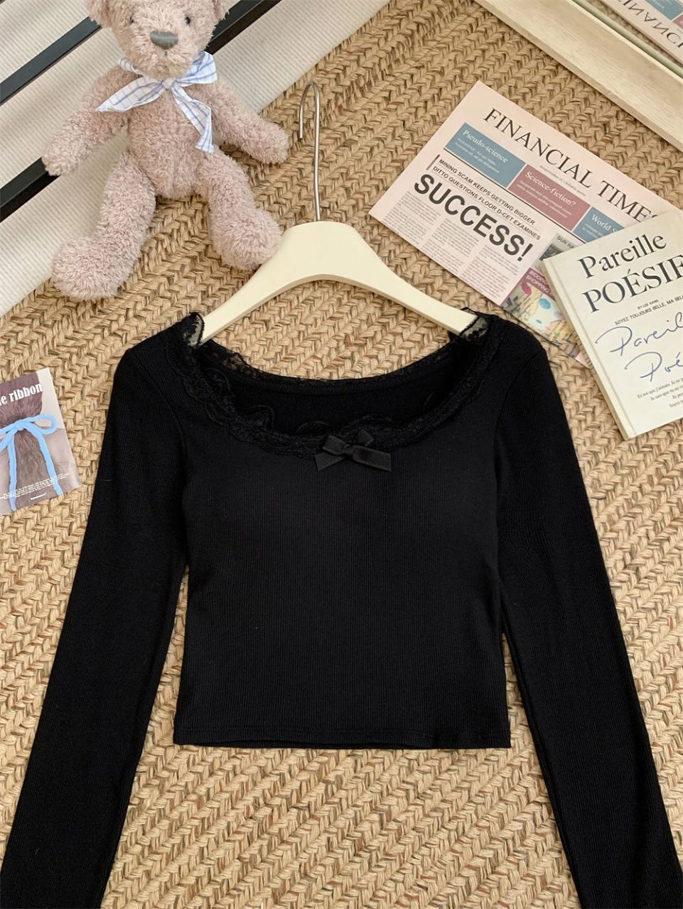 纯棉甜美蕾丝打底衫女内搭春秋冬蝴蝶结短款低领T恤法式茶艺上衣