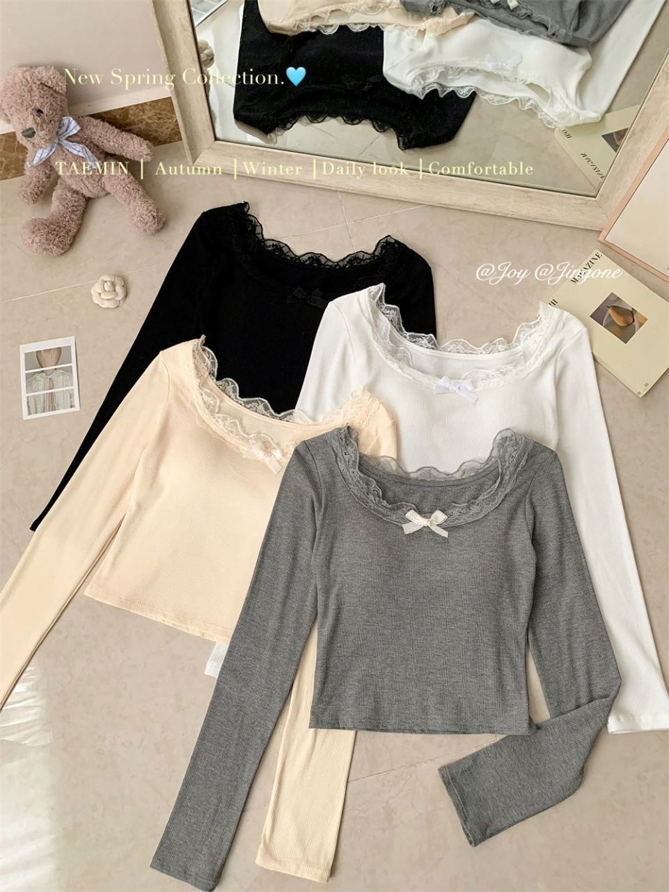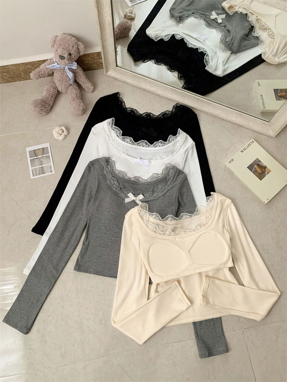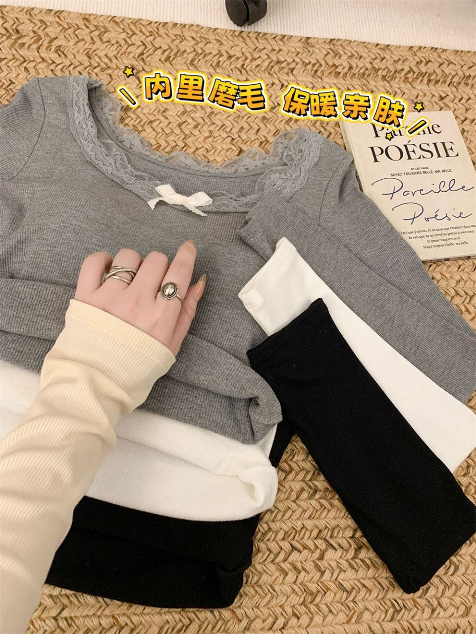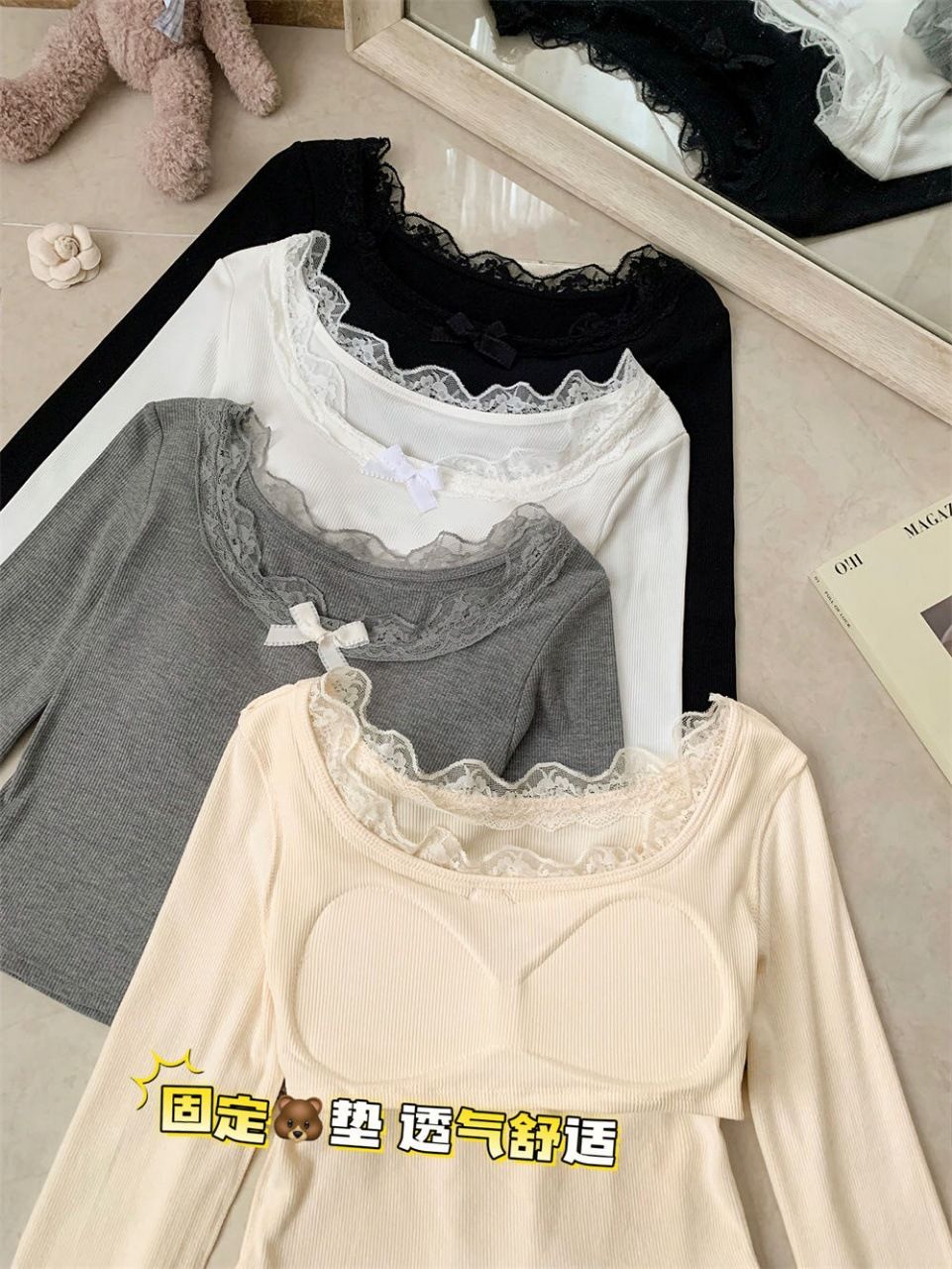 纯棉甜美蕾丝打底衫女内搭春秋冬蝴蝶结短款低领T恤法式茶艺上衣