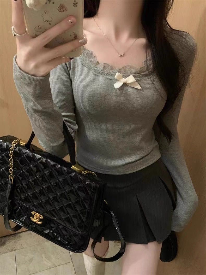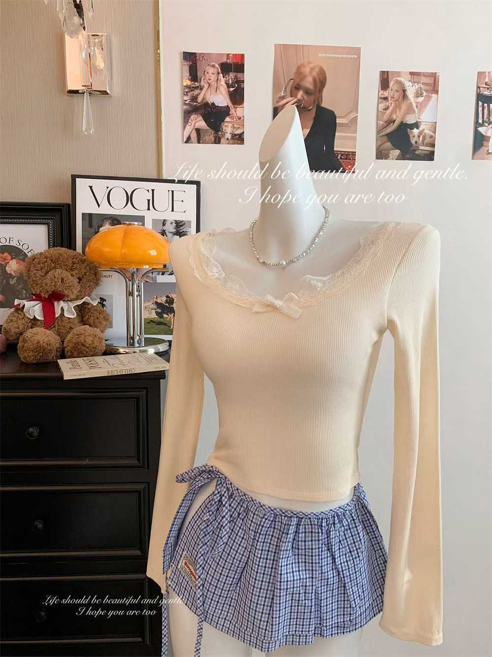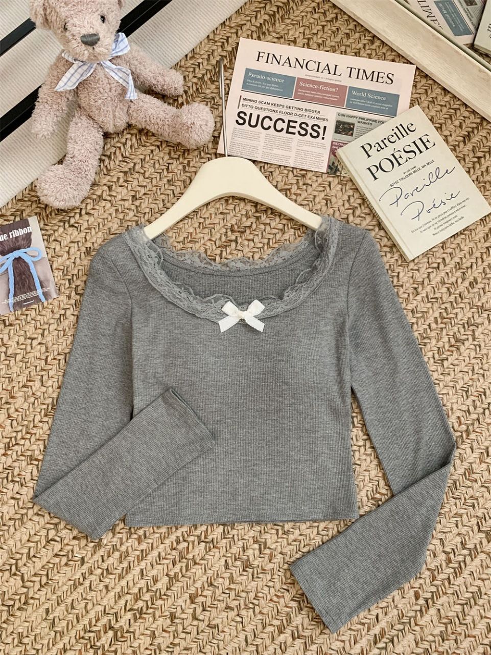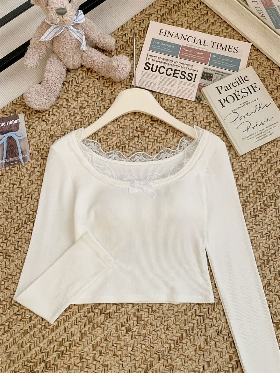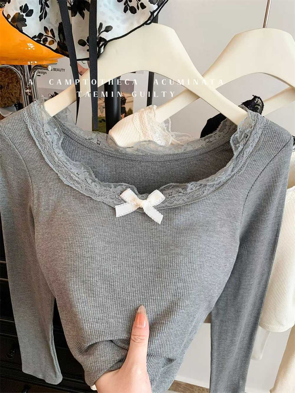 纯棉甜美蕾丝打底衫女内搭春秋冬蝴蝶结短款低领T恤法式茶艺上衣