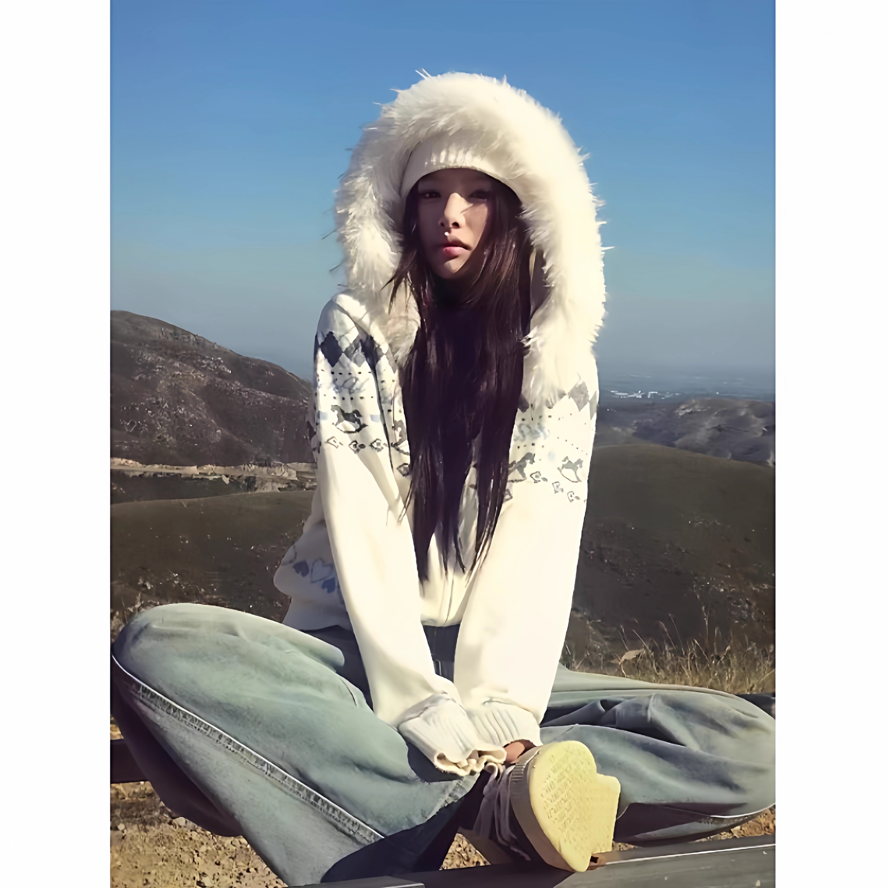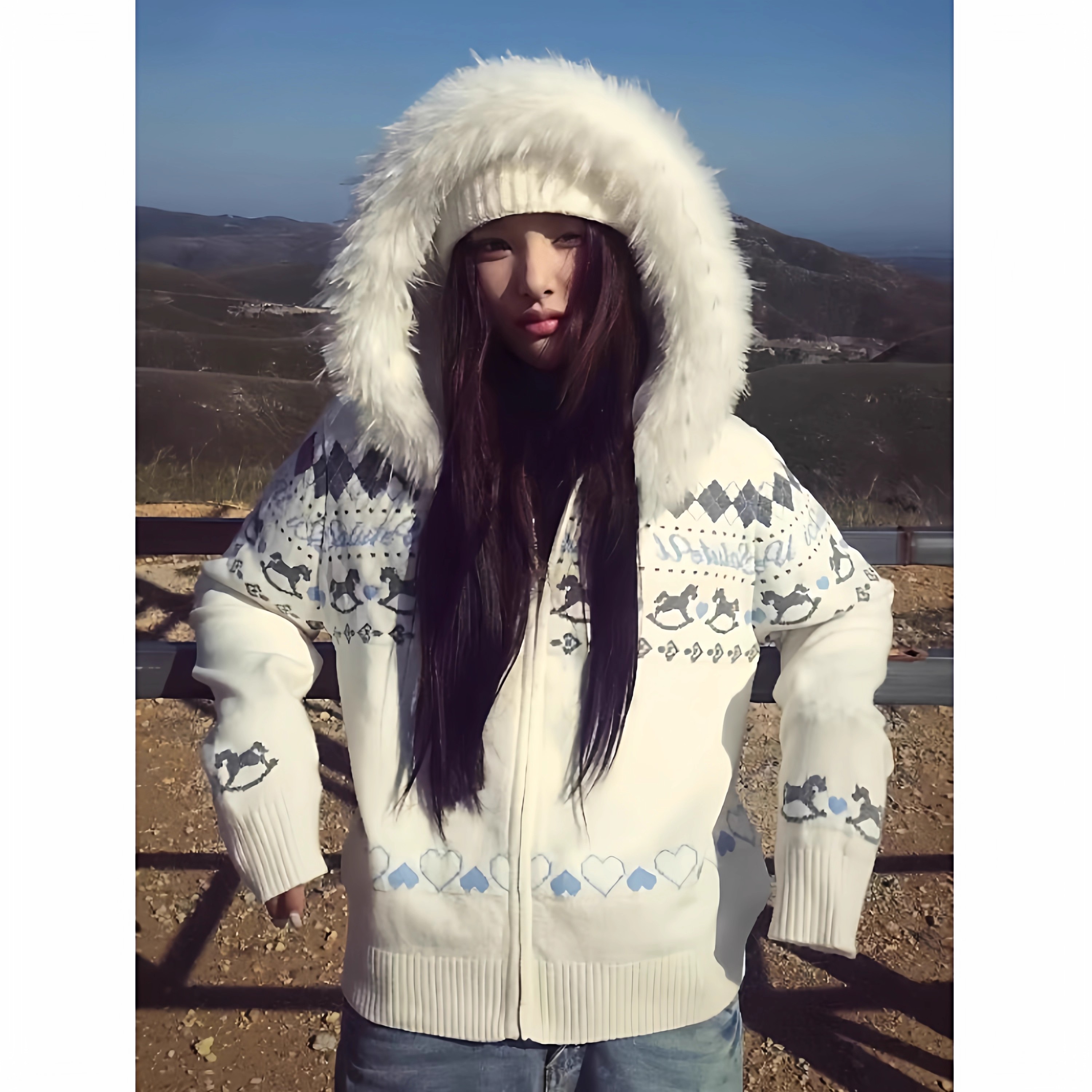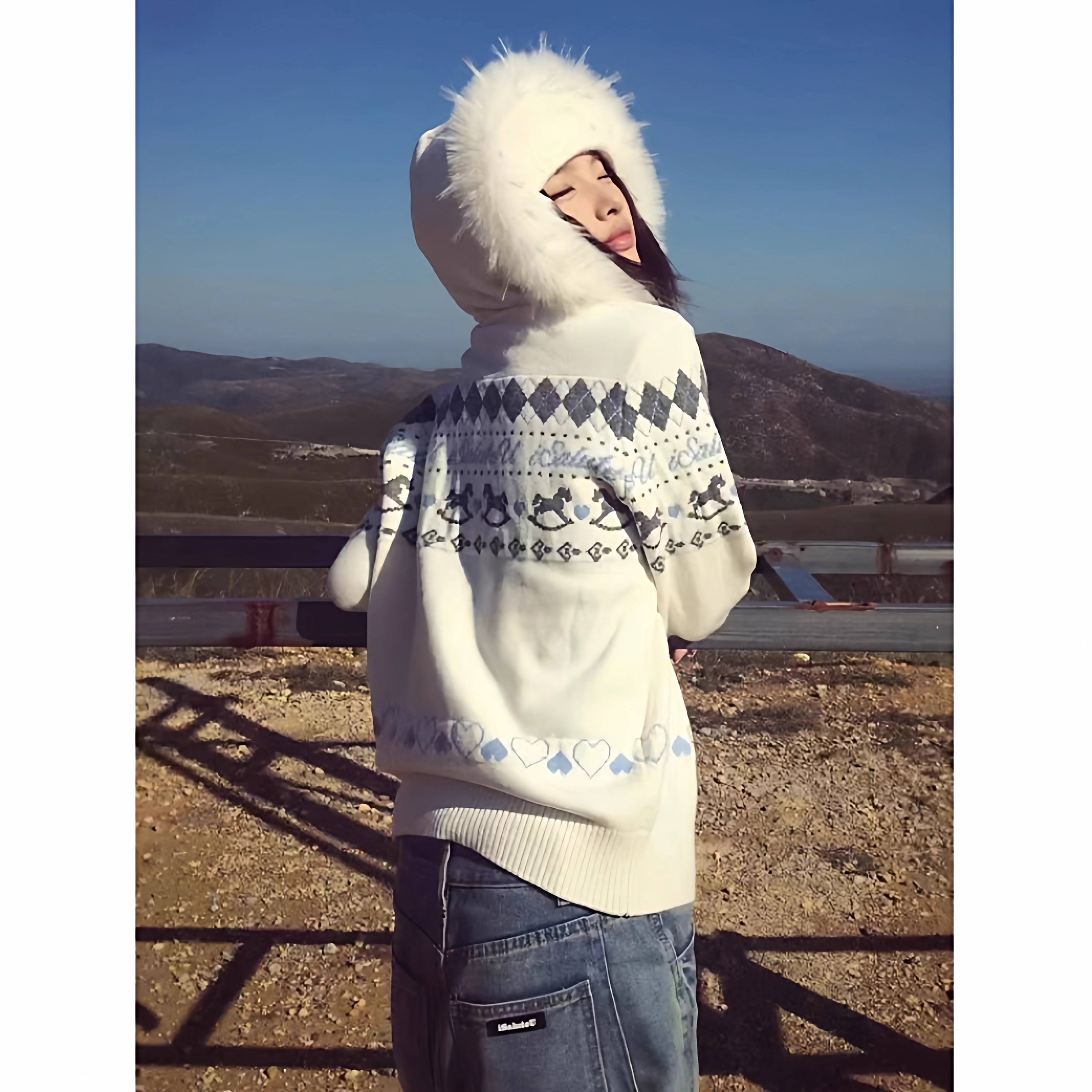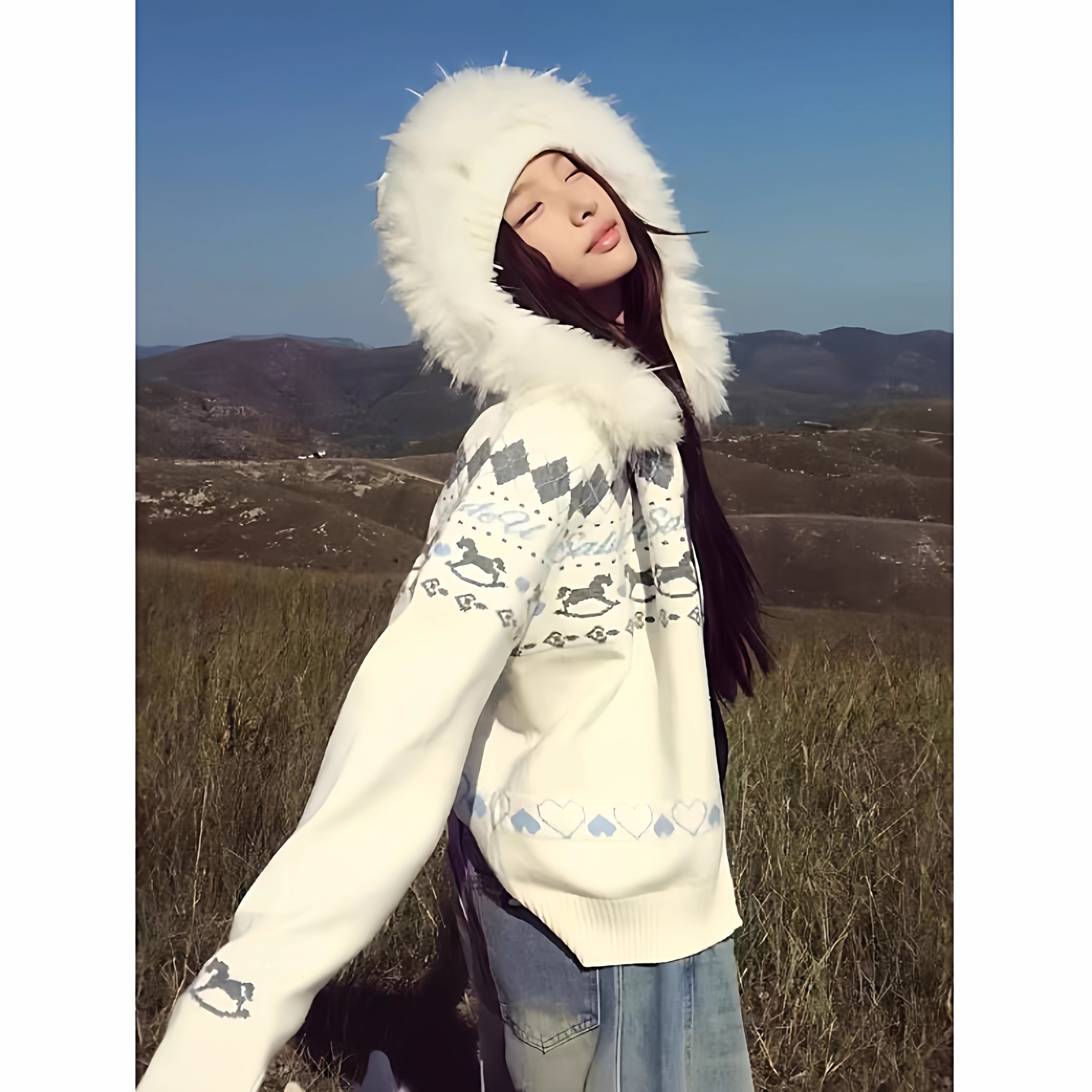 费尔岛白色毛领连帽毛衣外套女秋冬2025新款慵懒风宽松开衫针织衫