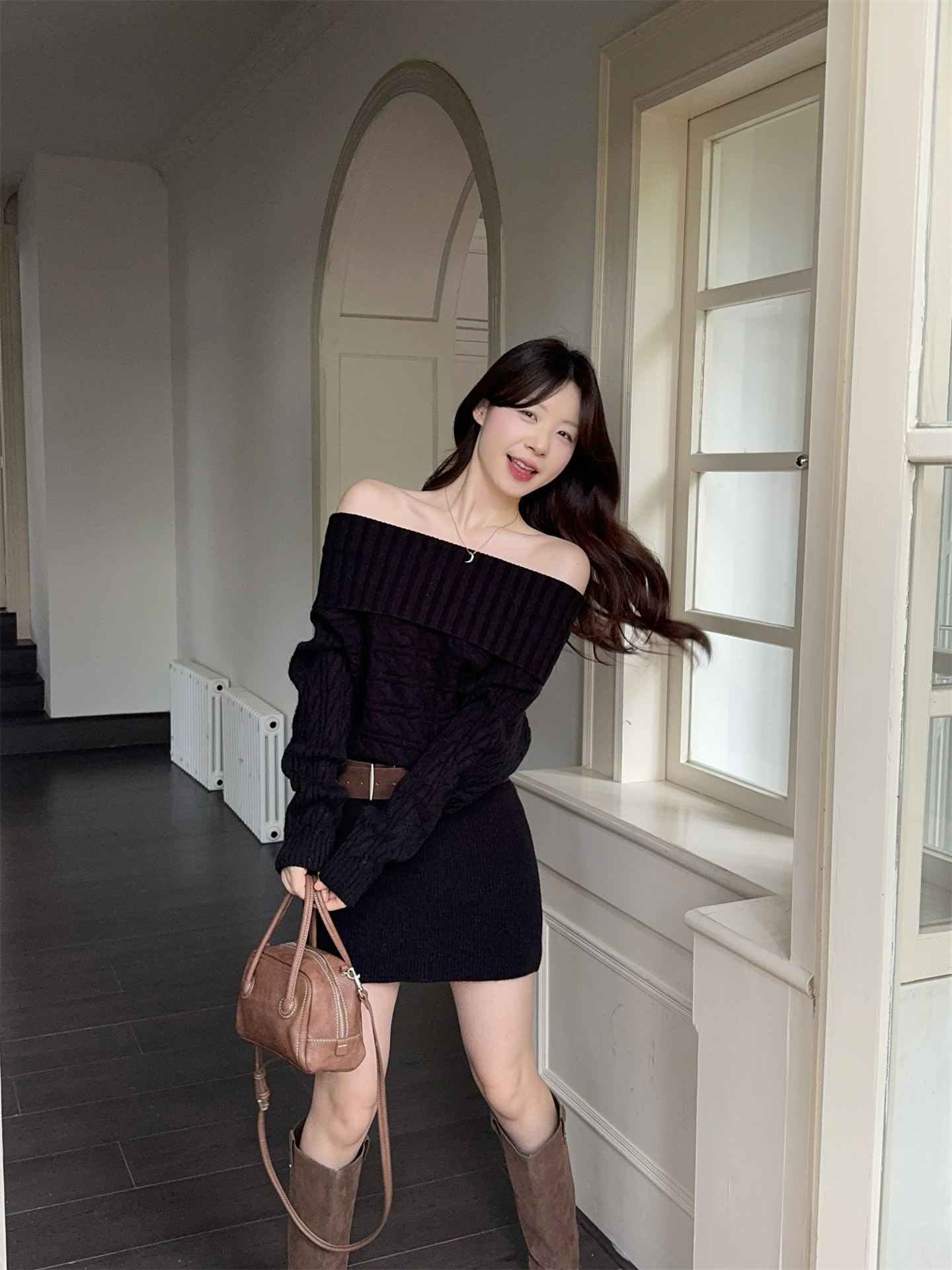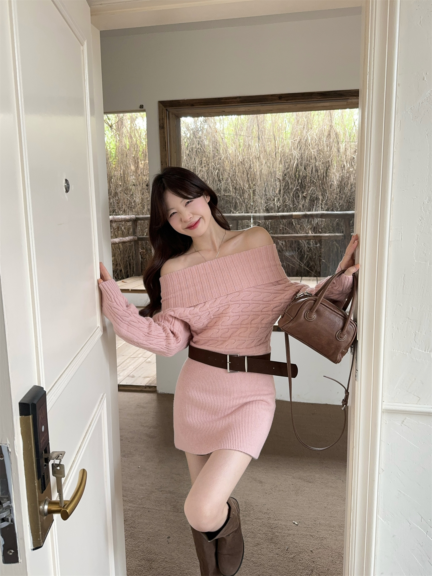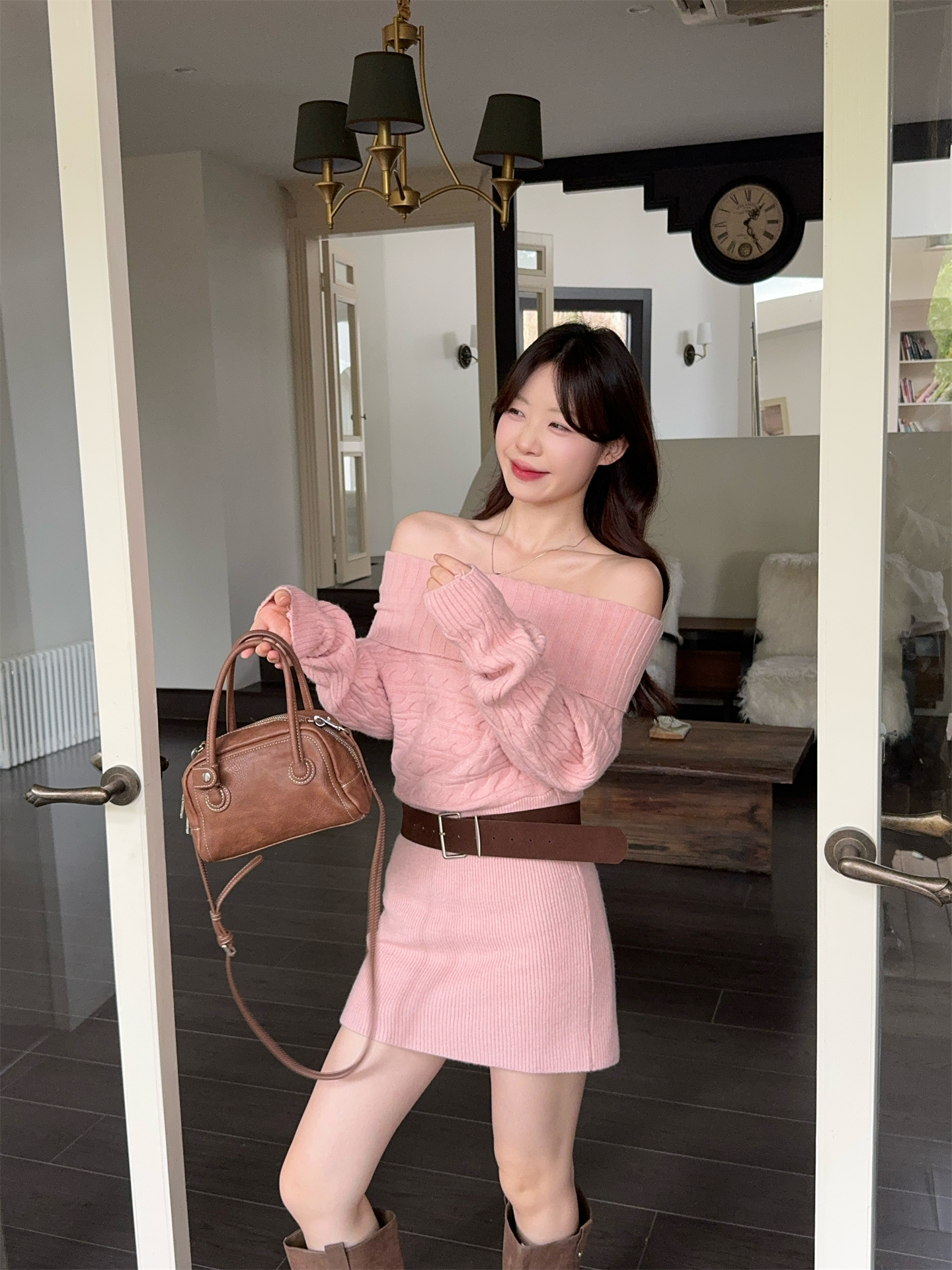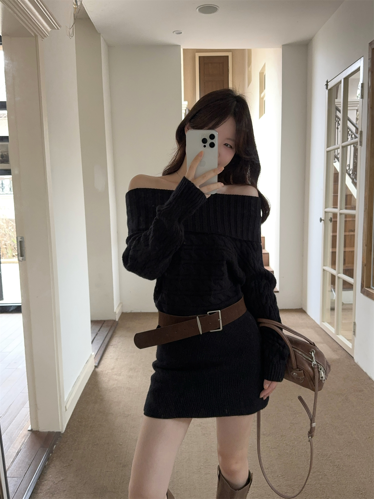 实拍 2025秋冬新款韩系一字肩长袖针织连衣裙收腰包臀裙女松紧腰