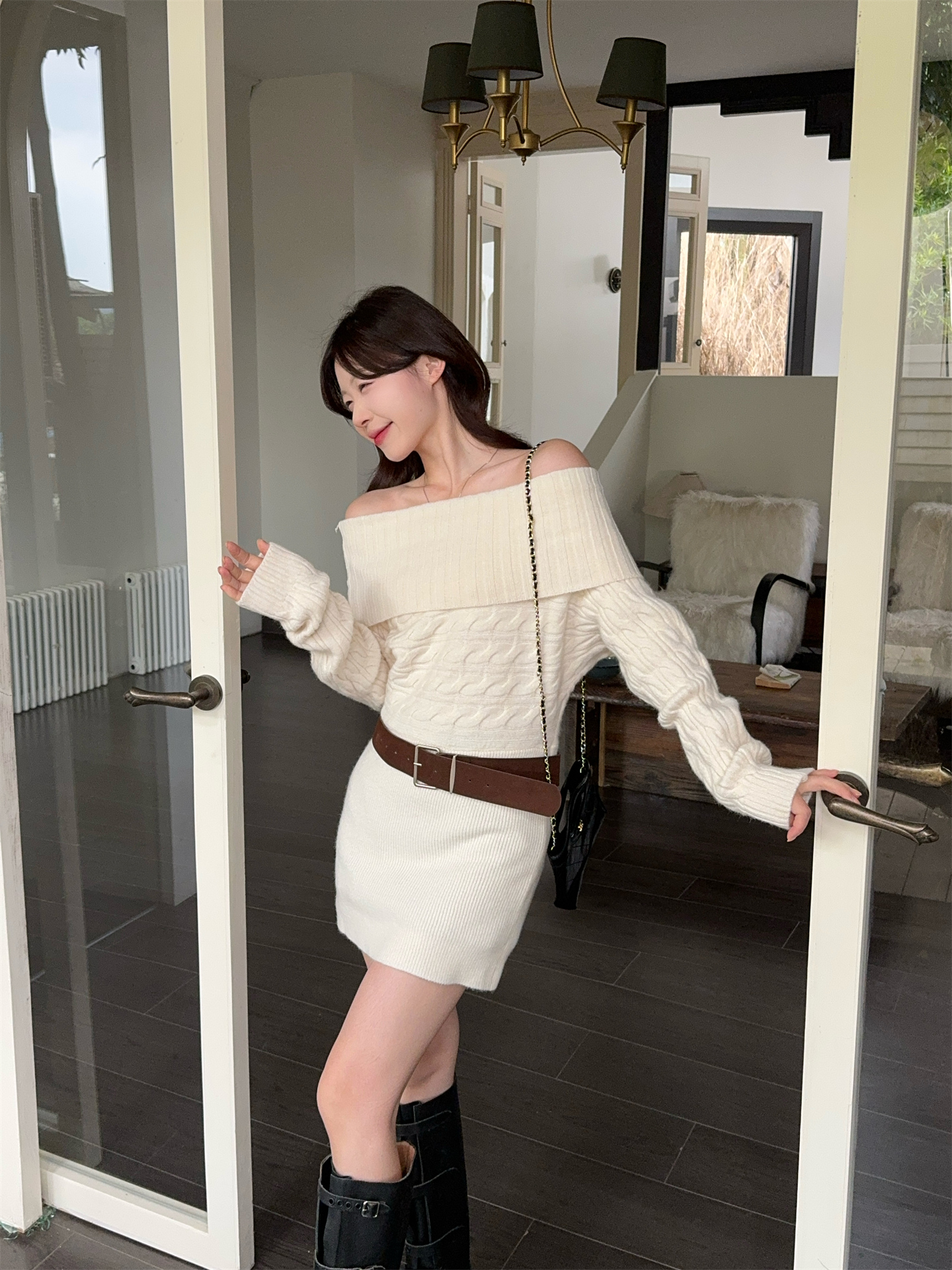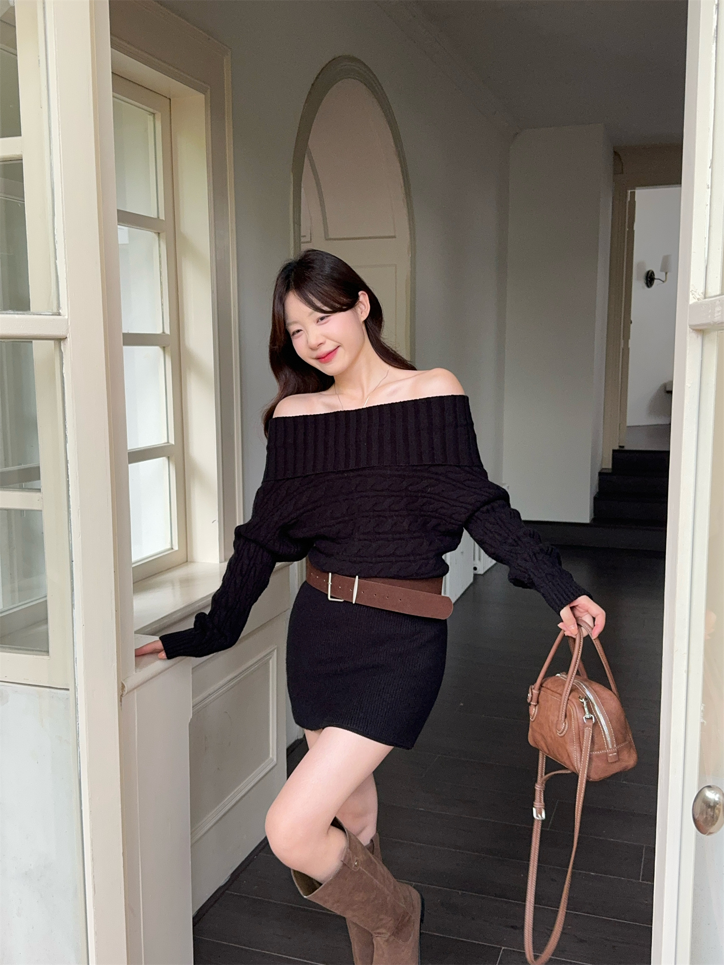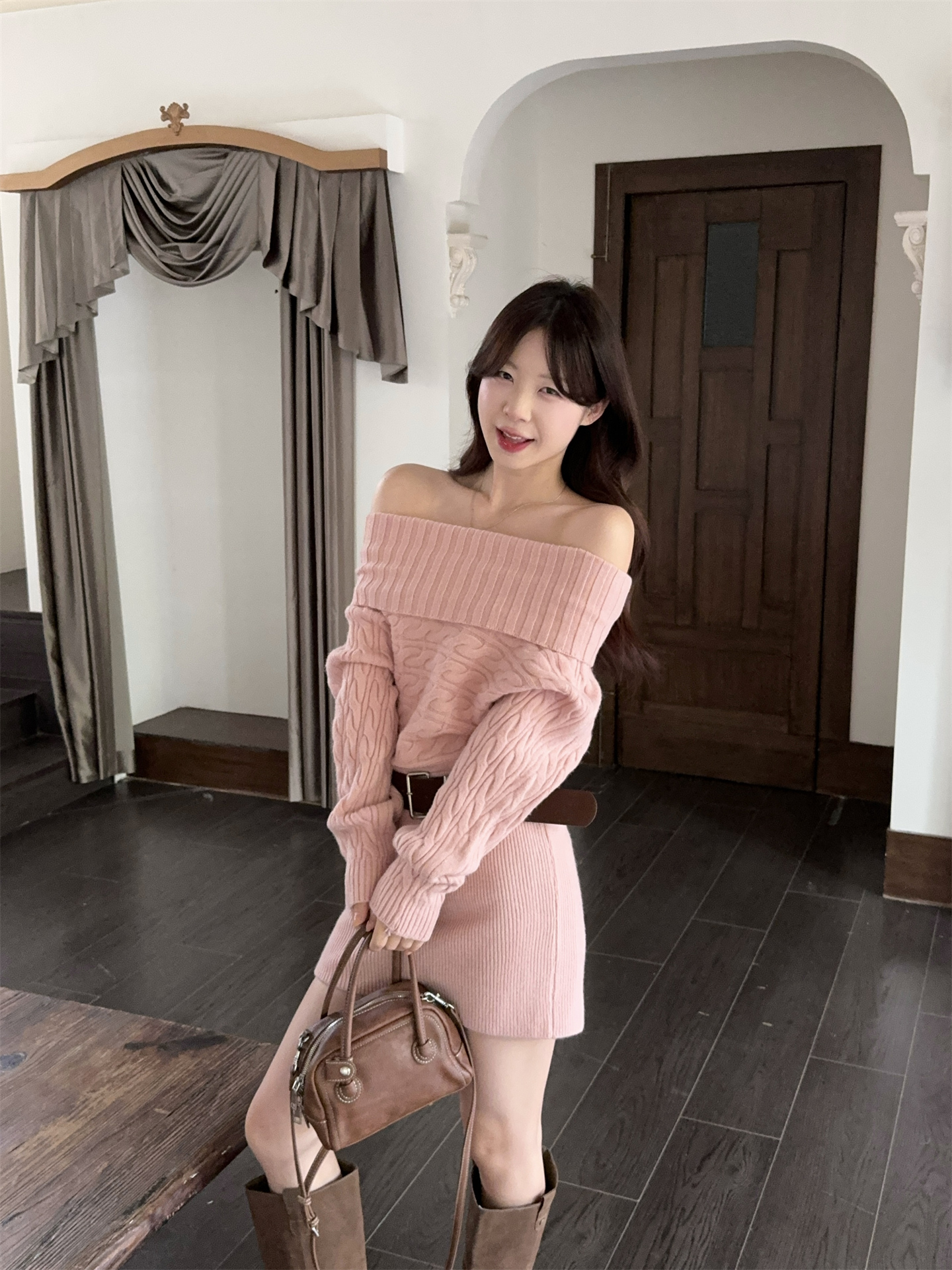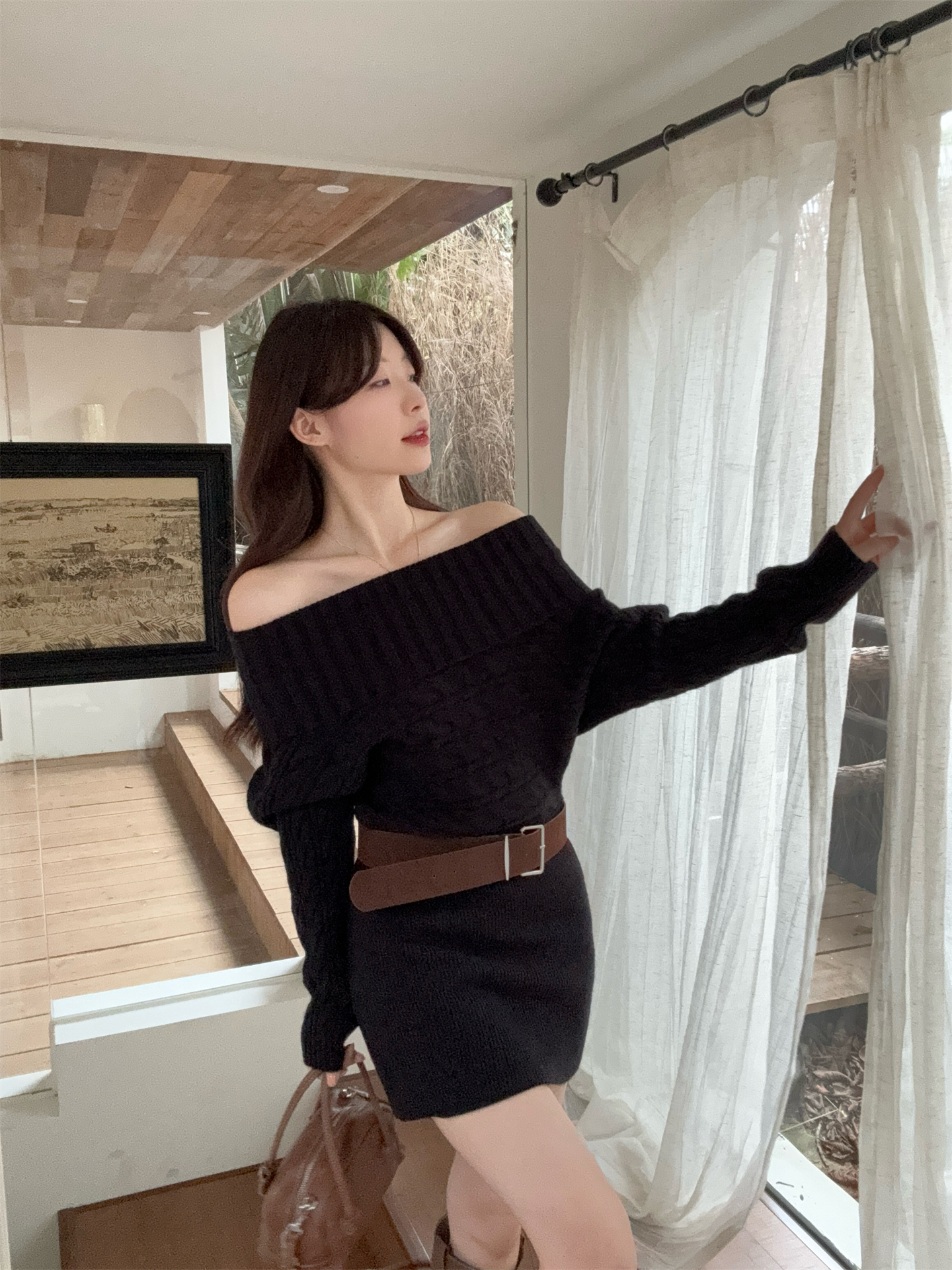 实拍 2025秋冬新款韩系一字肩长袖针织连衣裙收腰包臀裙女松紧腰