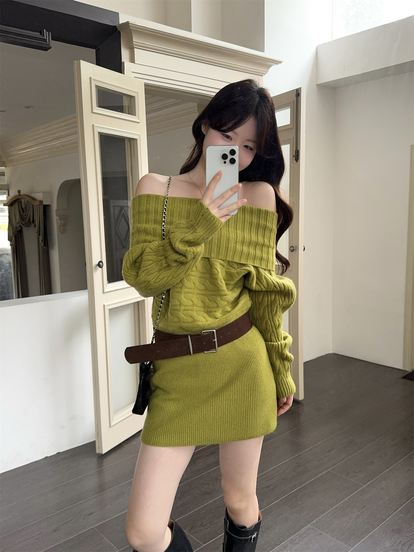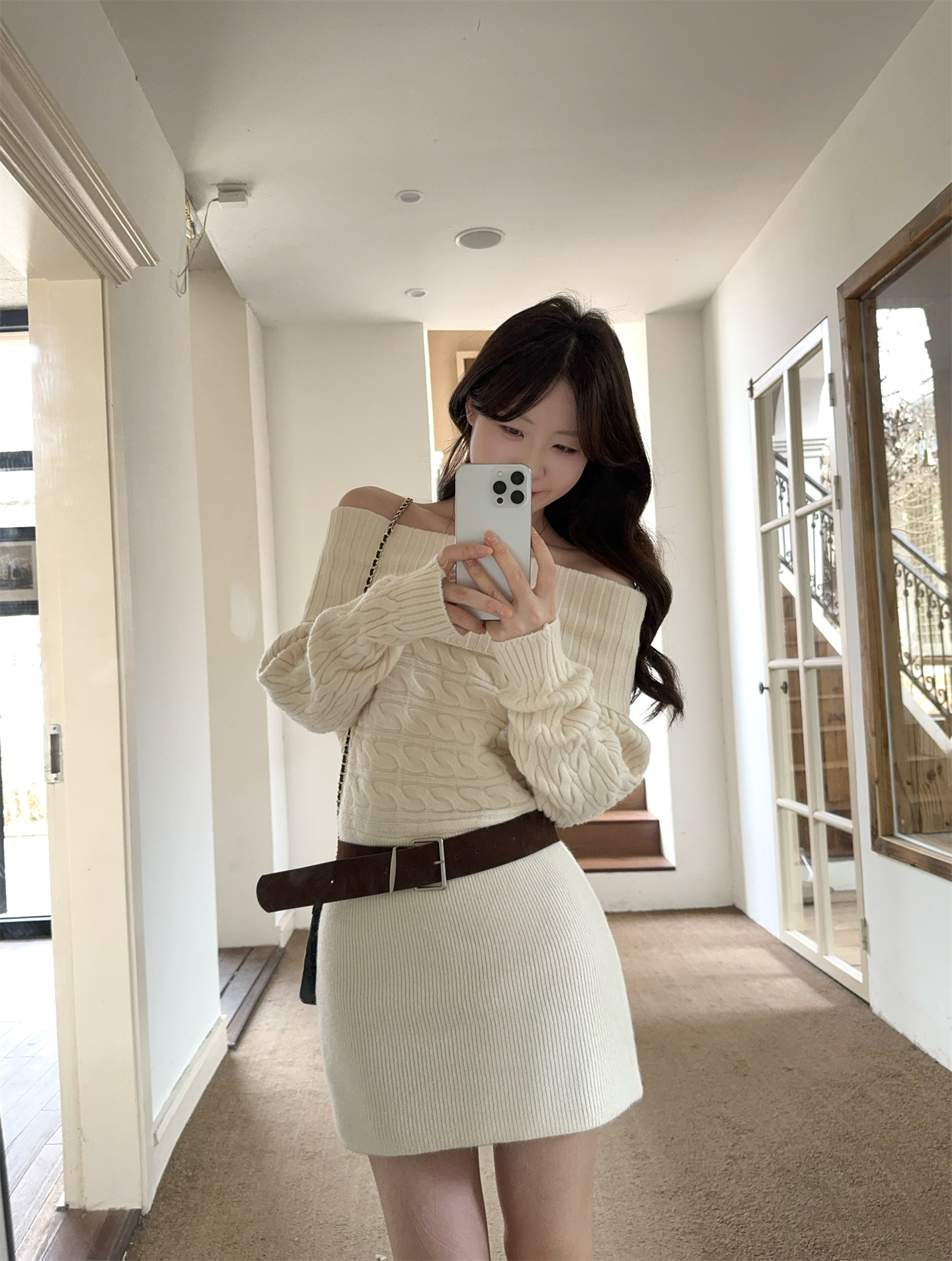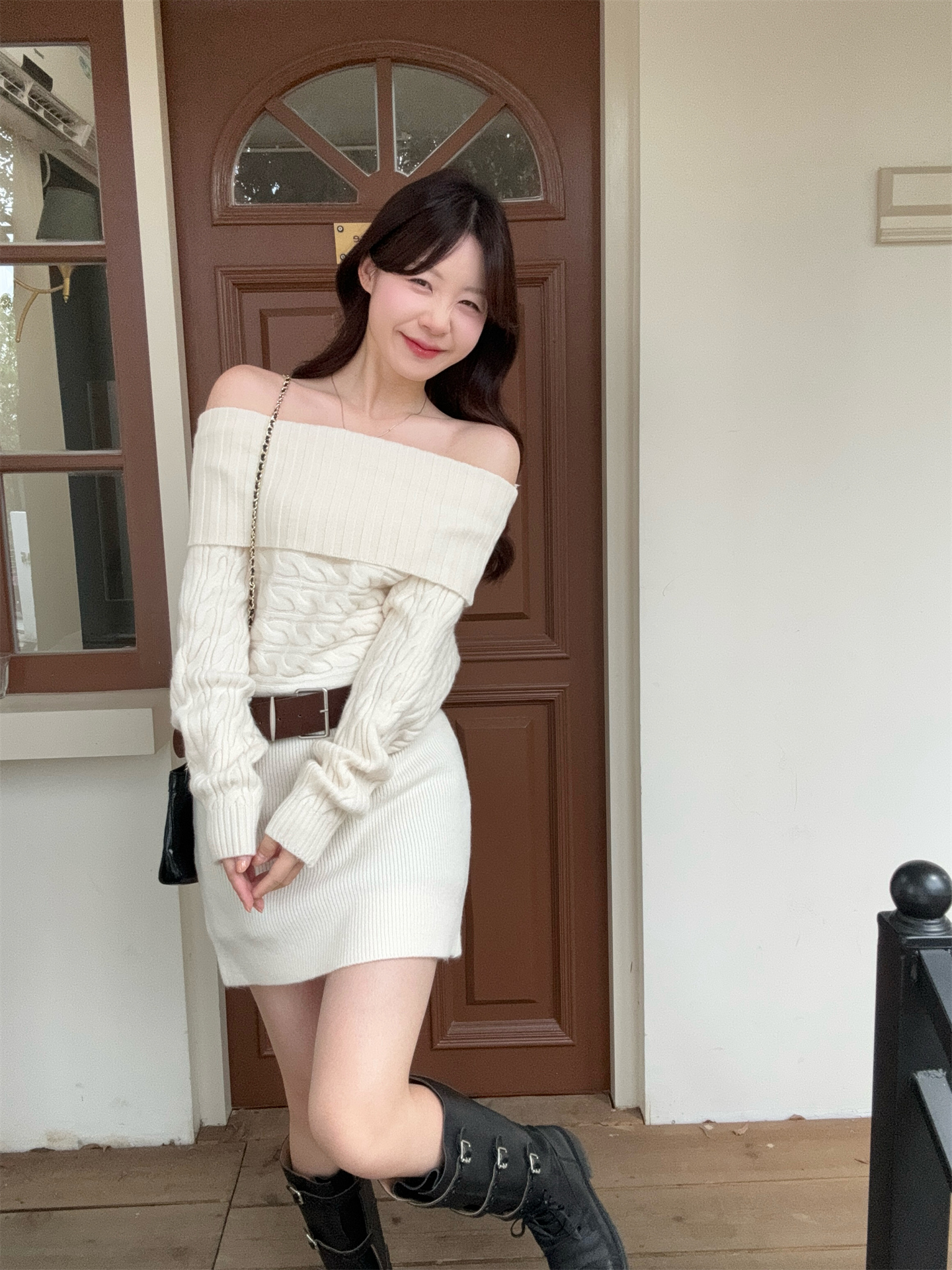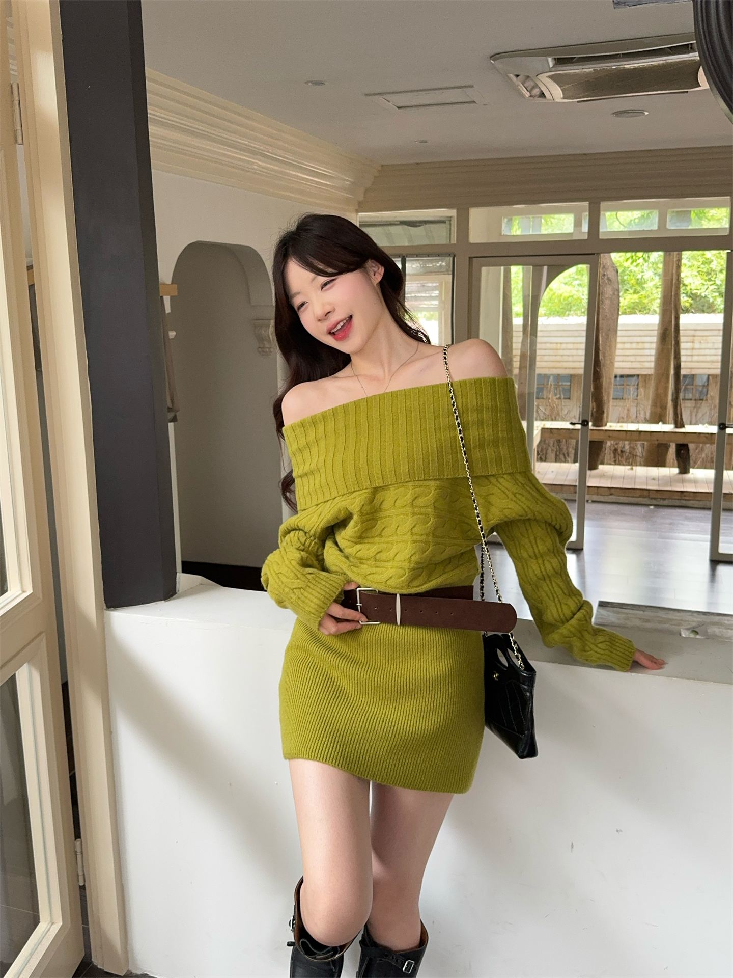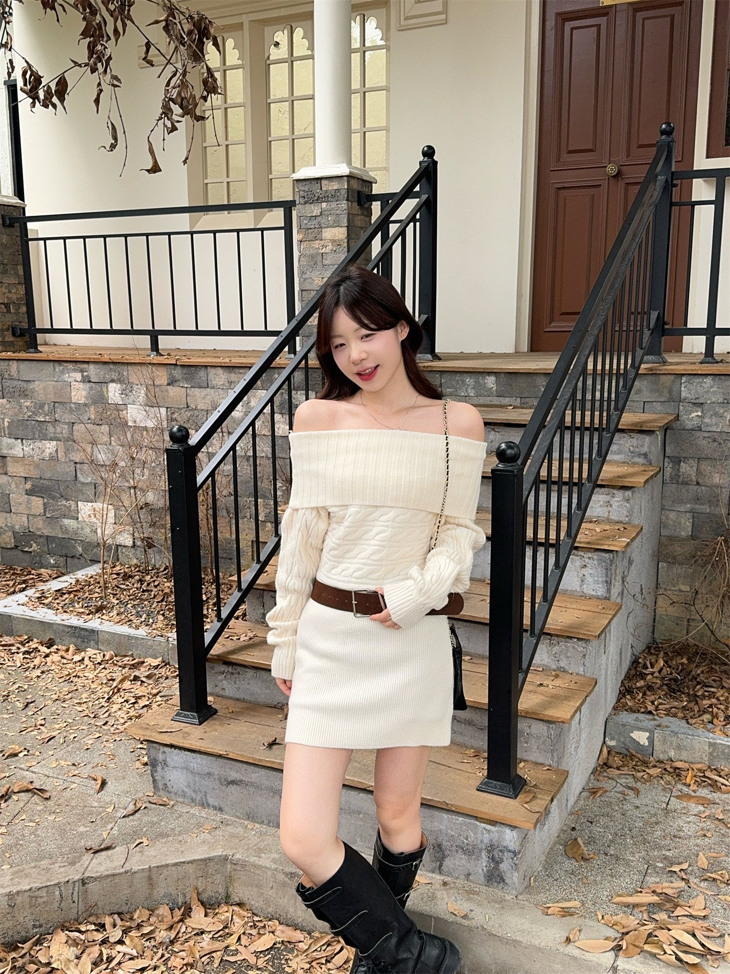 实拍 2025秋冬新款韩系一字肩长袖针织连衣裙收腰包臀裙女松紧腰