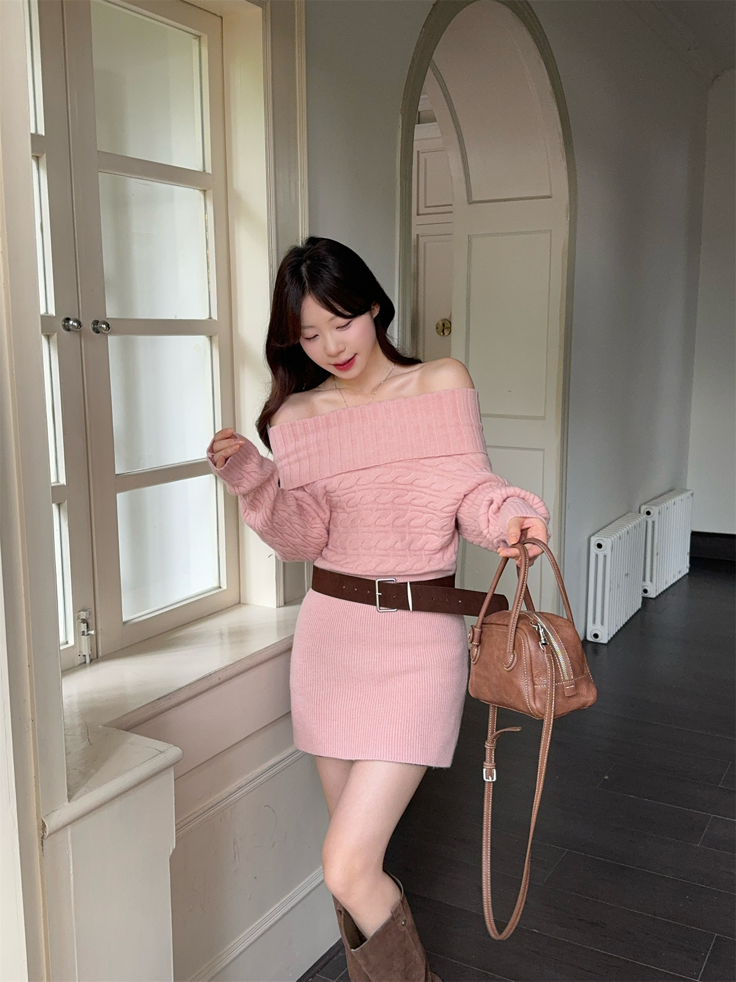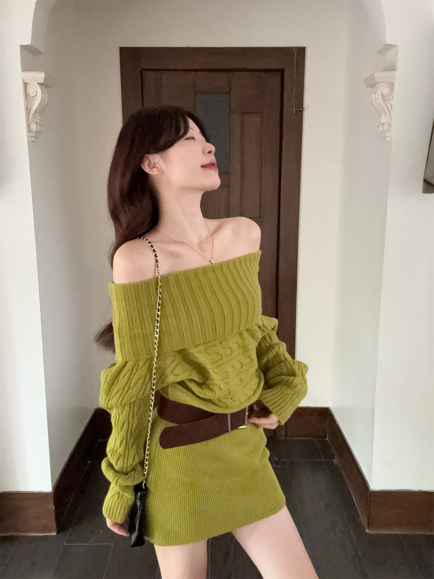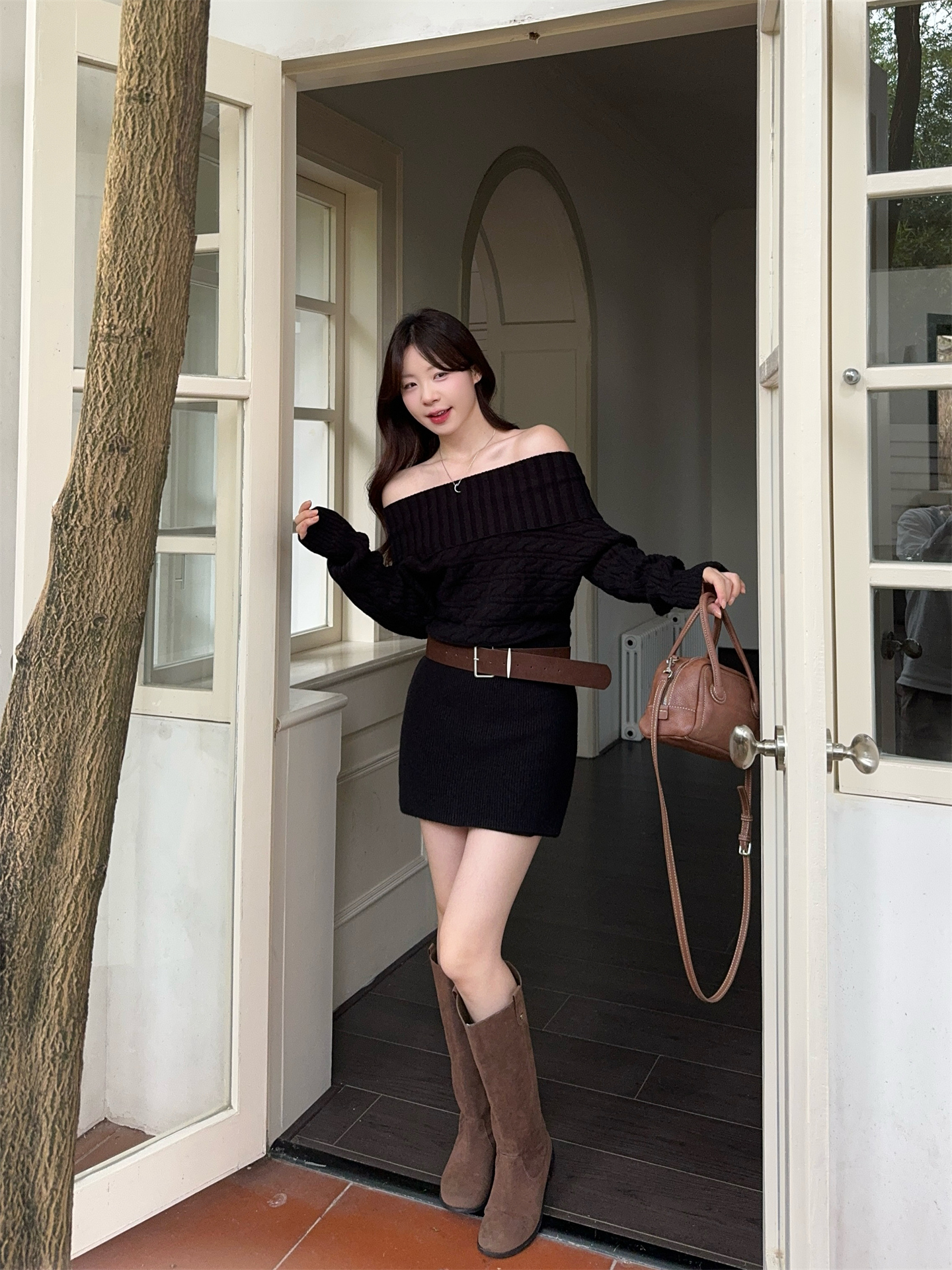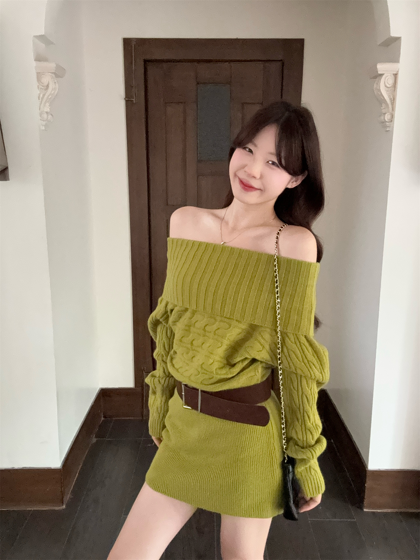 实拍 2025秋冬新款韩系一字肩长袖针织连衣裙收腰包臀裙女松紧腰