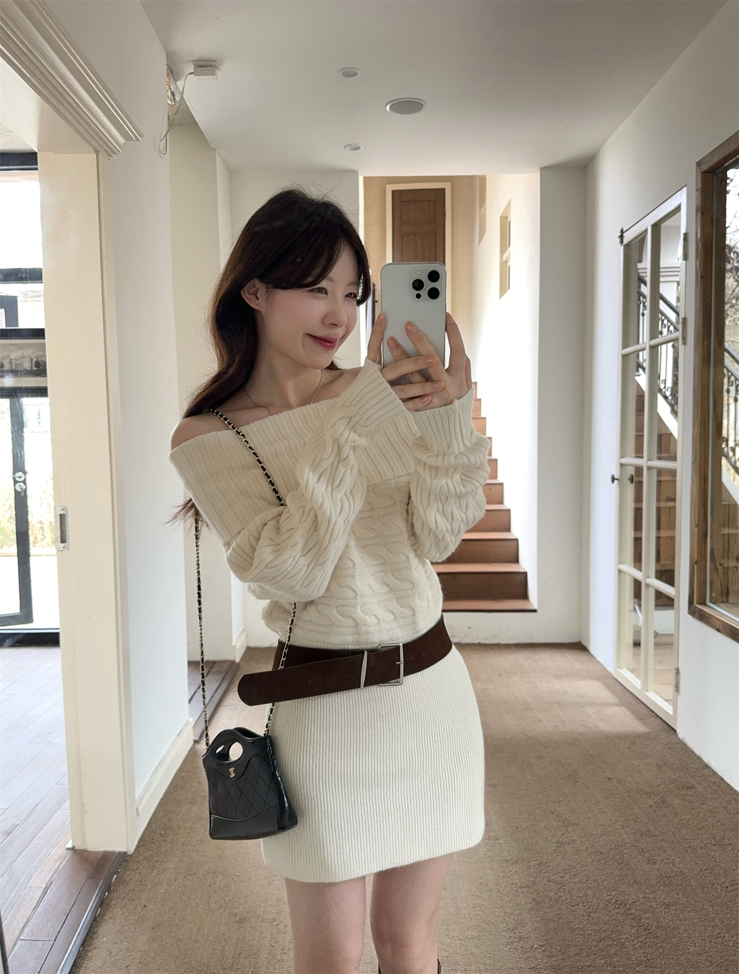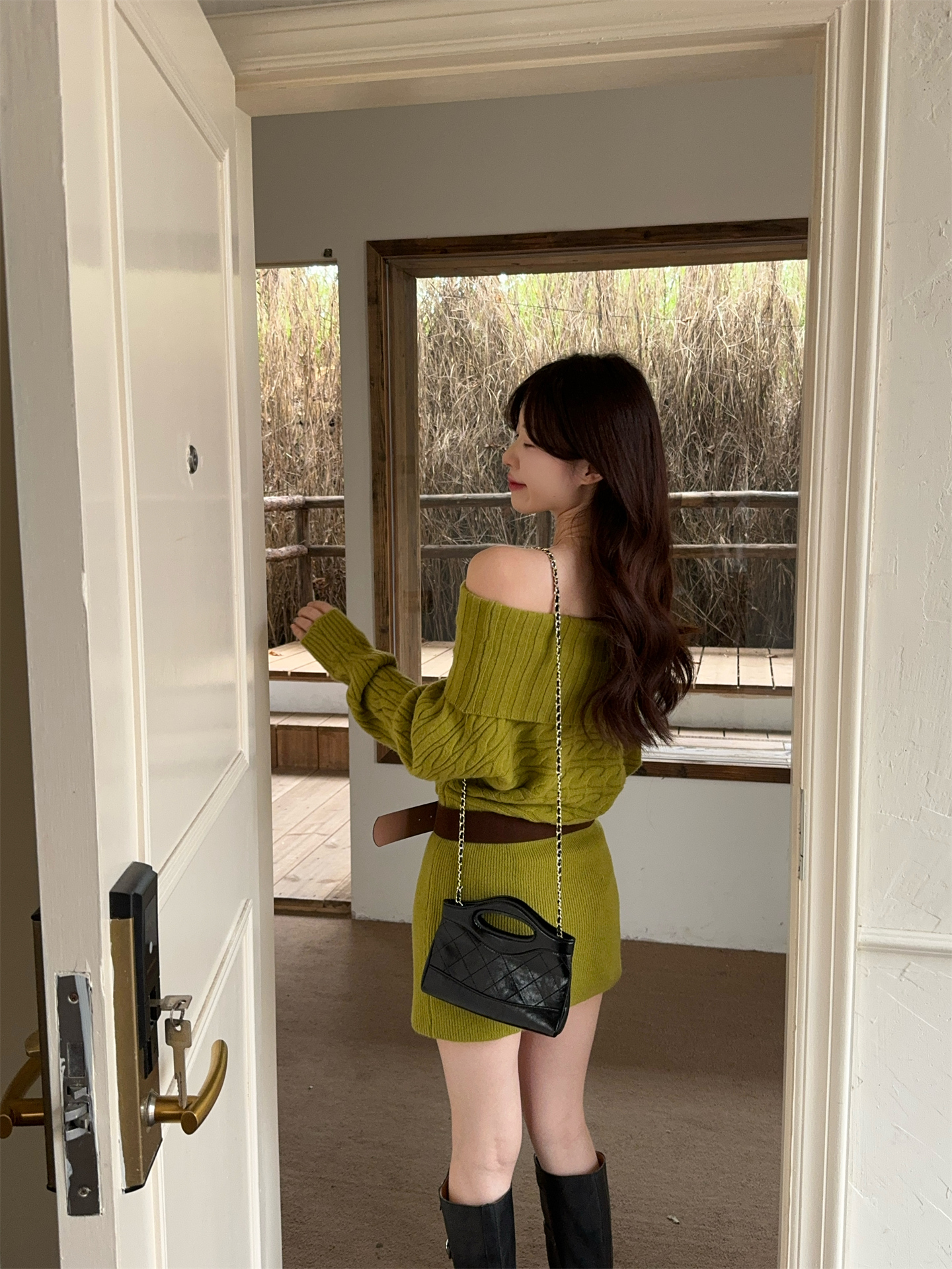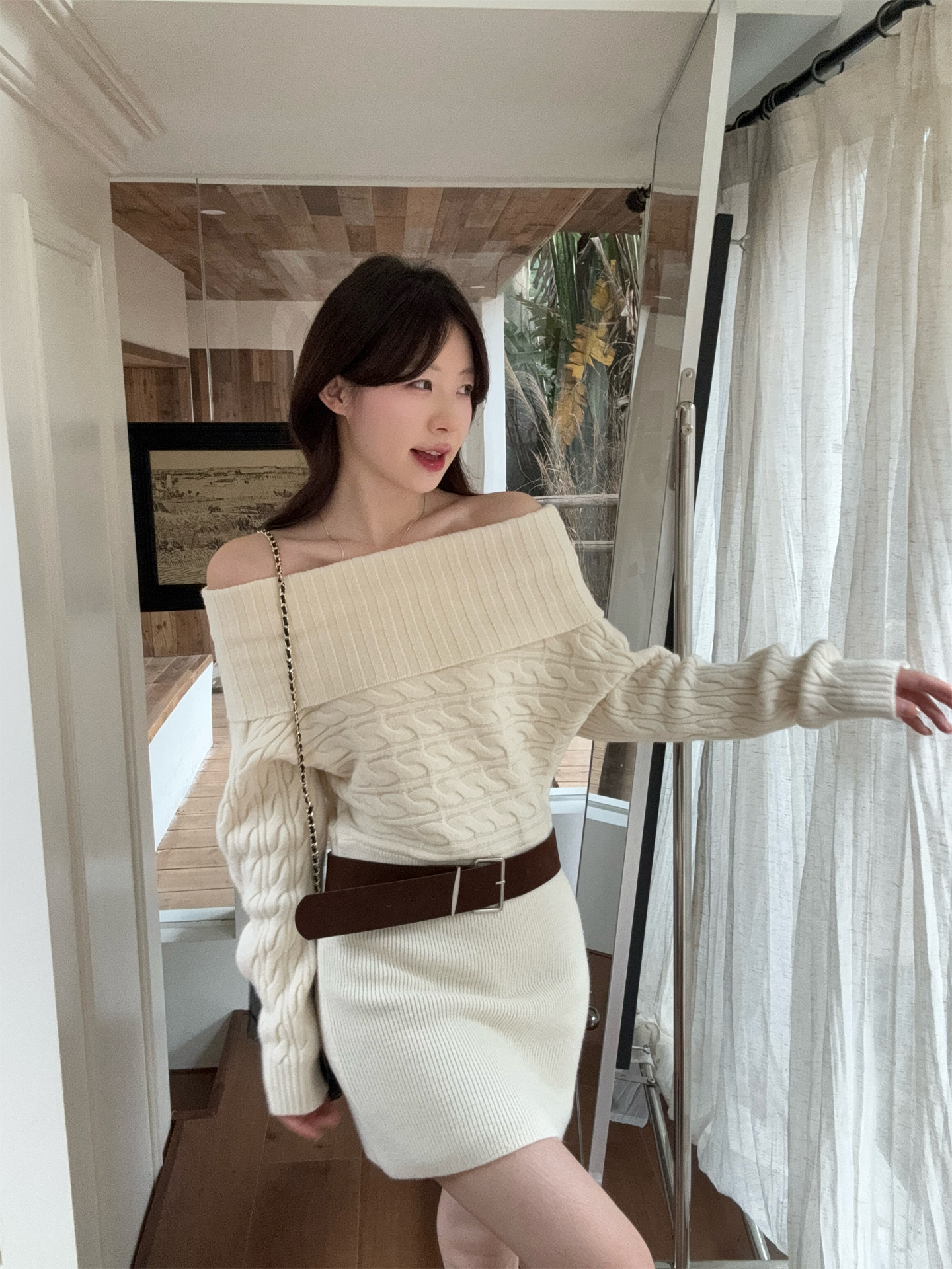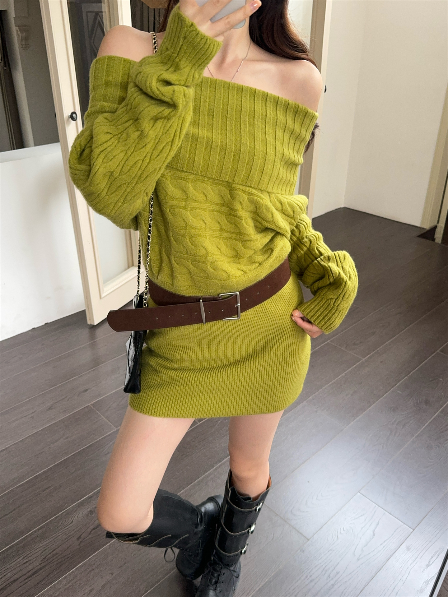 实拍 2025秋冬新款韩系一字肩长袖针织连衣裙收腰包臀裙女松紧腰