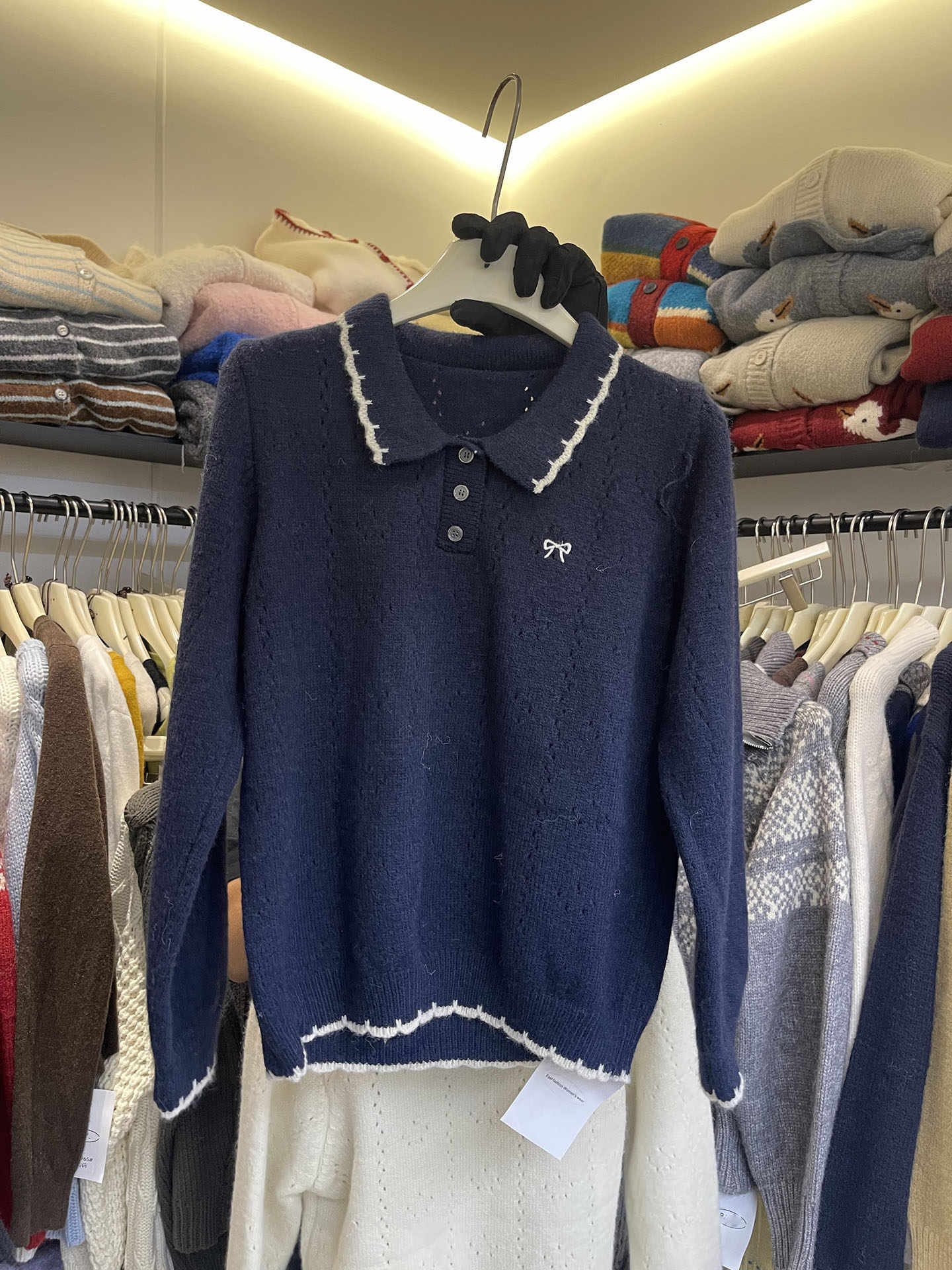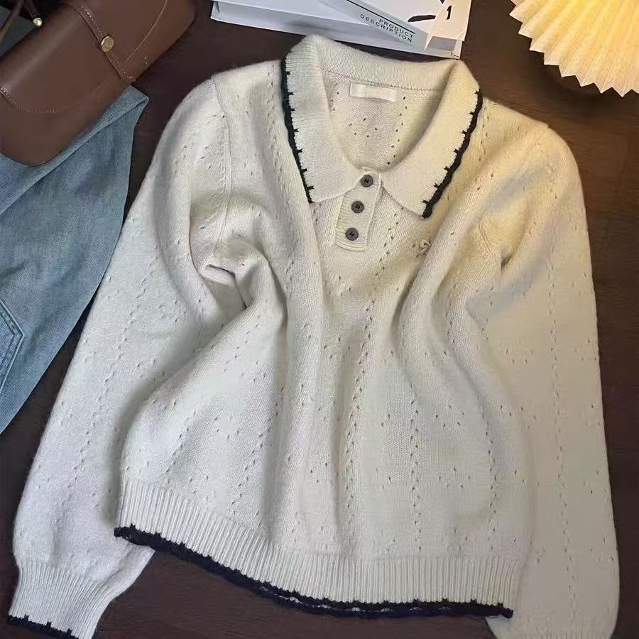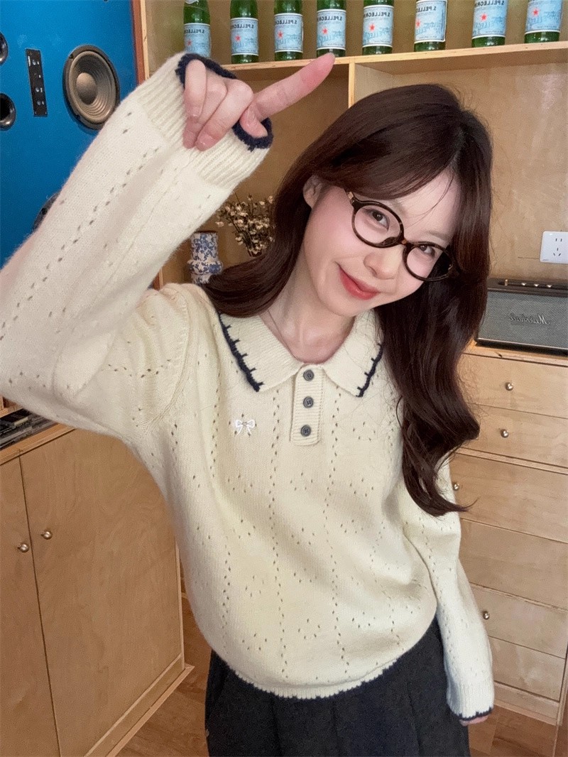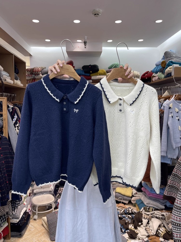 翻领刺绣蝴蝶结针织毛衣打底内搭长袖宽松套头上衣女