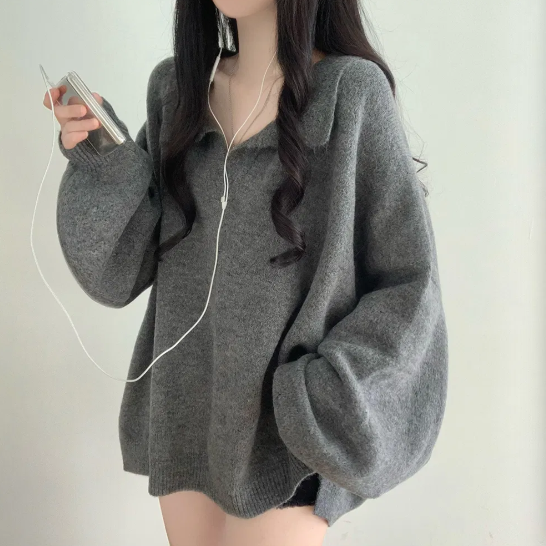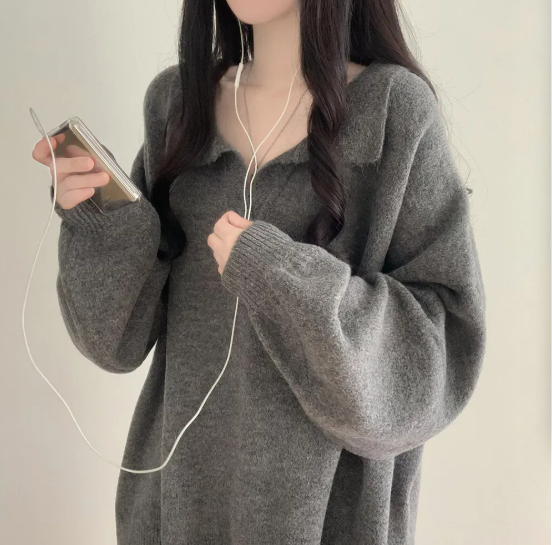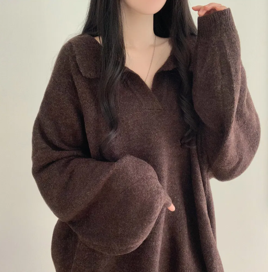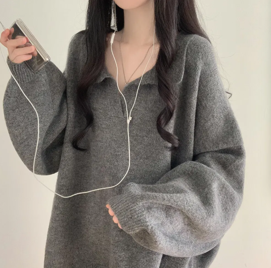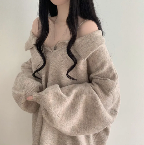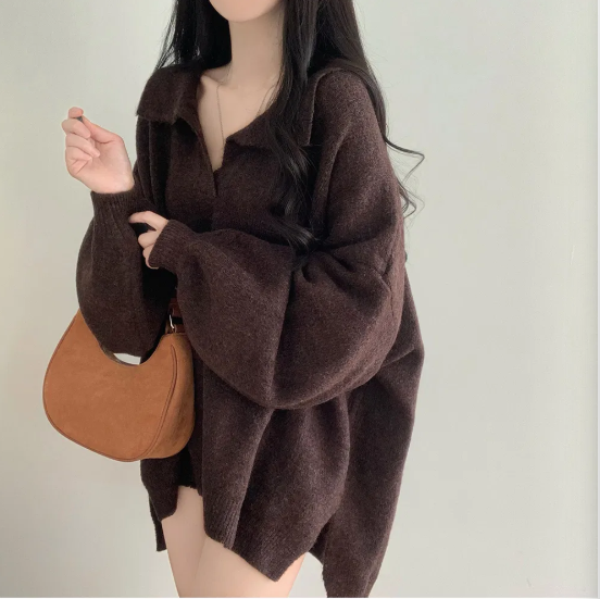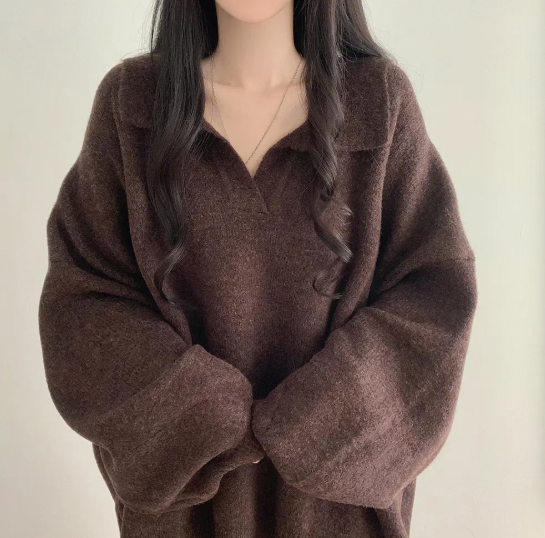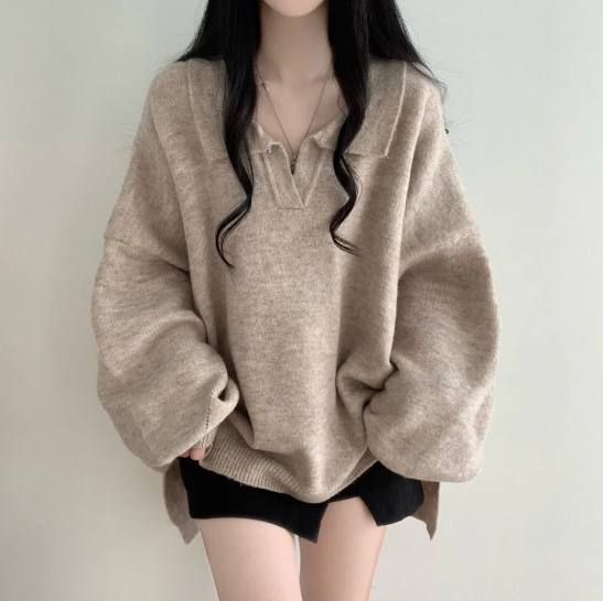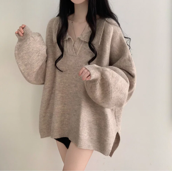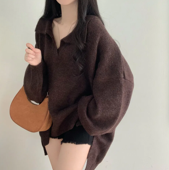 已出货 韩chic秋冬翻V领毛衣宽松慵懒保暖套头中长款开叉厚针织衫