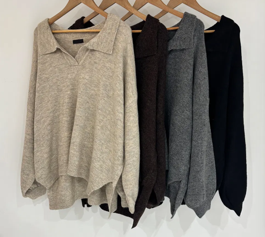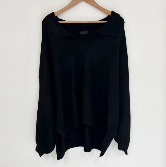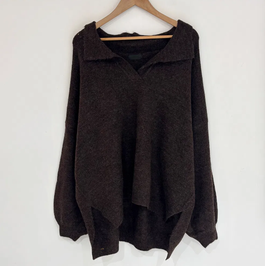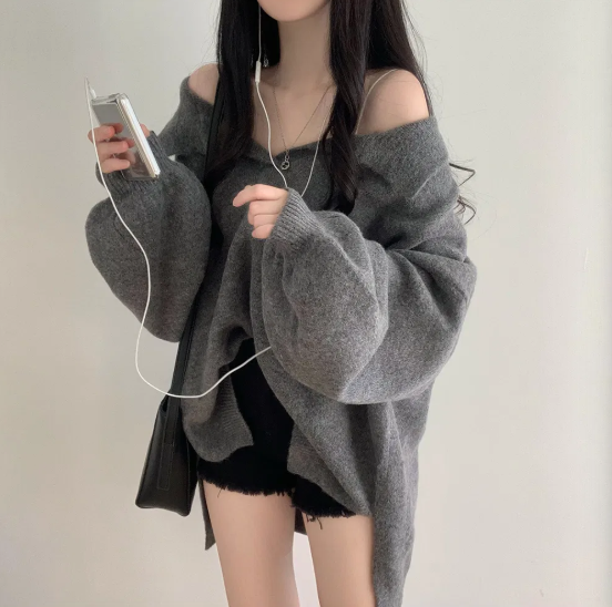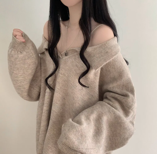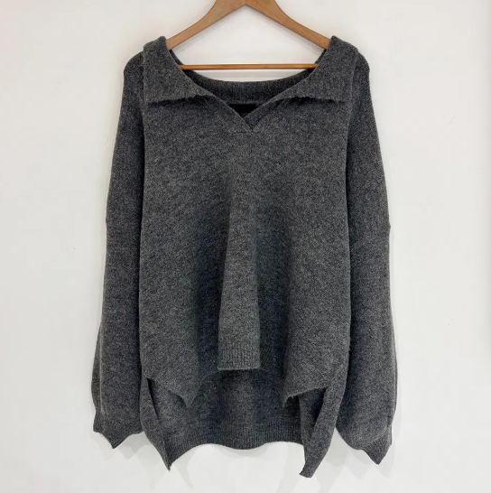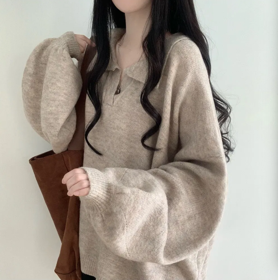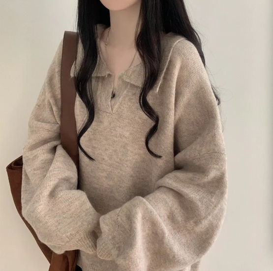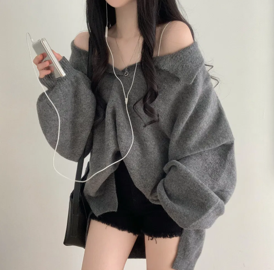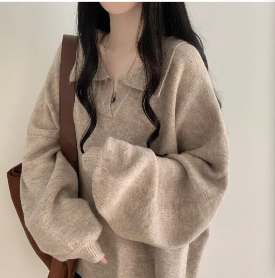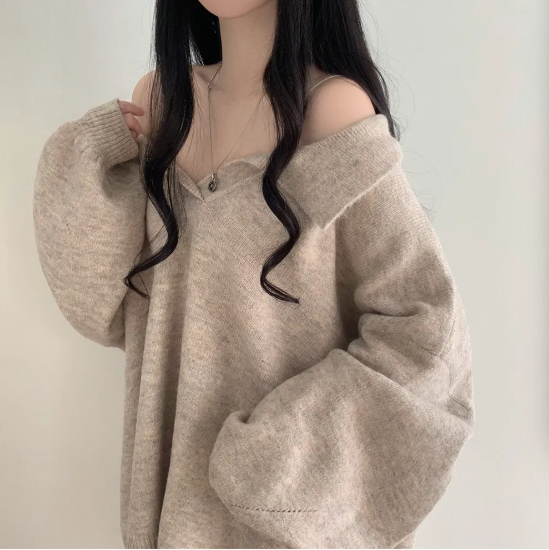 已出货 韩chic秋冬翻V领毛衣宽松慵懒保暖套头中长款开叉厚针织衫