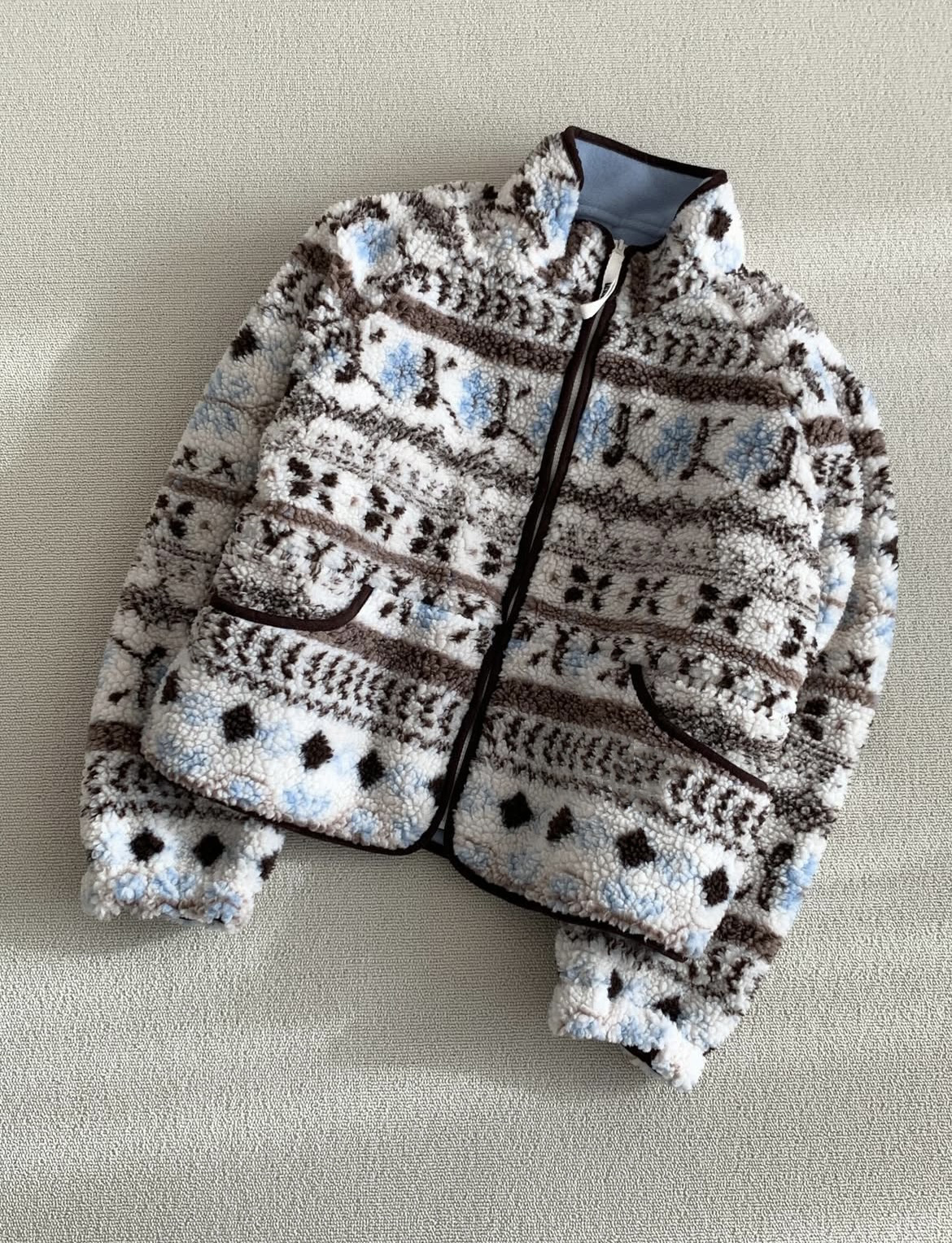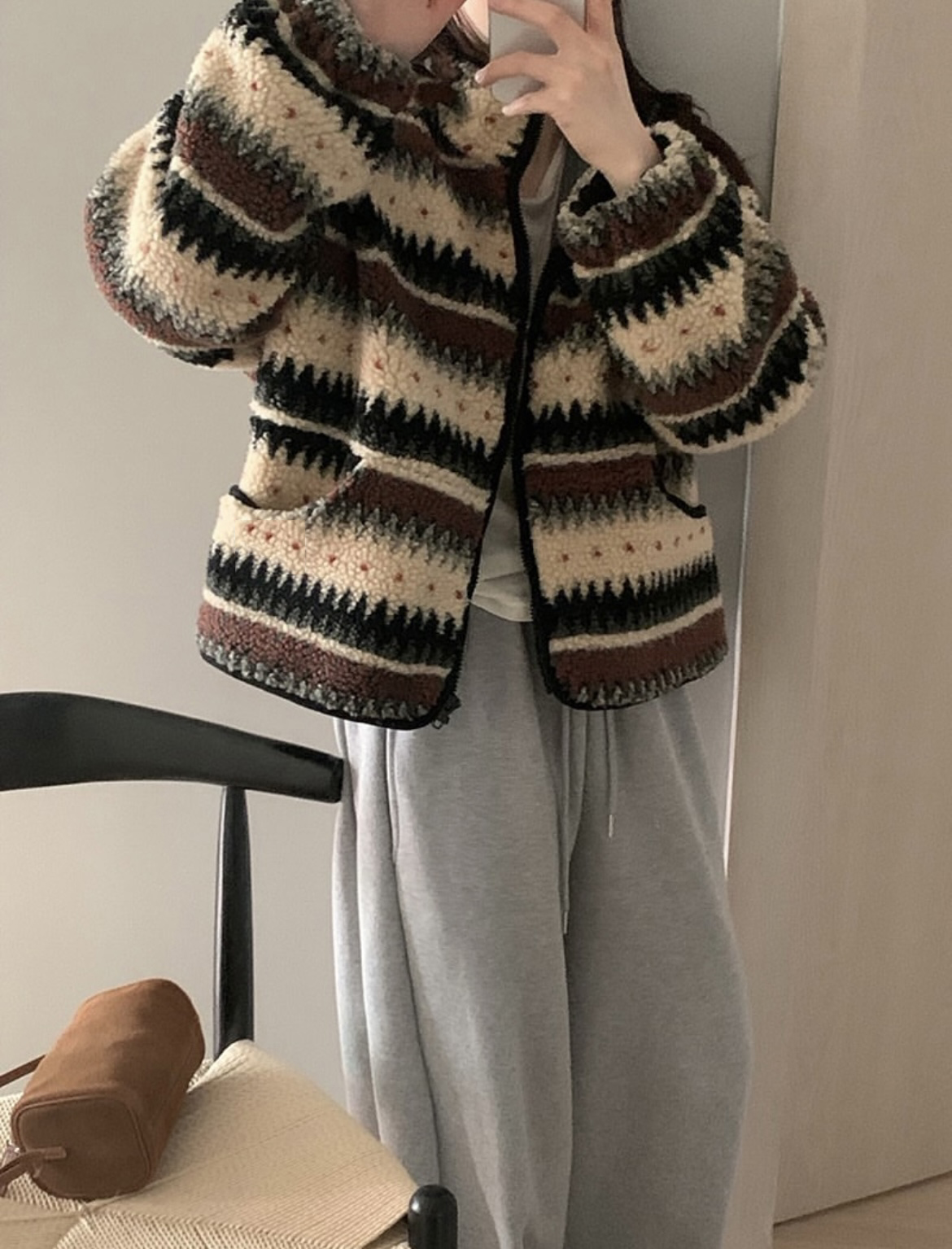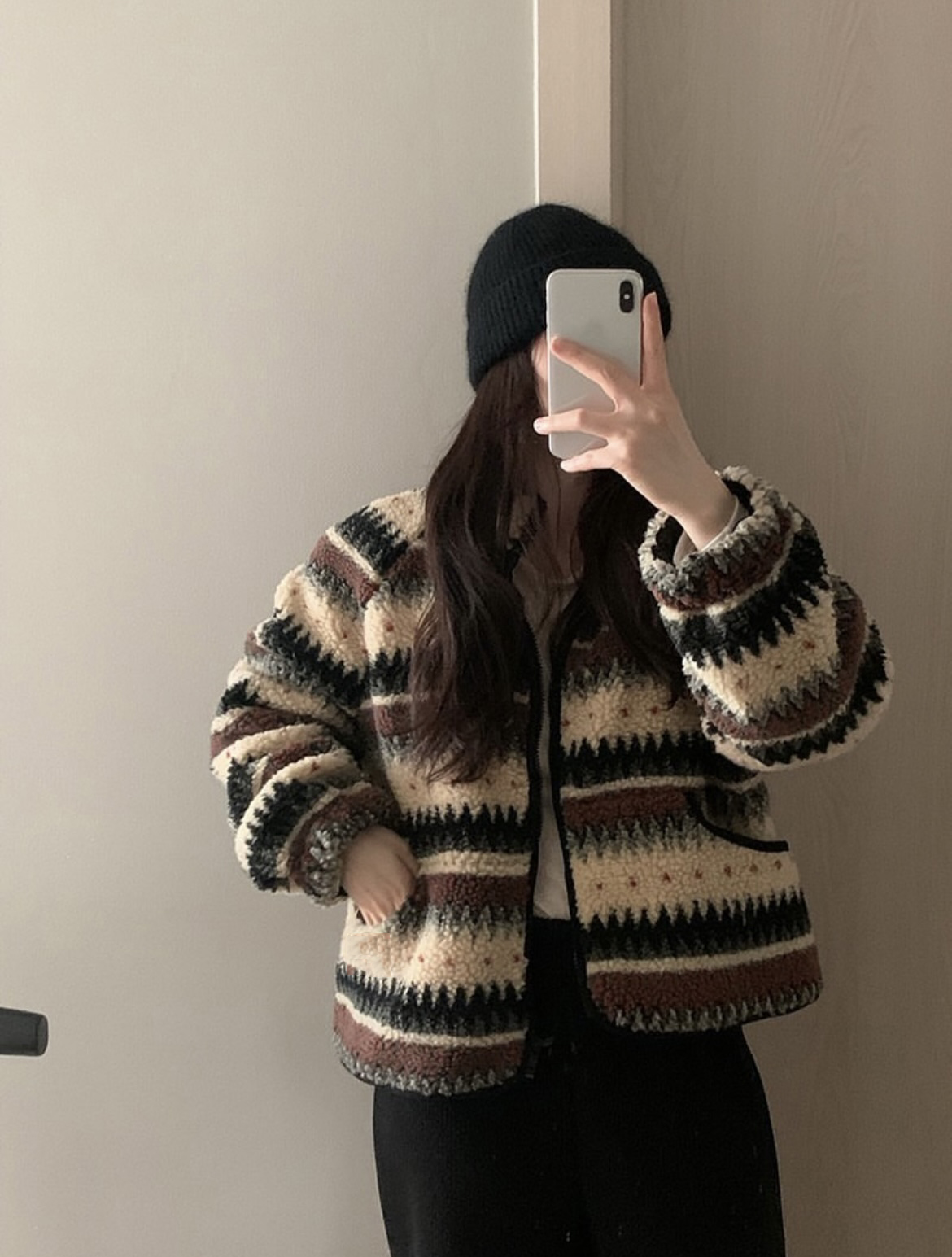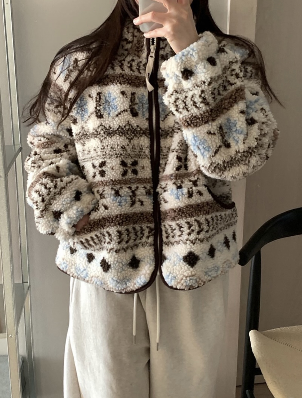 尺寸已更新冬日氛围复古费尔岛北欧风立领羊羔毛摇粒绒保暖短外套