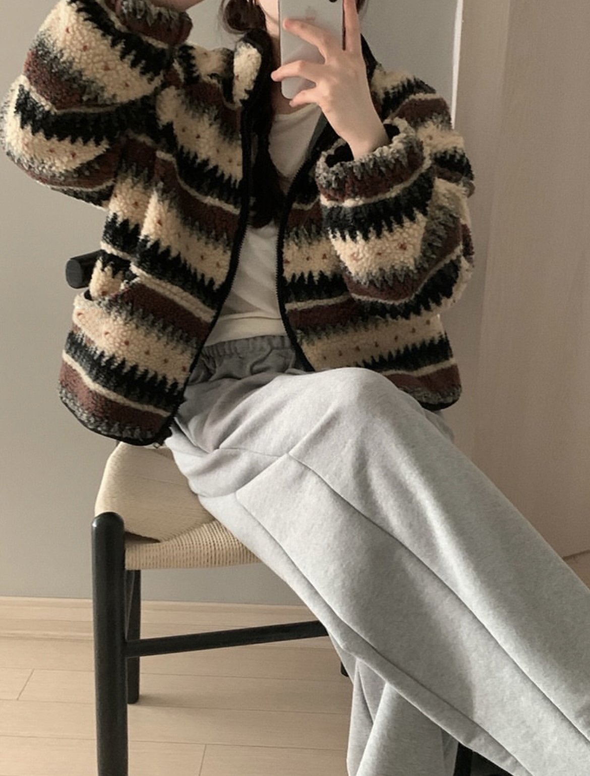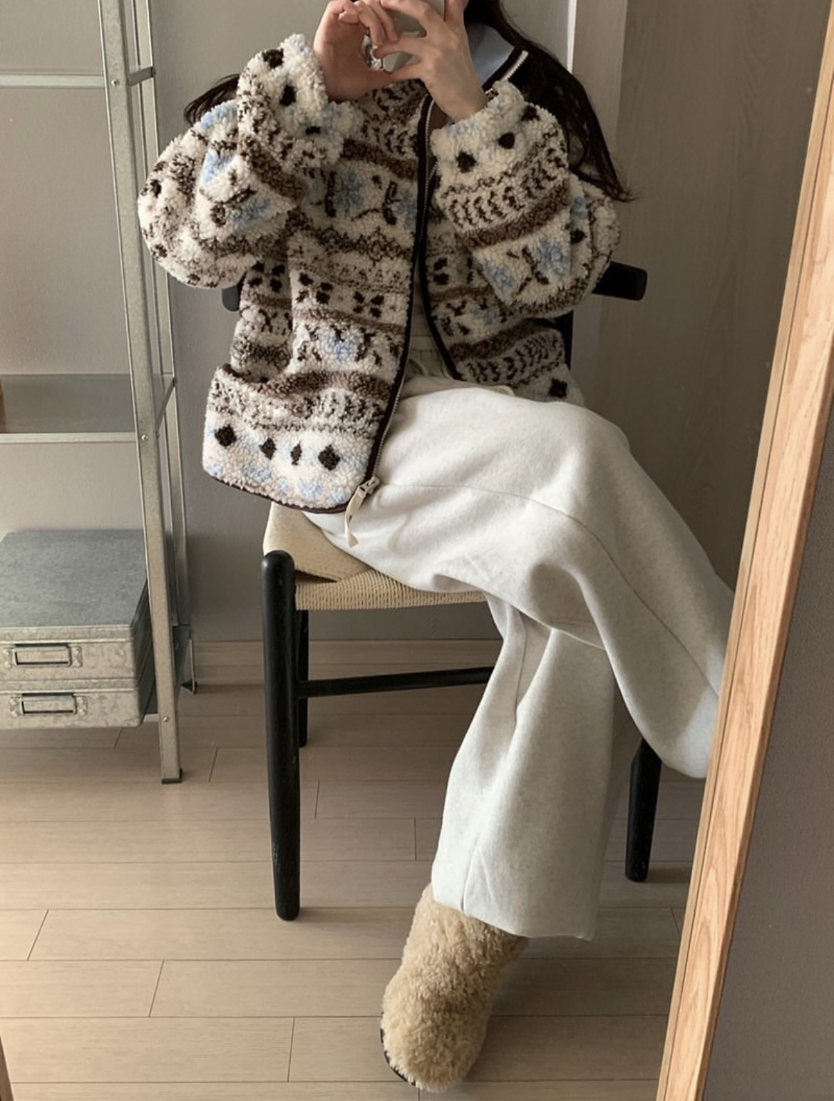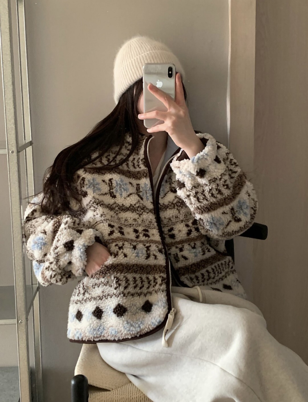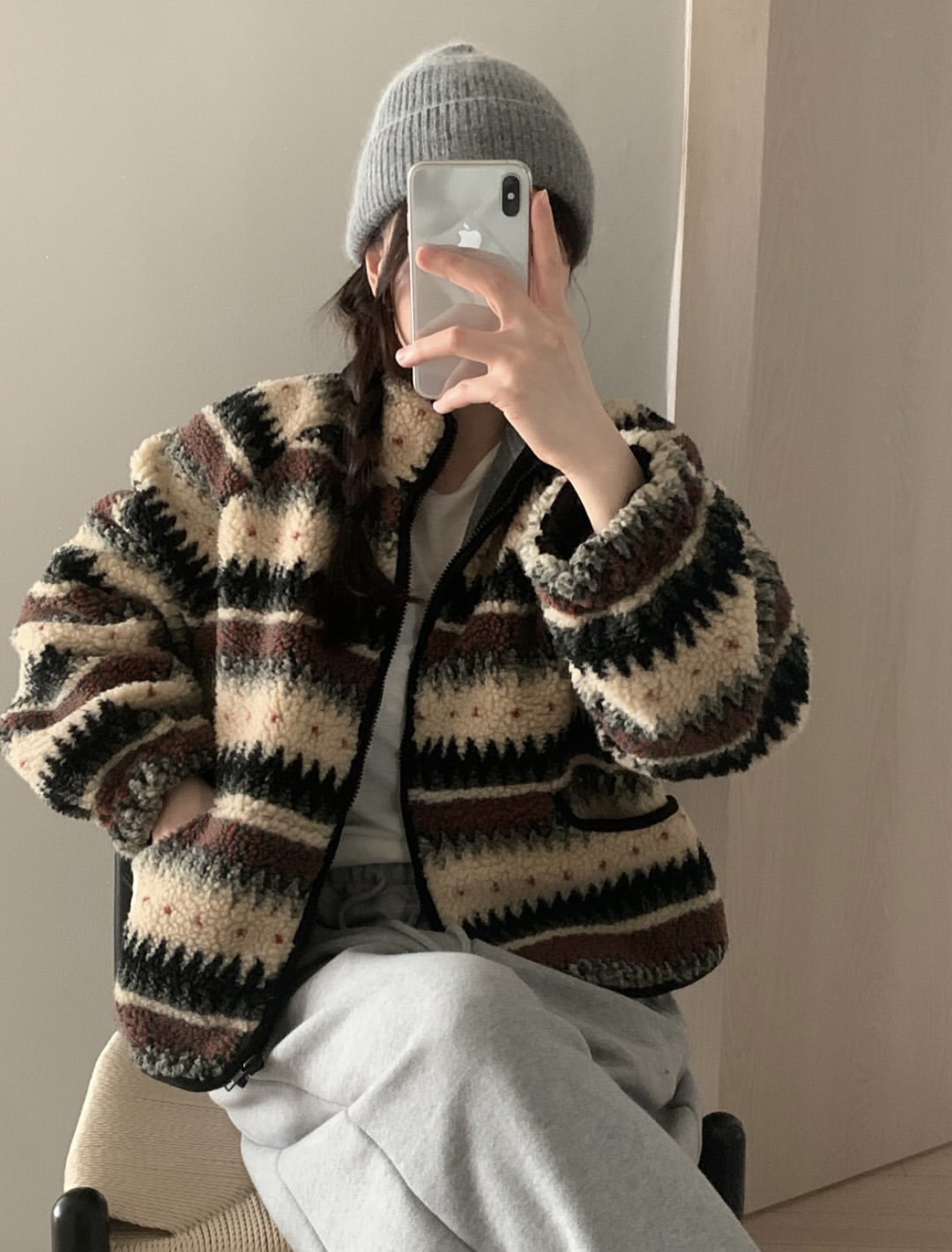尺寸已更新冬日氛围复古费尔岛北欧风立领羊羔毛摇粒绒保暖短外套