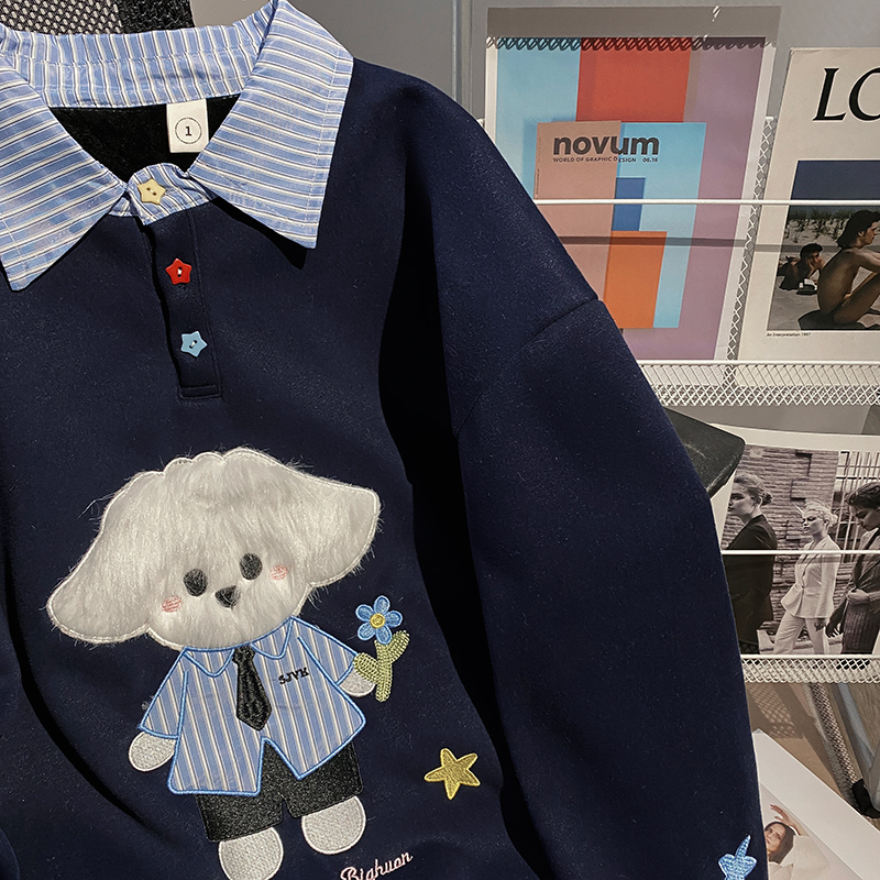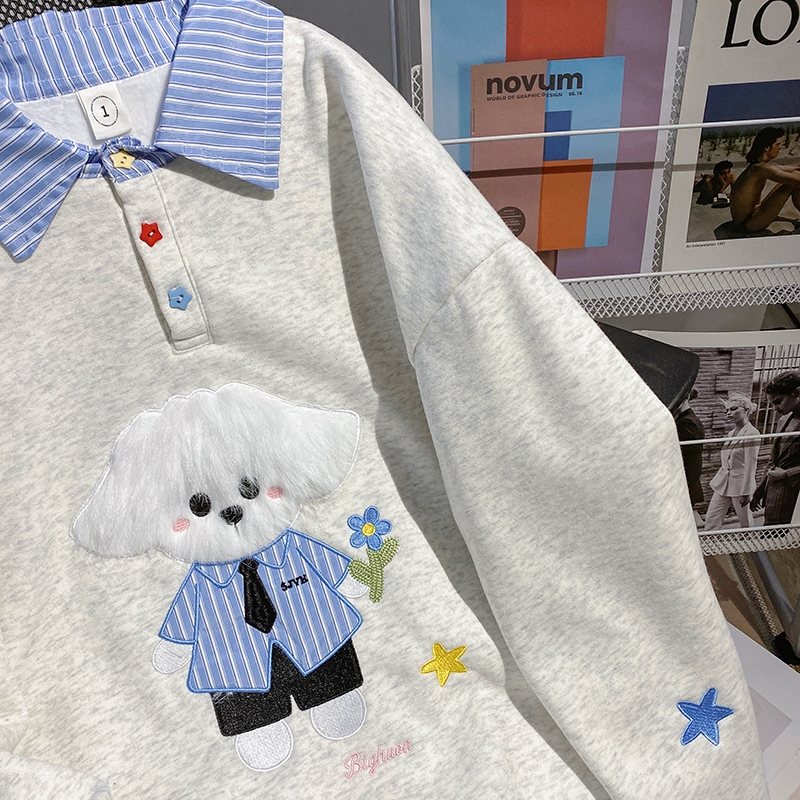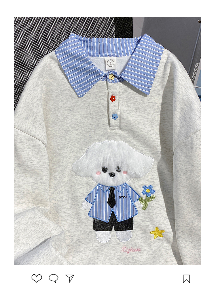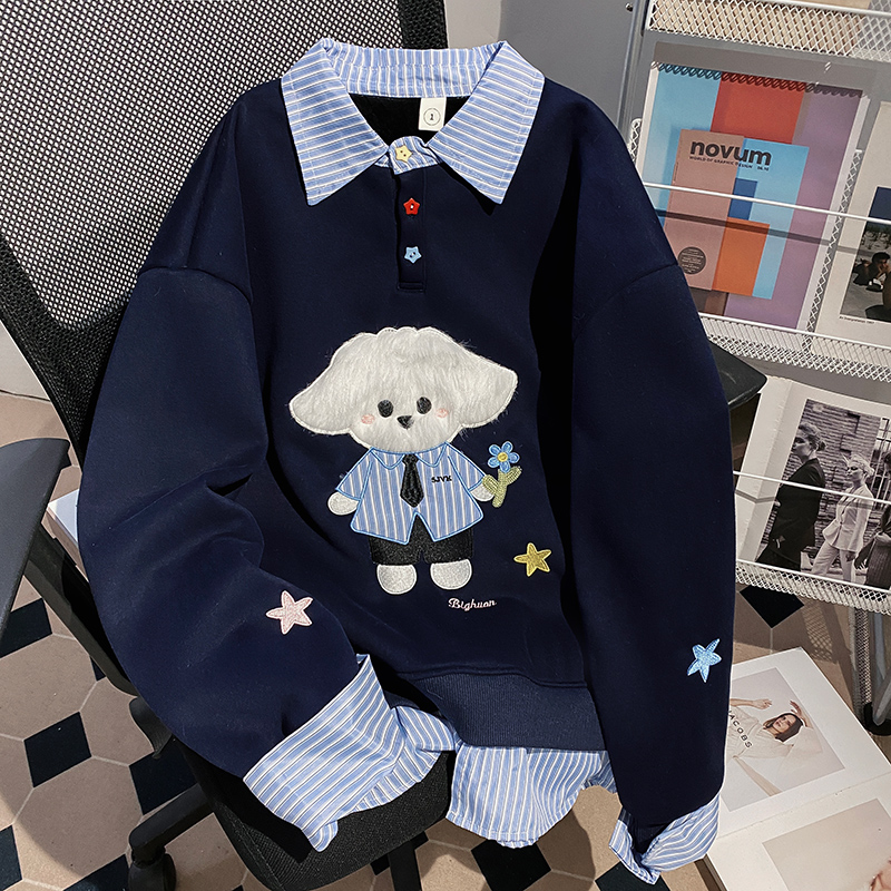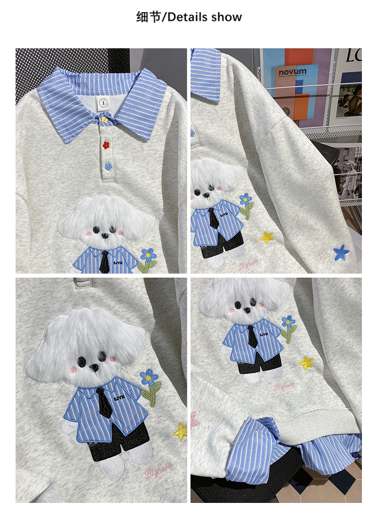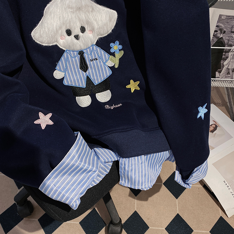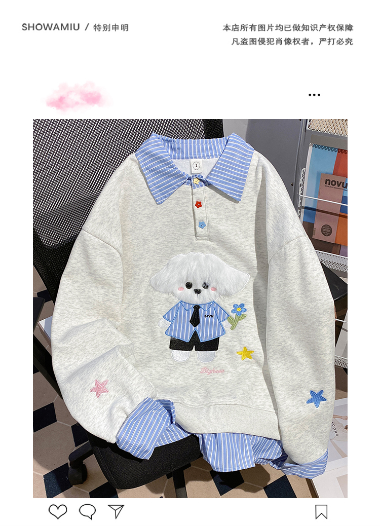 实拍实价假两件卫衣女新款加绒秋冬卡通刺绣花宽松POLO领保暖上衣