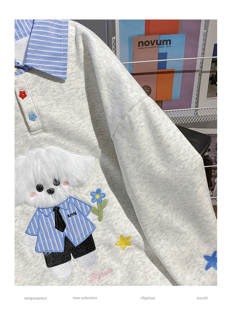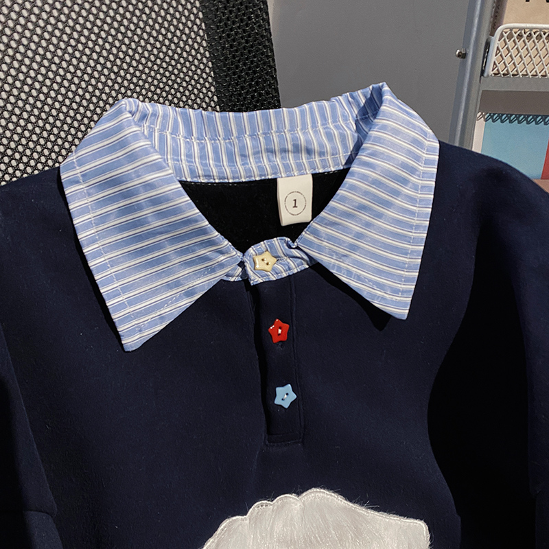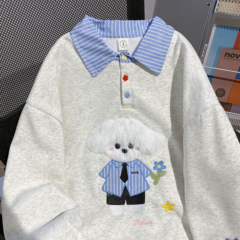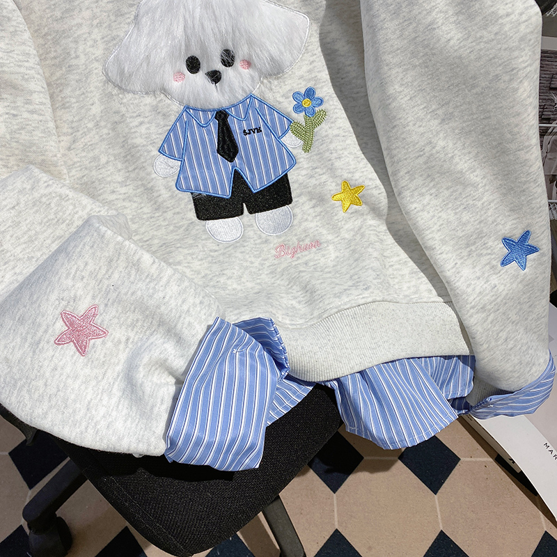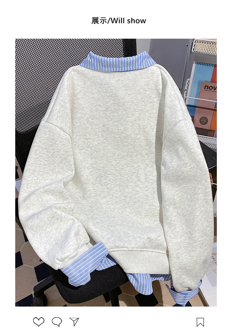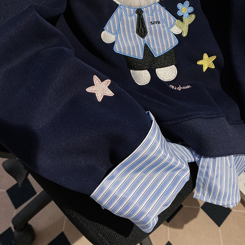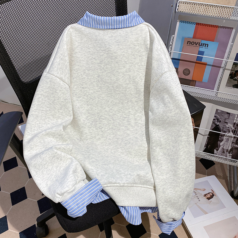实拍实价假两件卫衣女新款加绒秋冬卡通刺绣花宽松POLO领保暖上衣