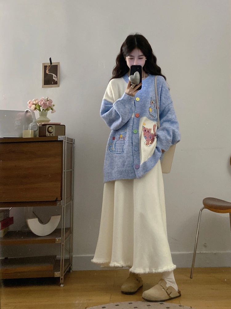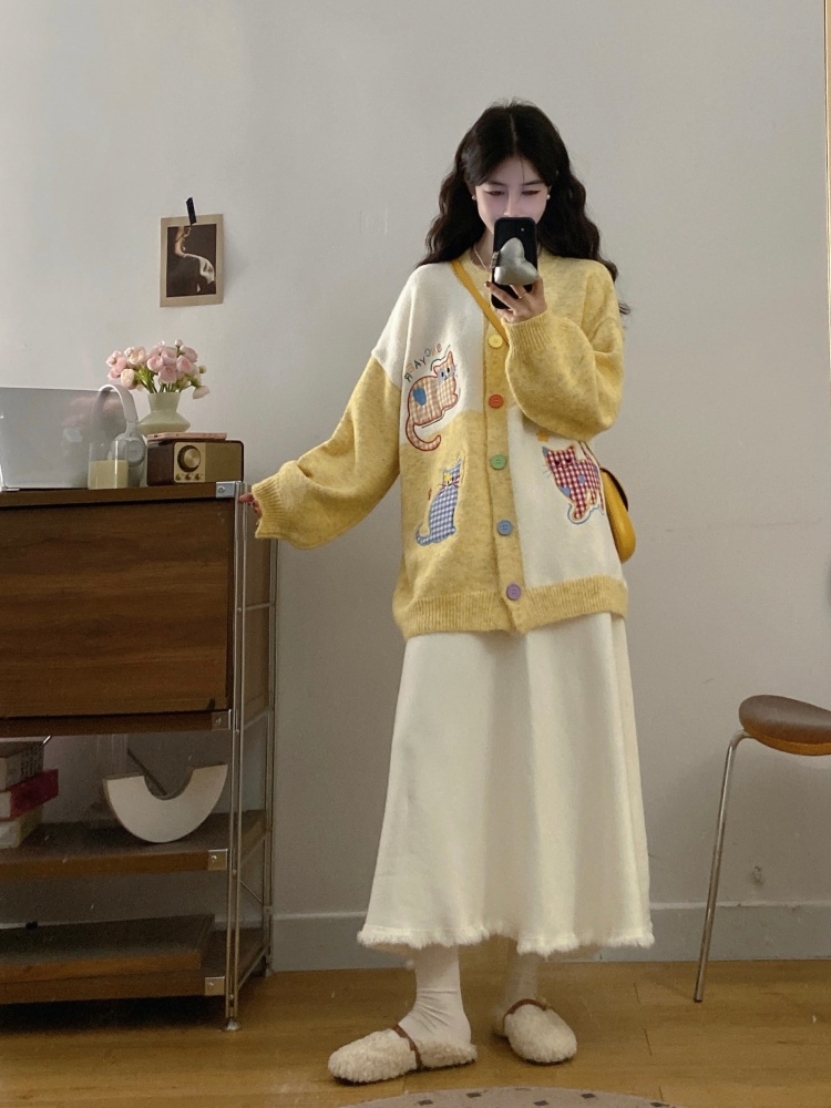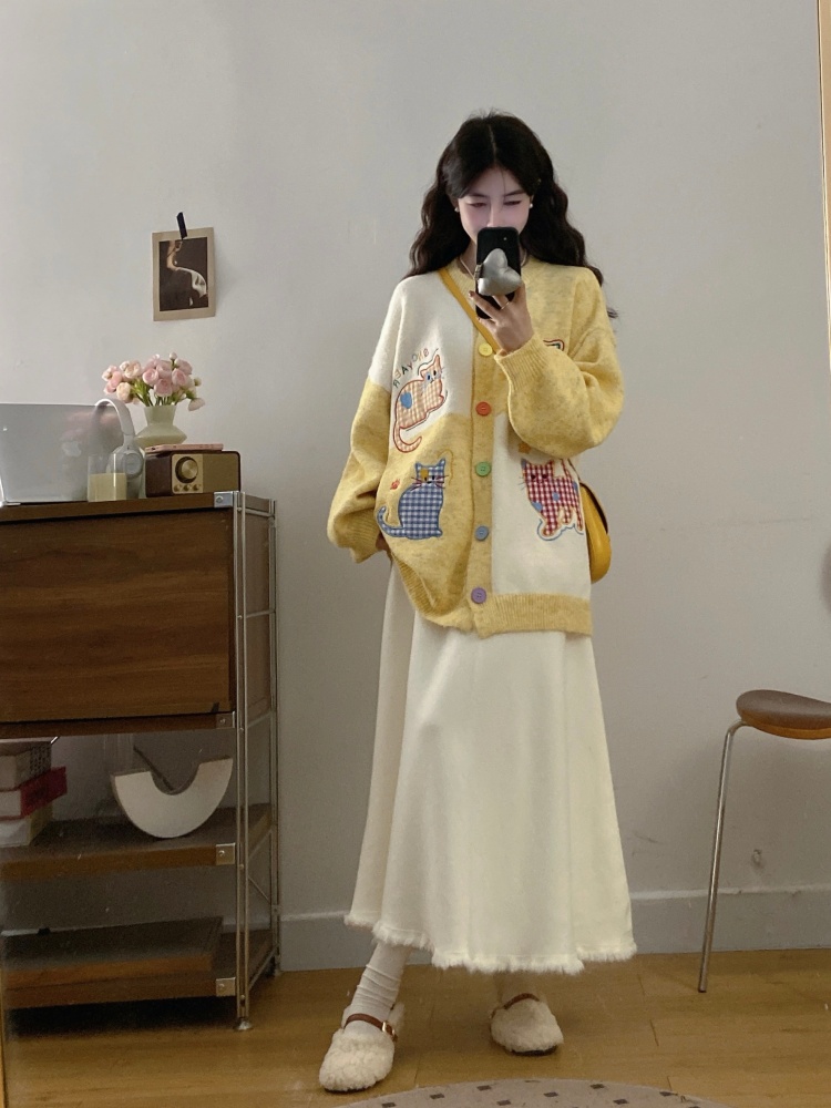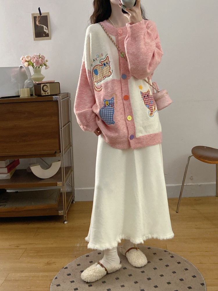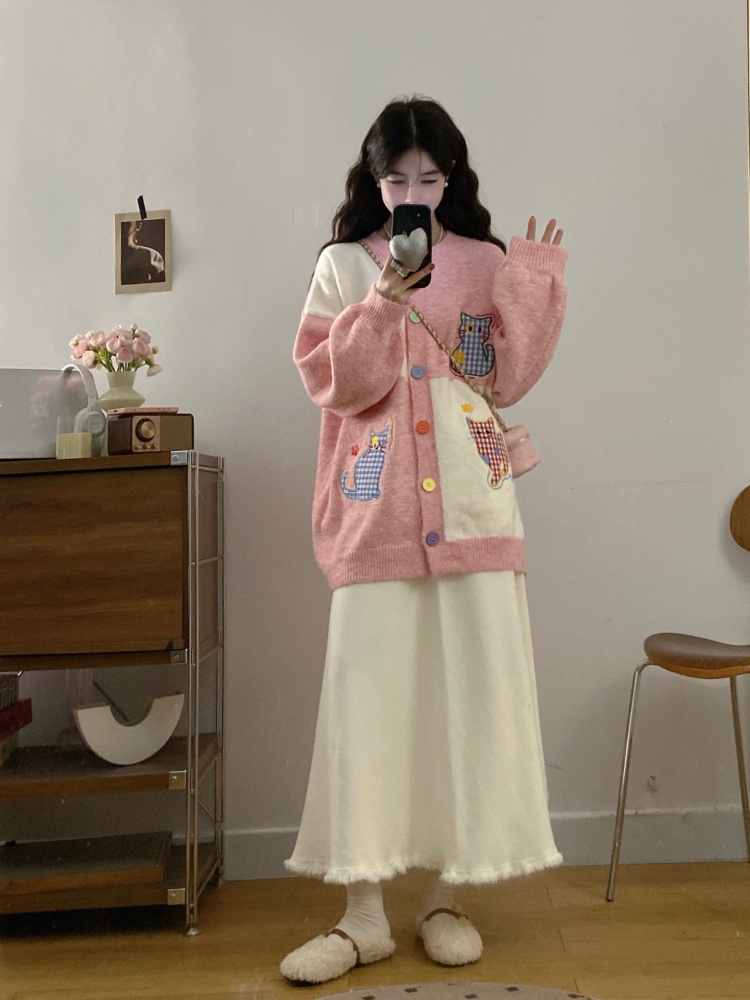 实拍大码甜美可爱风刺绣猫咪撞色针织毛衣开衫+针织半身裙两件套