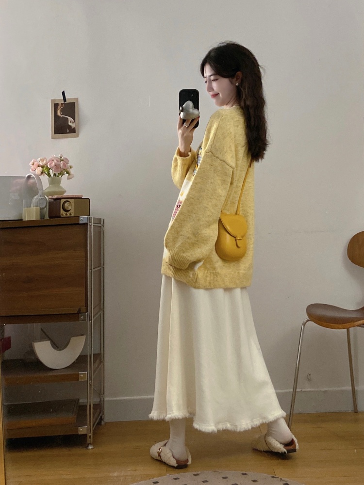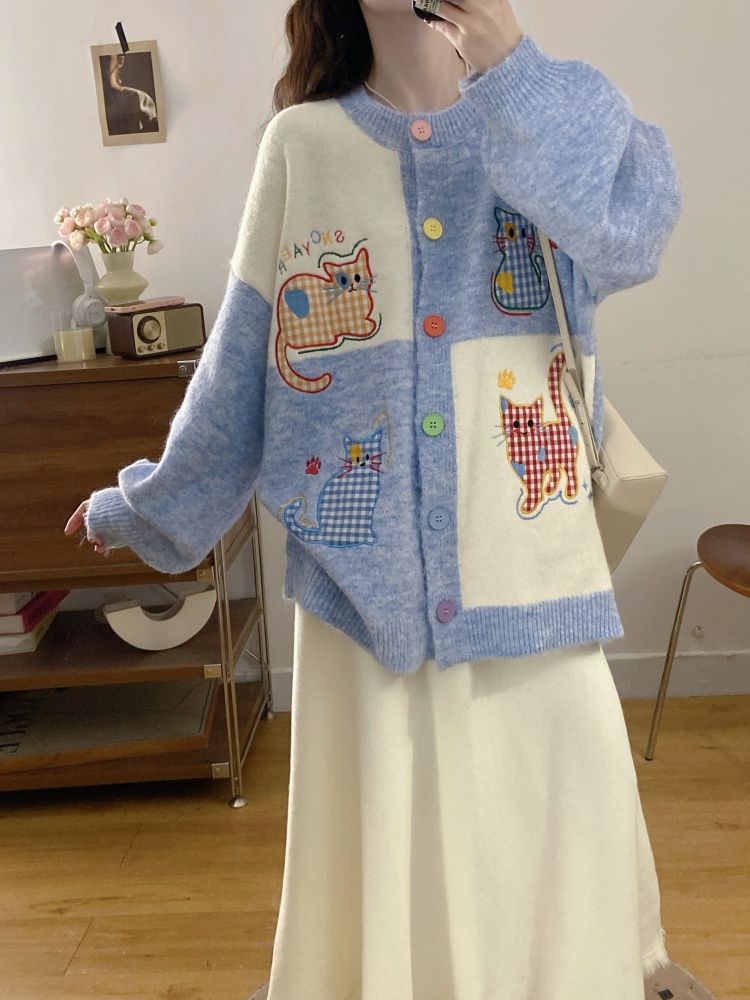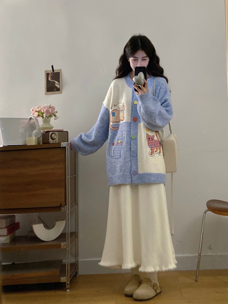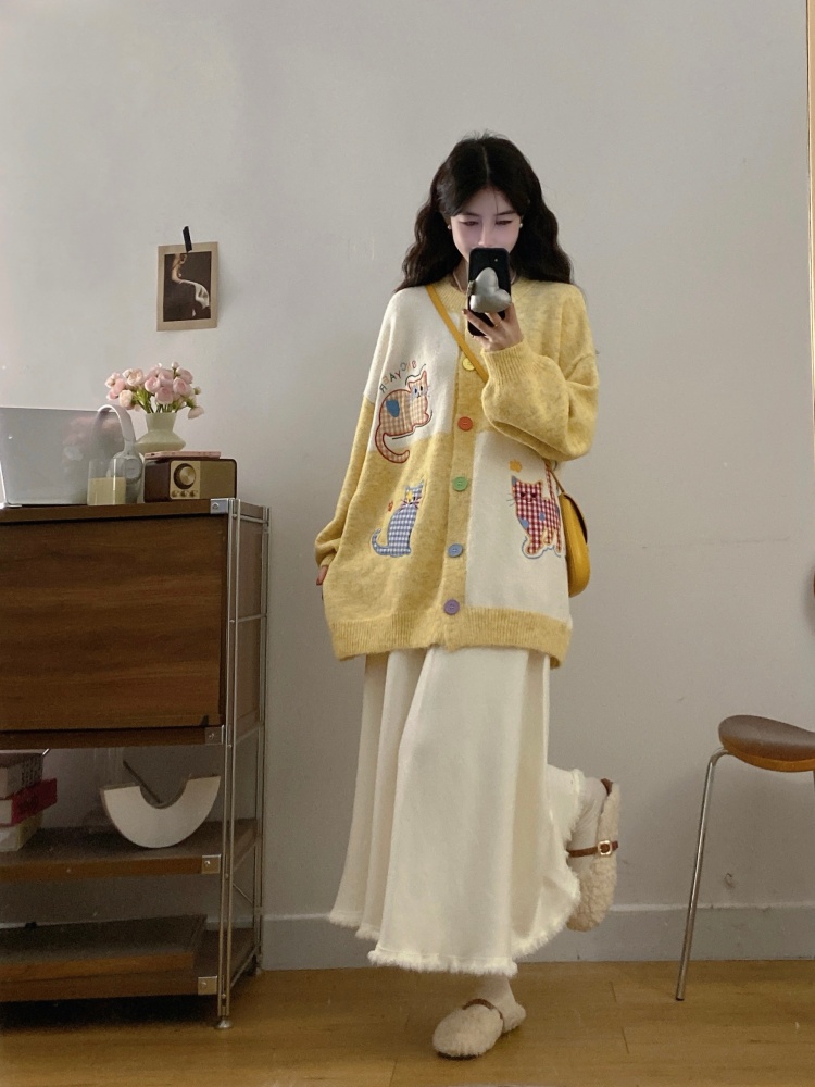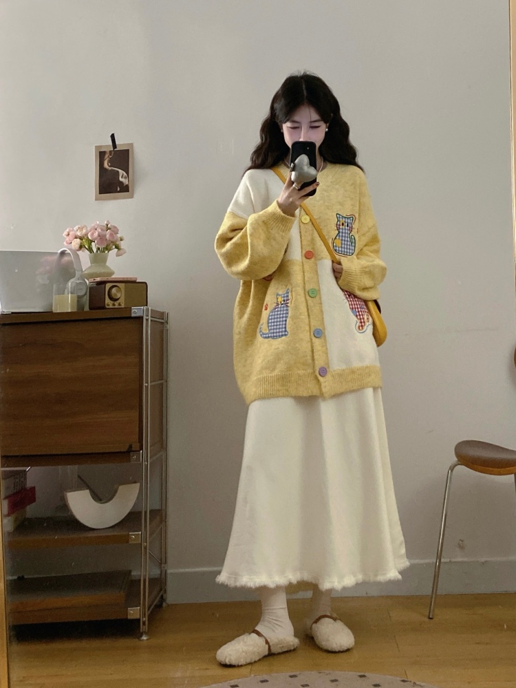 实拍大码甜美可爱风刺绣猫咪撞色针织毛衣开衫+针织半身裙两件套