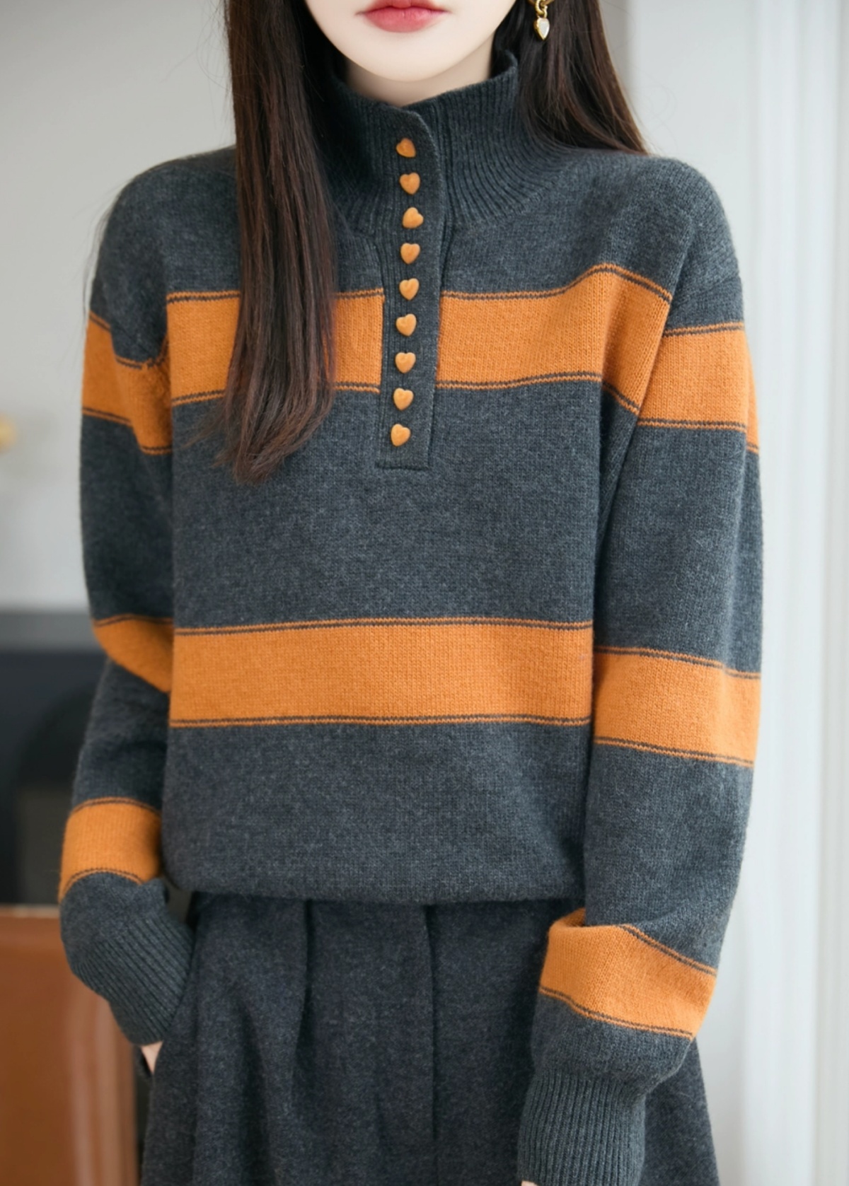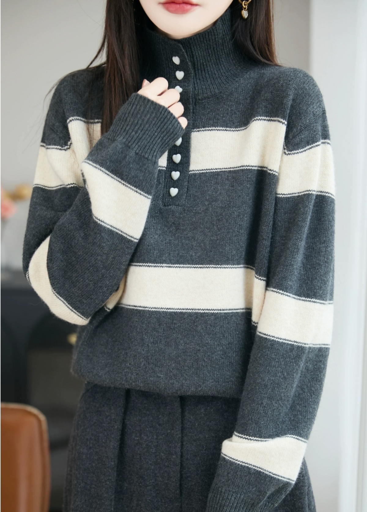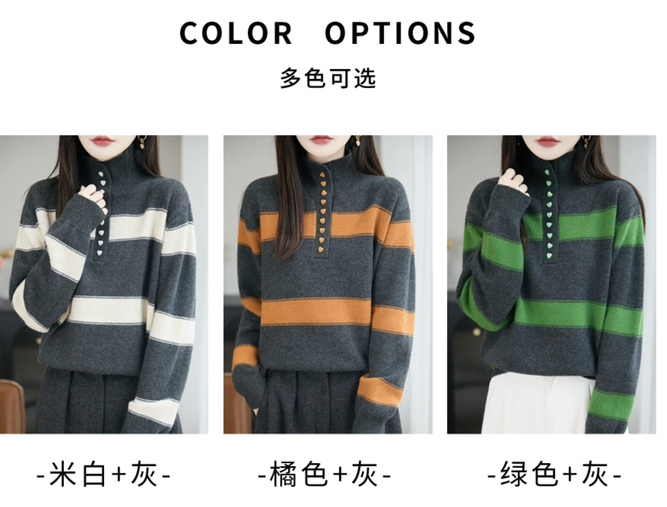 复古条纹撞色半高领毛衣女2025秋冬纽扣半开领加厚保暖打底针织衫