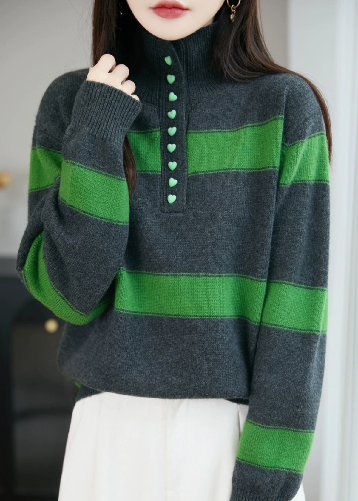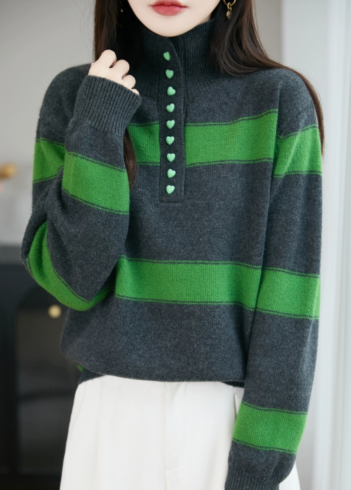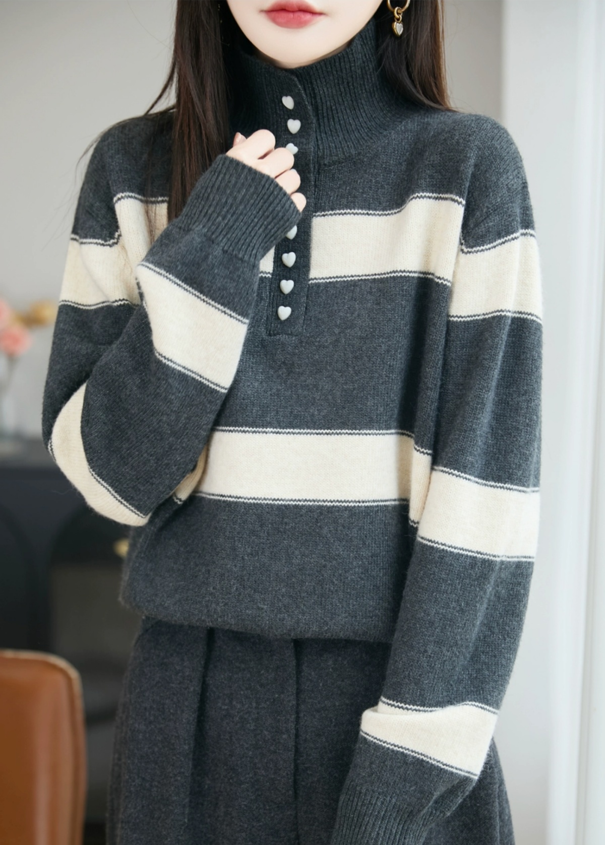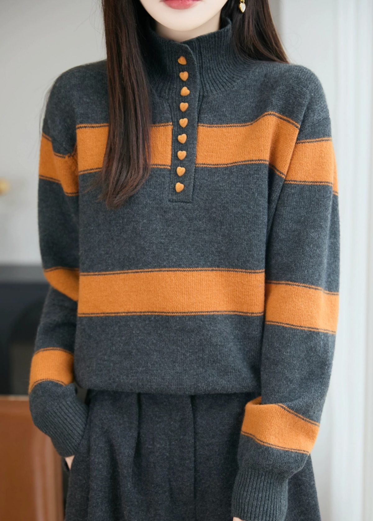 复古条纹撞色半高领毛衣女2025秋冬纽扣半开领加厚保暖打底针织衫