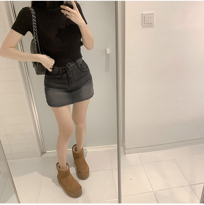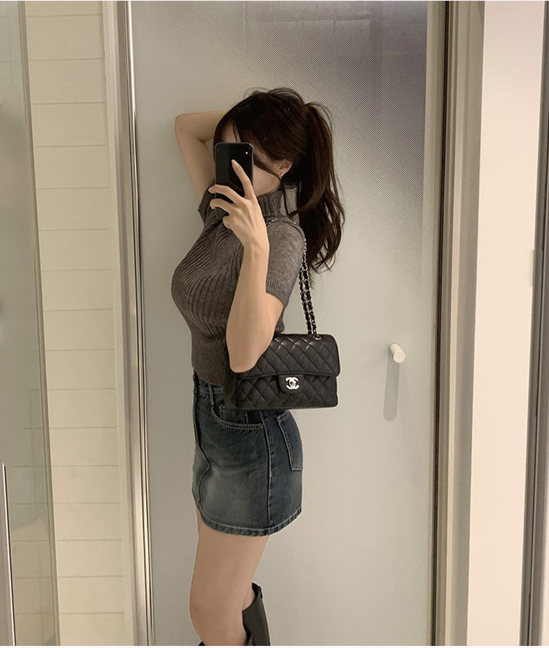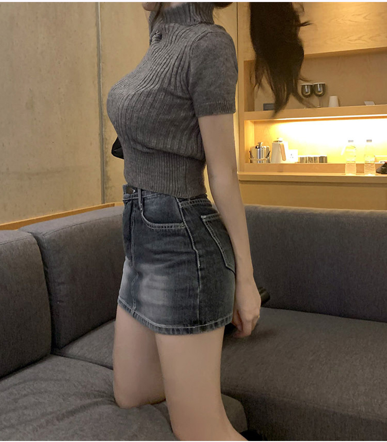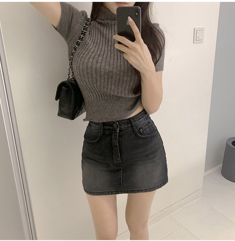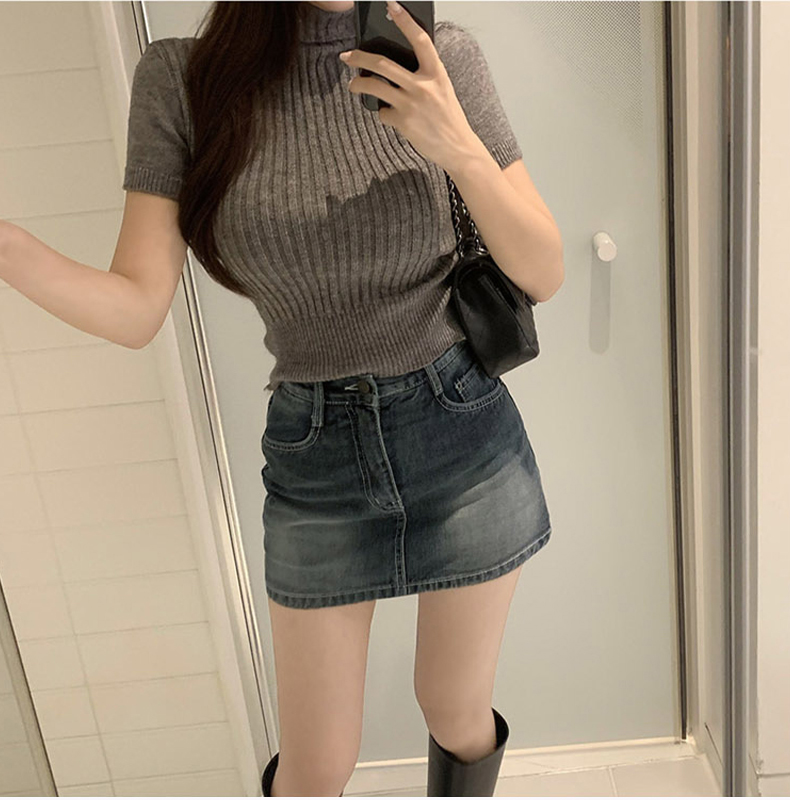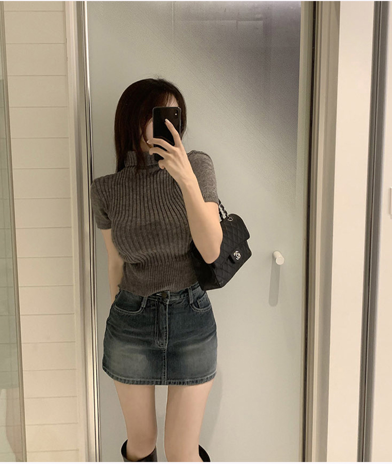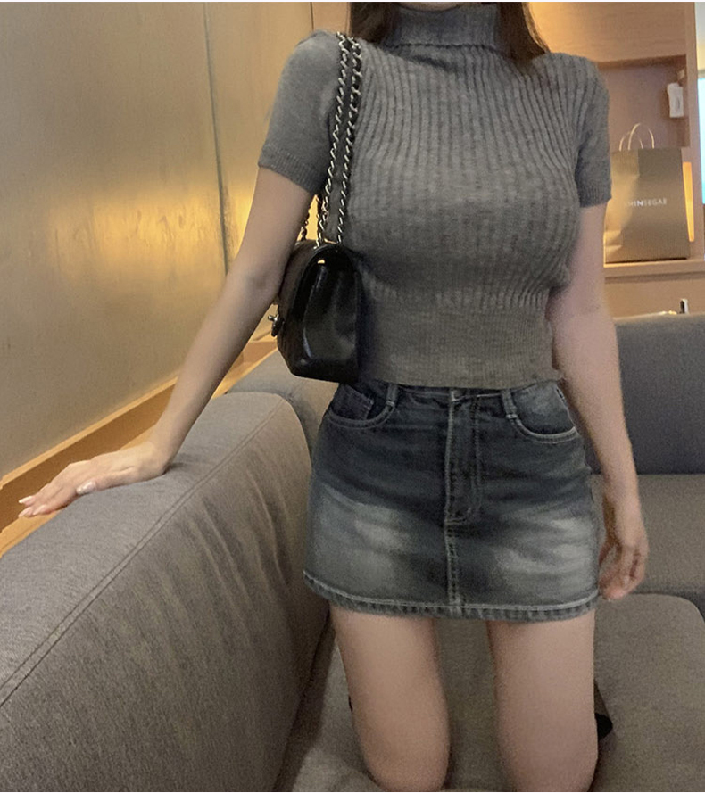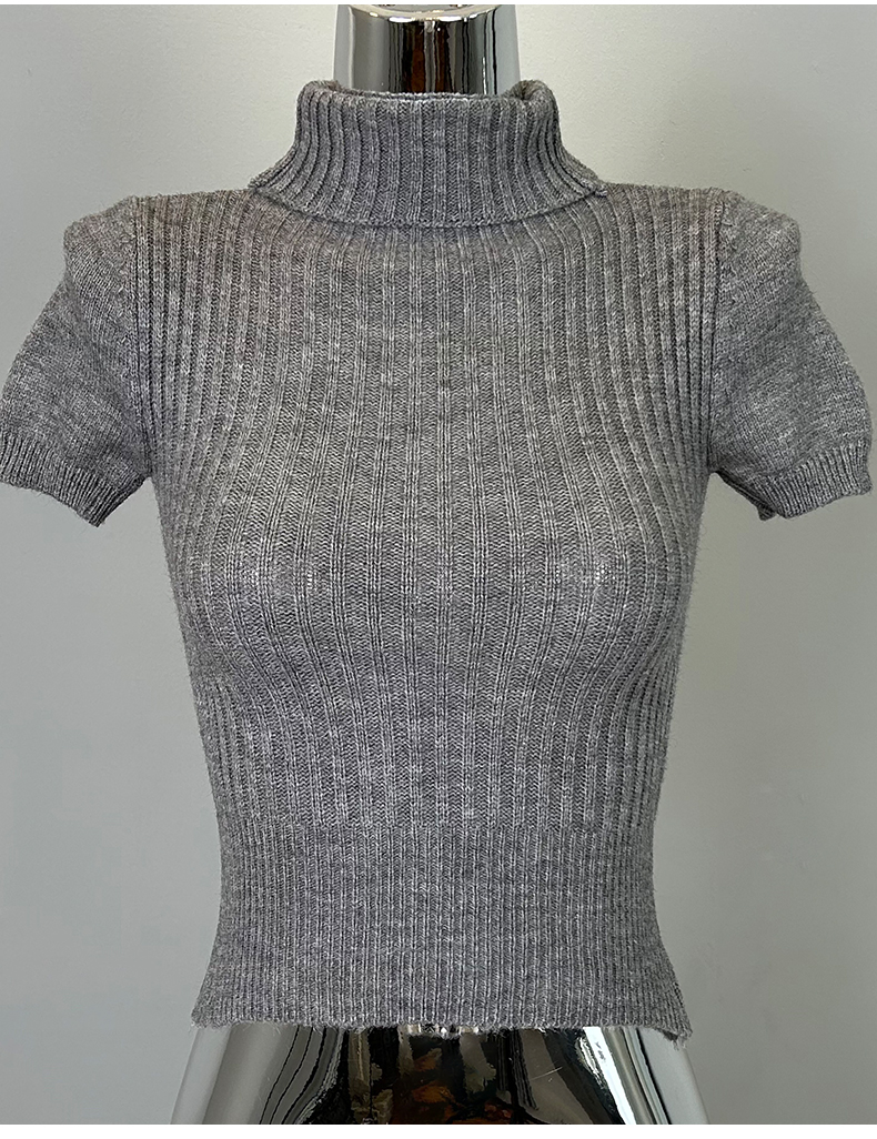 韩国东大门新品 韩系时尚高领纯色百搭套头短袖针织衫