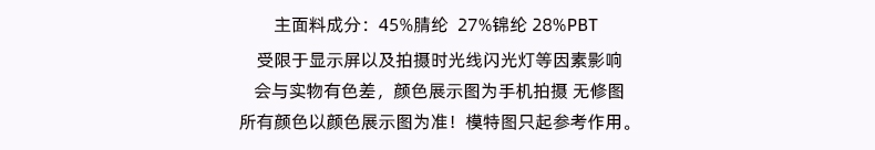 锦纶/尼龙27%;腈纶45%;聚对苯二甲酸乙二酯(涤纶)28%