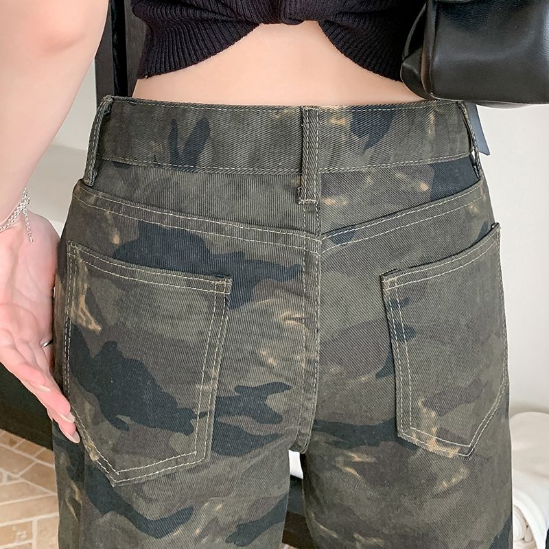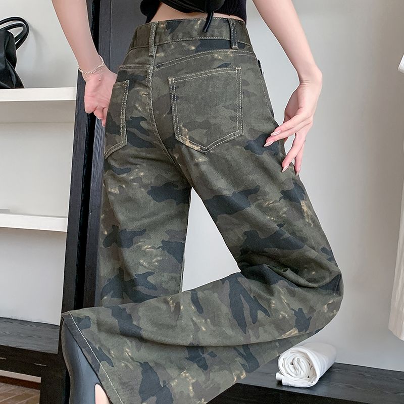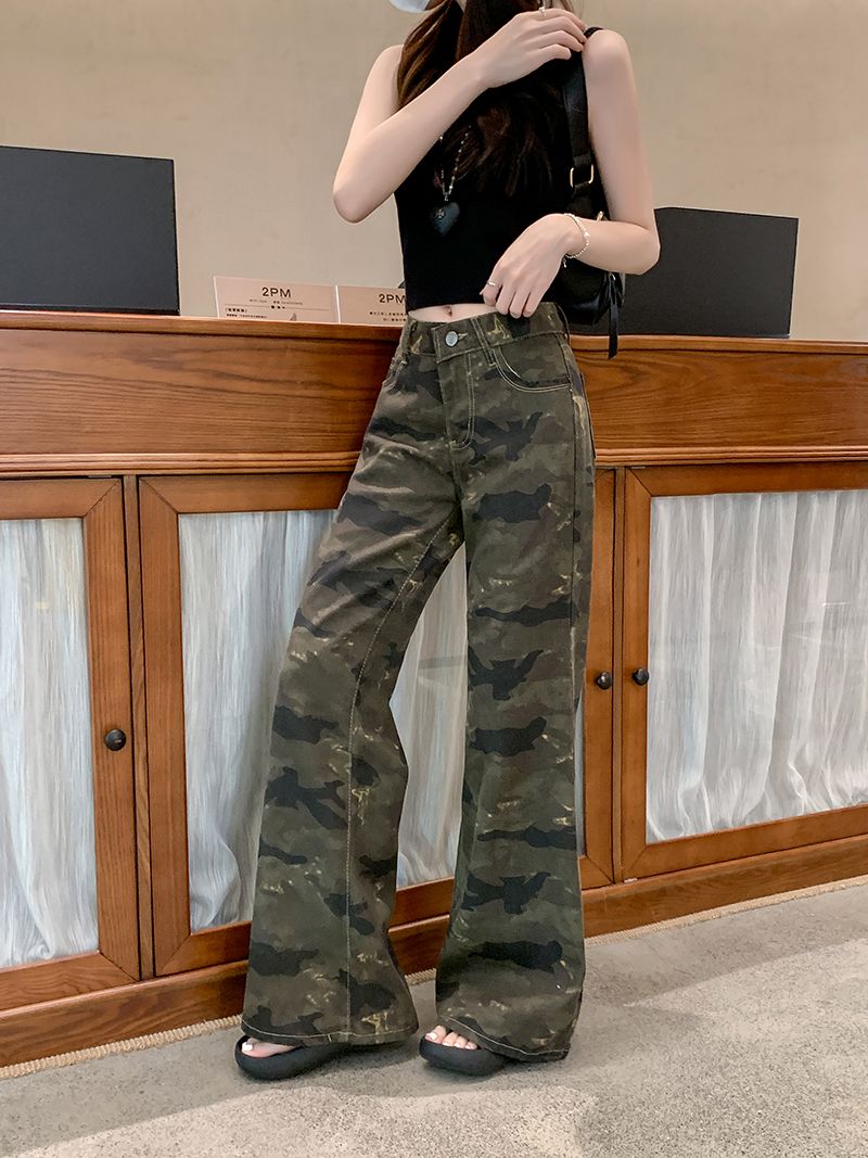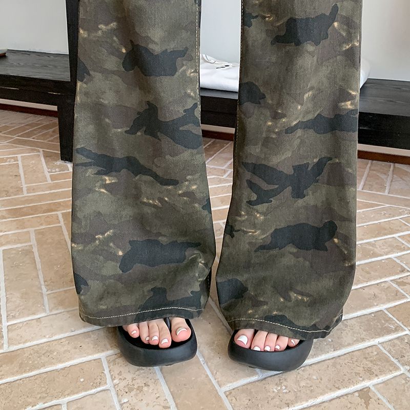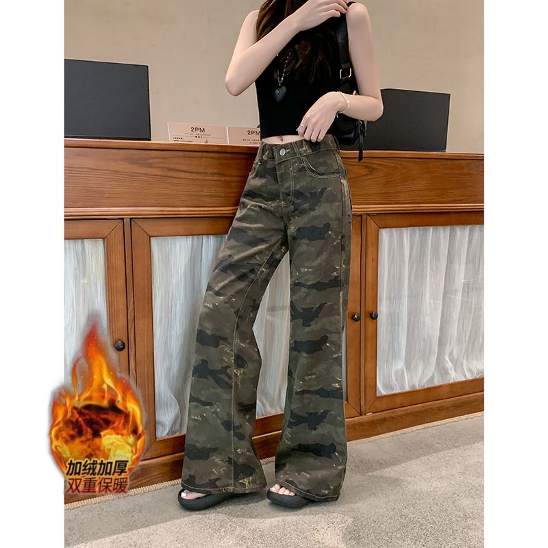 实拍 韩版加绒加厚迷彩微喇牛仔裤女秋冬新款宽松显瘦辣妹直筒裤