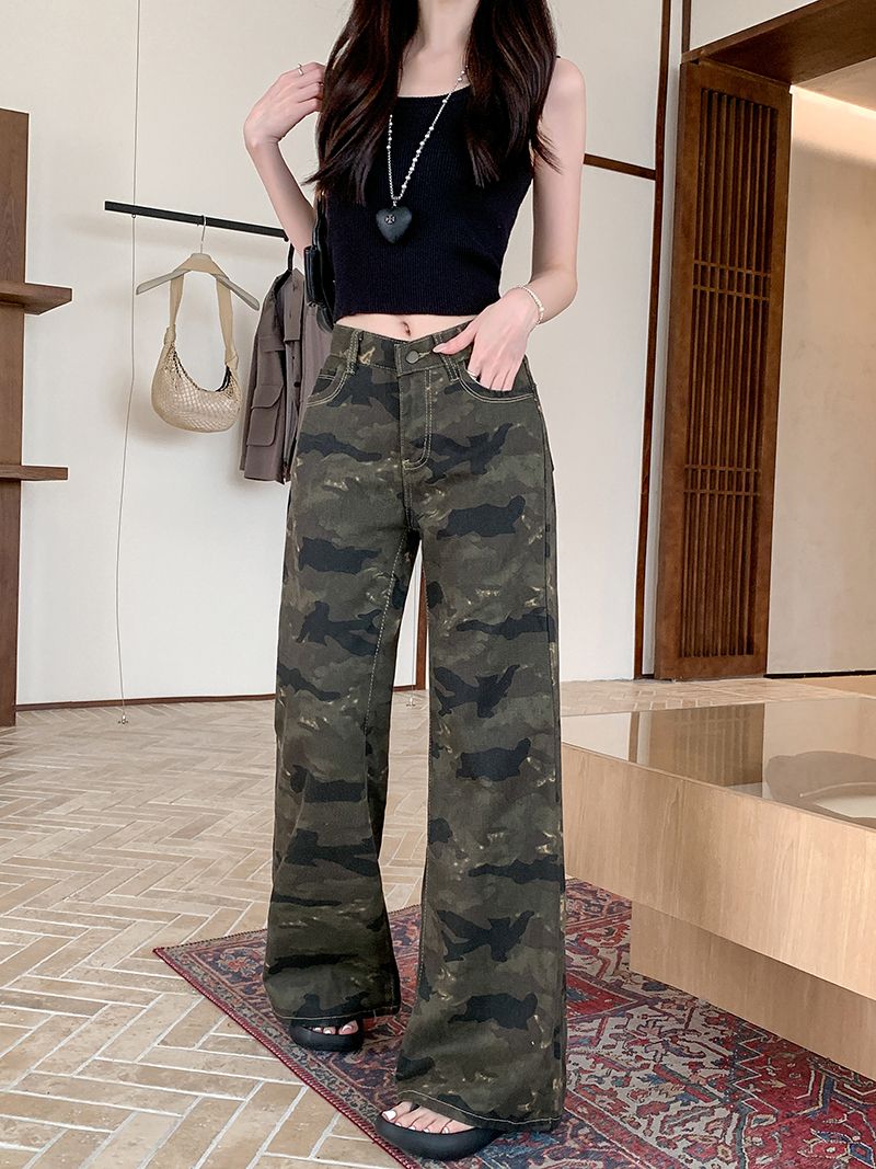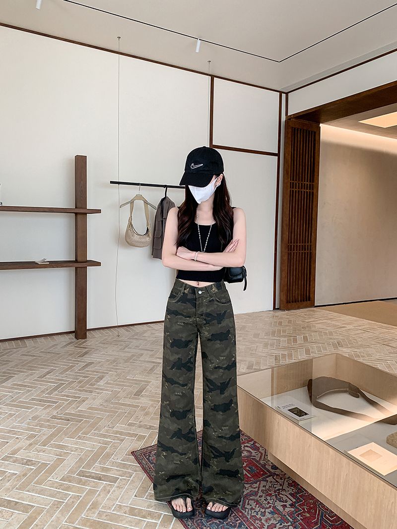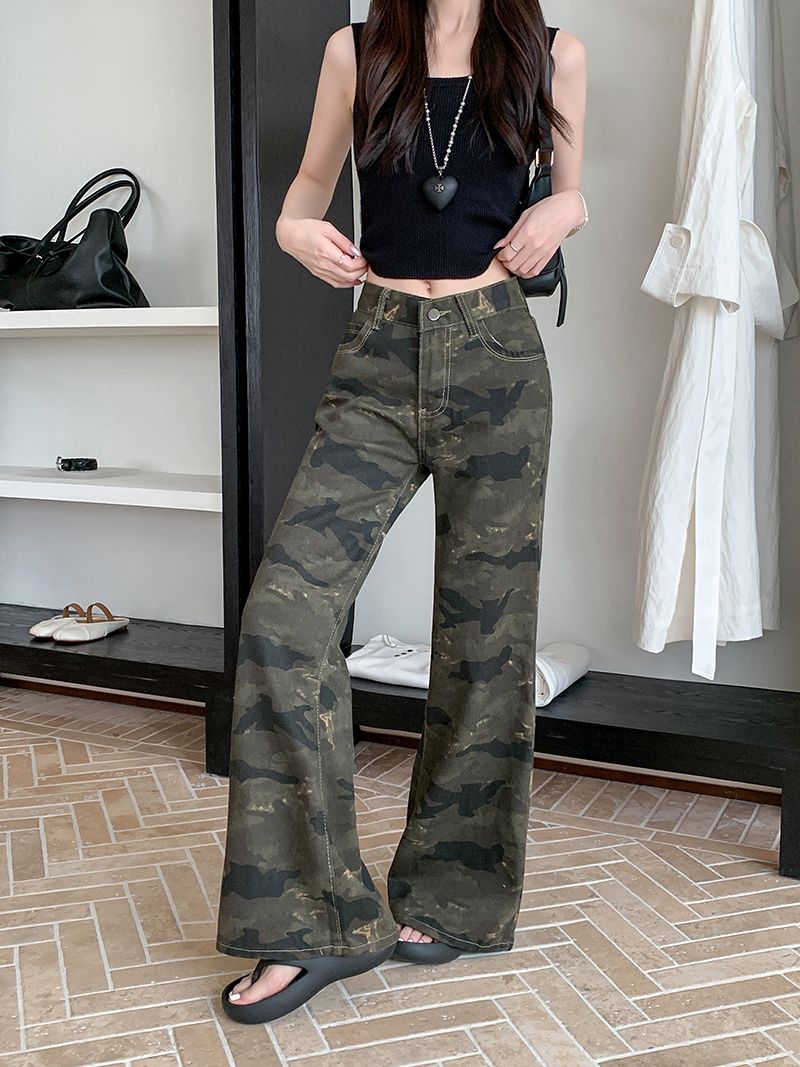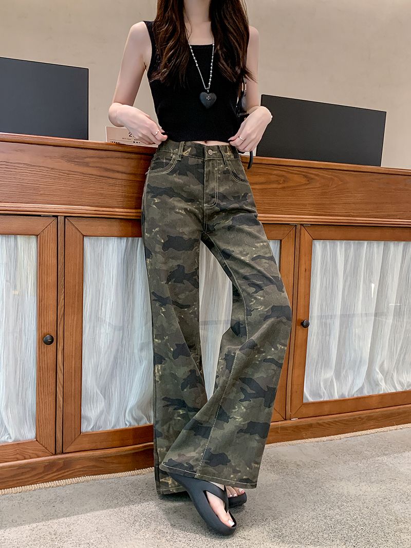 实拍 韩版加绒加厚迷彩微喇牛仔裤女秋冬新款宽松显瘦辣妹直筒裤