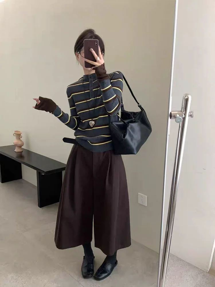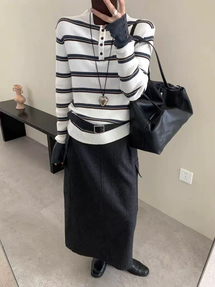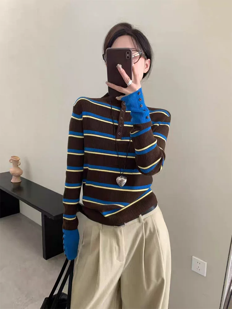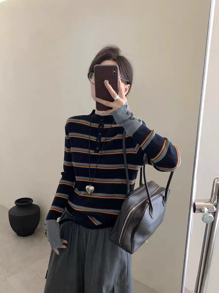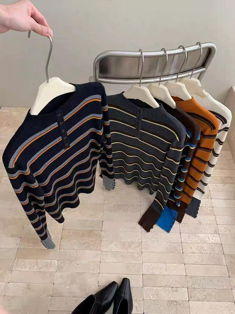 秋冬时尚撞色条纹圆领长袖针织衫女复古风拼色纽扣长袖打底毛衣