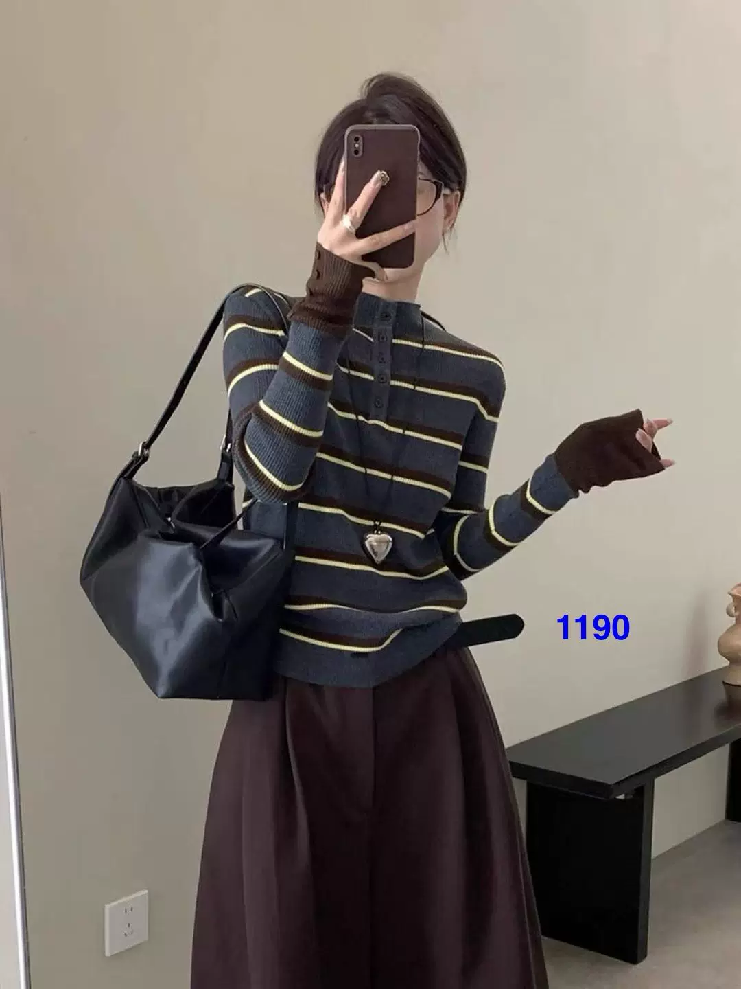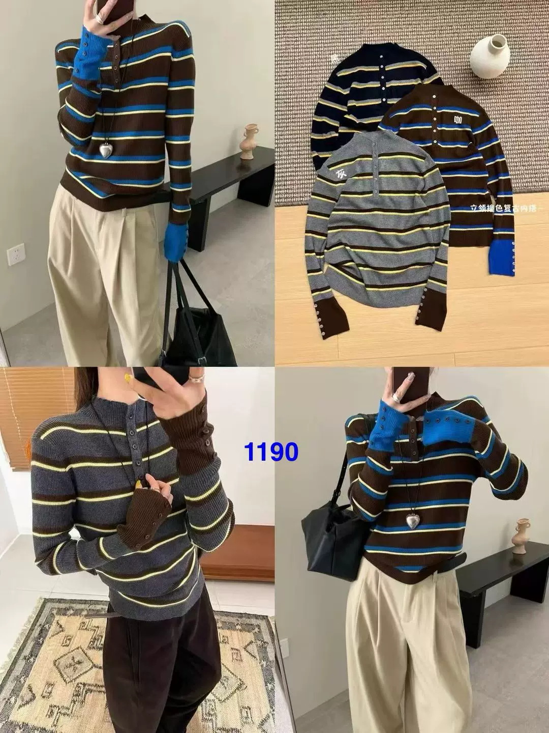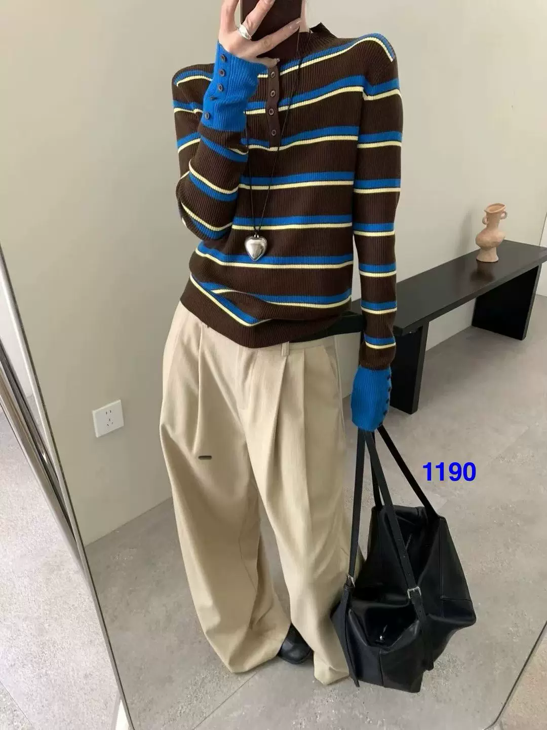 秋冬时尚撞色条纹圆领长袖针织衫女复古风拼色纽扣长袖打底毛衣