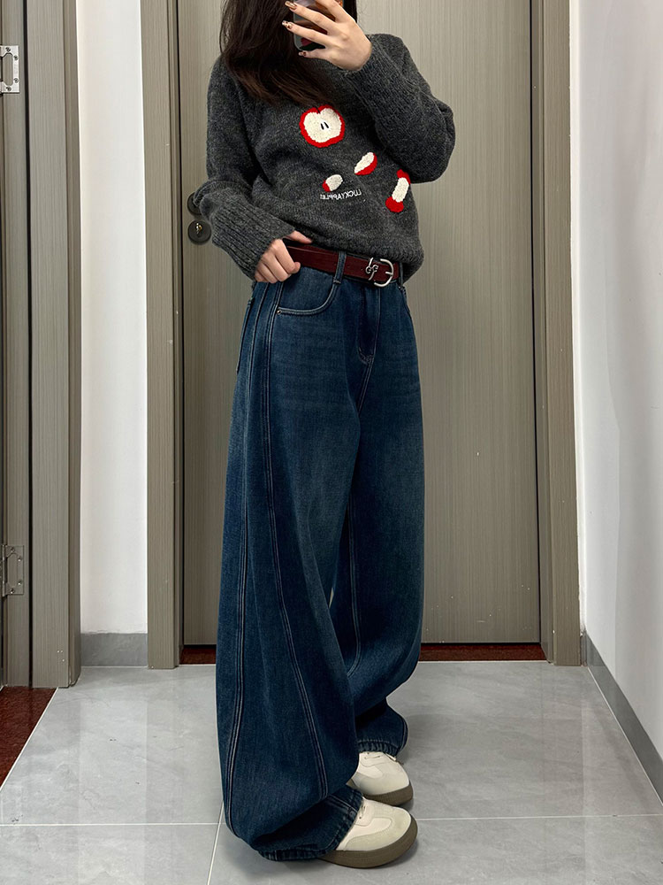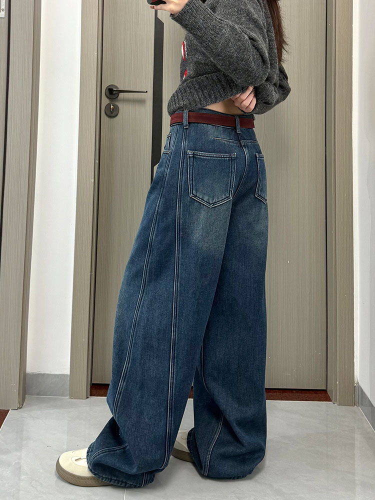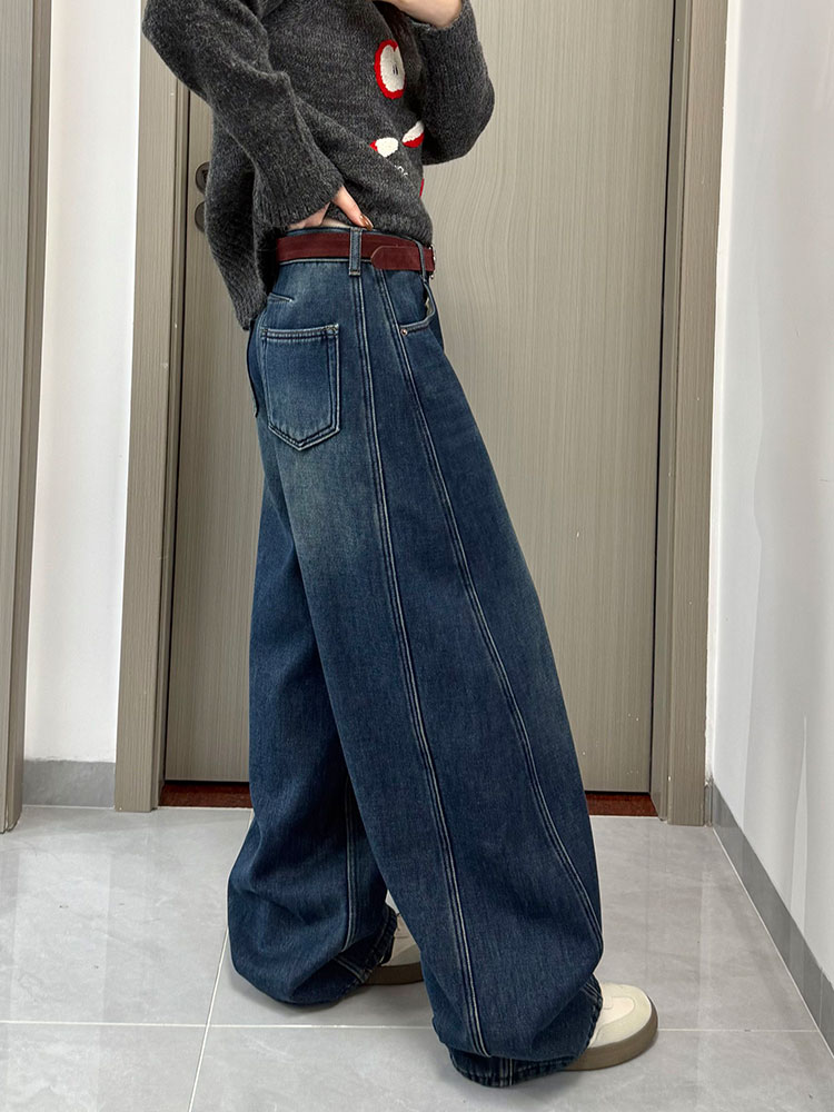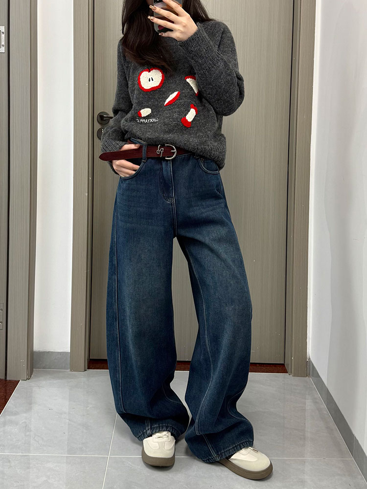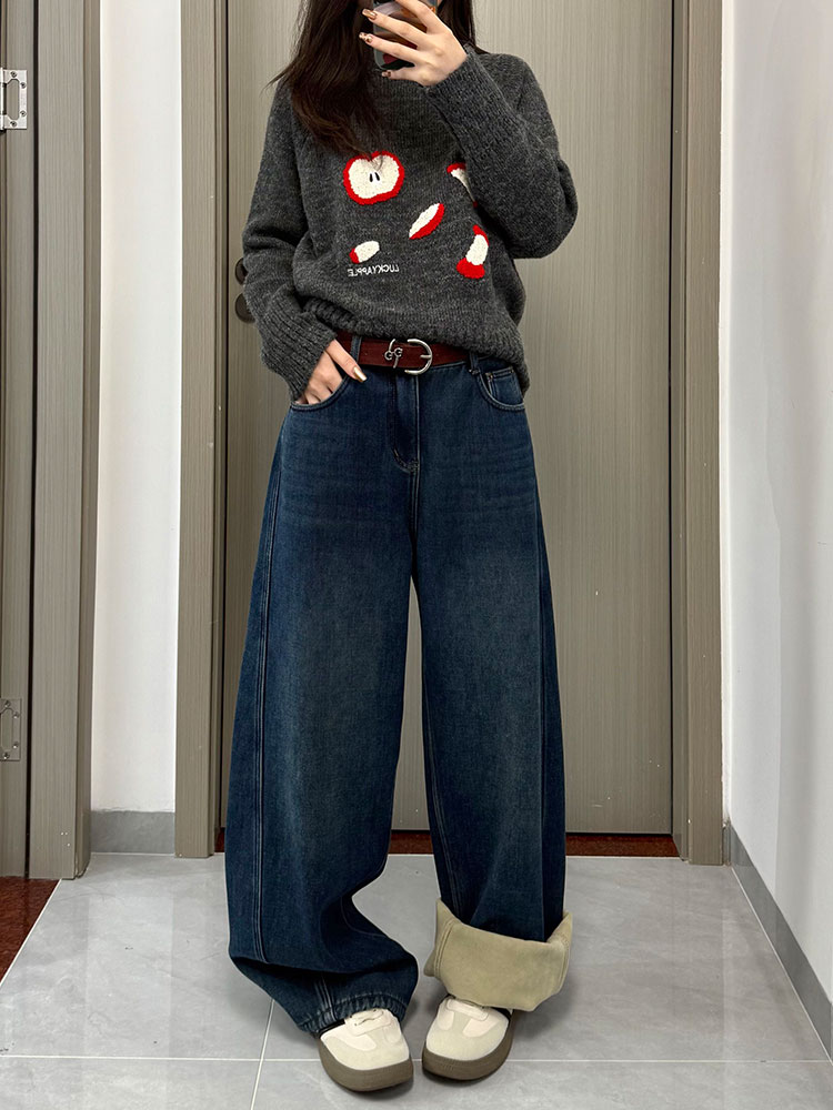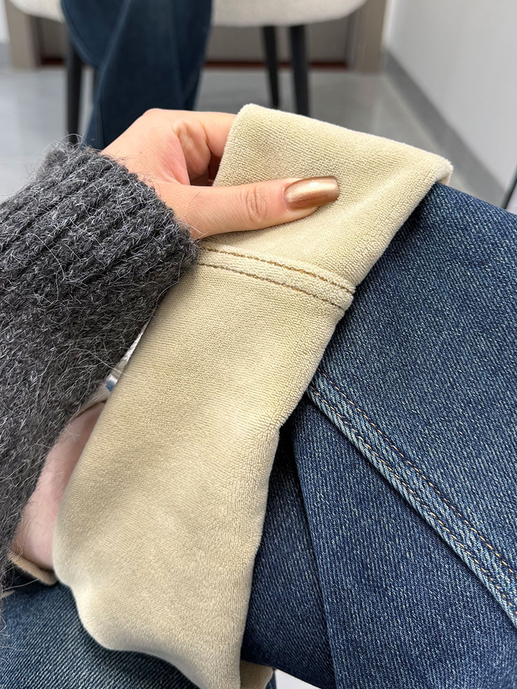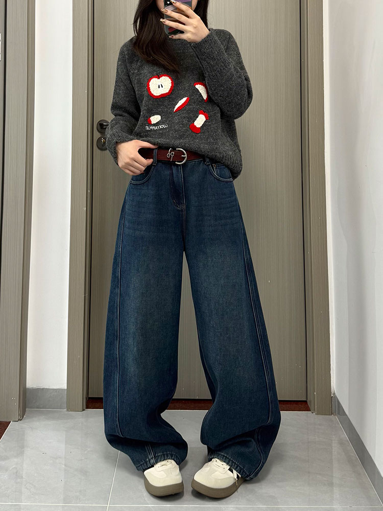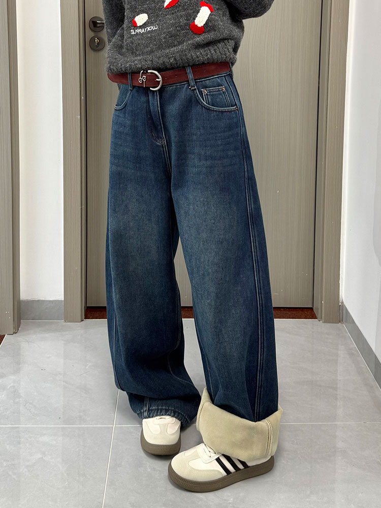 实拍~~复古弯刀加绒牛仔裤女2025冬装新款女装加厚阔腿裤子