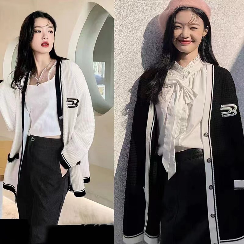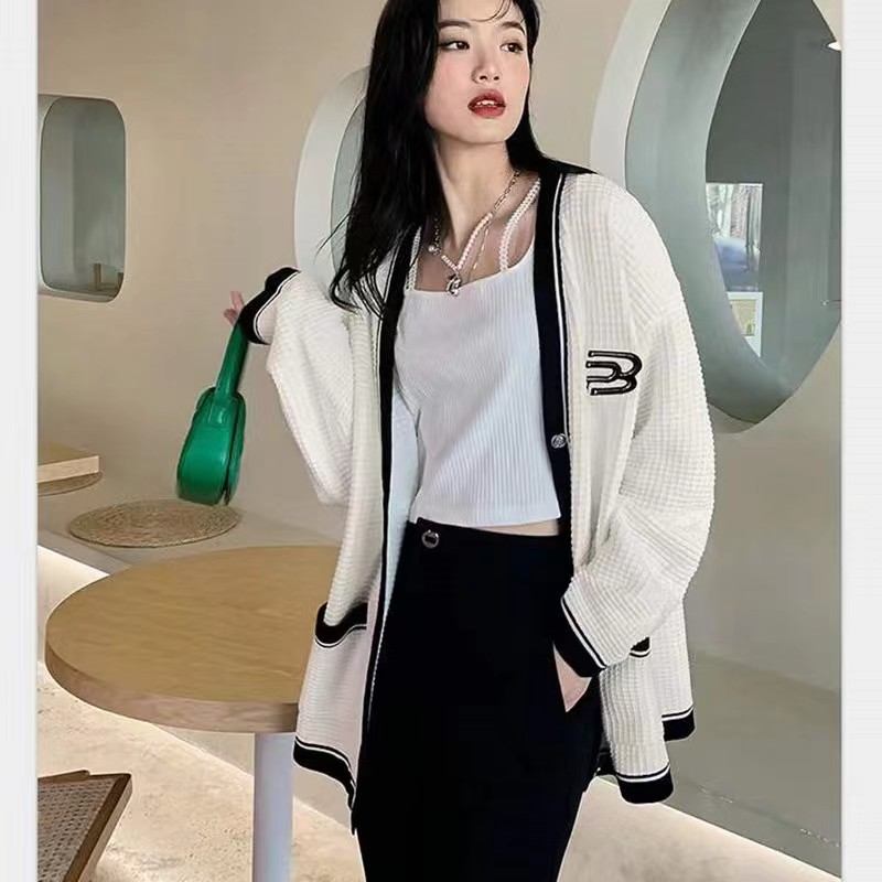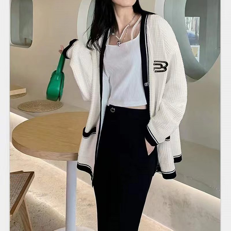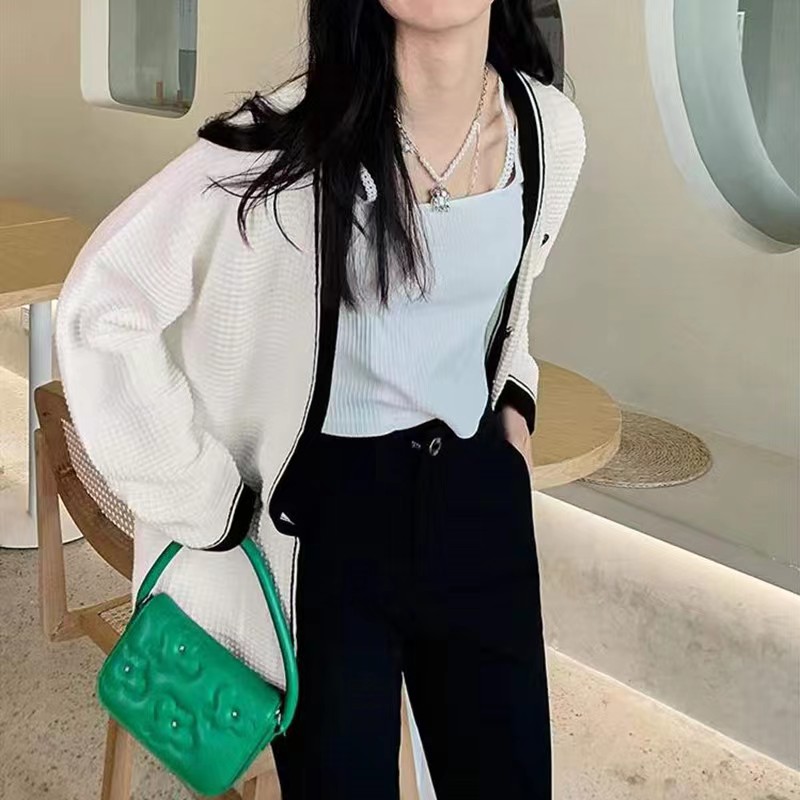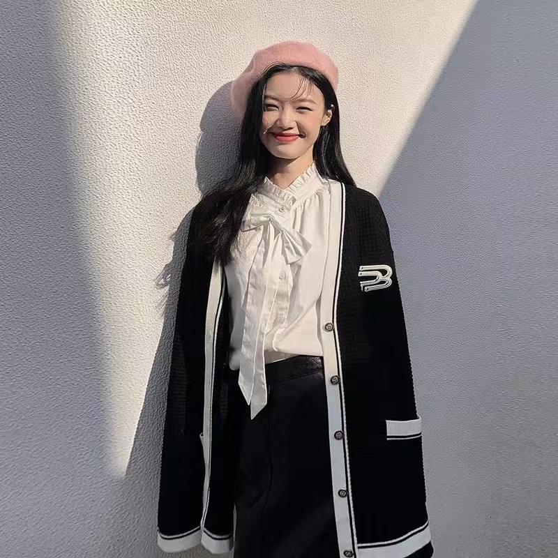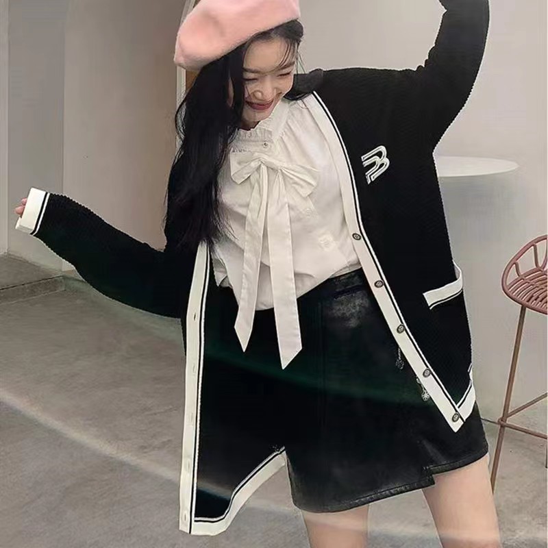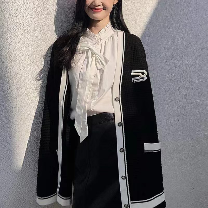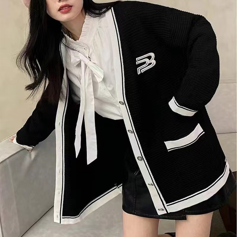黑色毛衣外套女春秋季V领日系慵懒学院风拼色设计感小众针织开衫