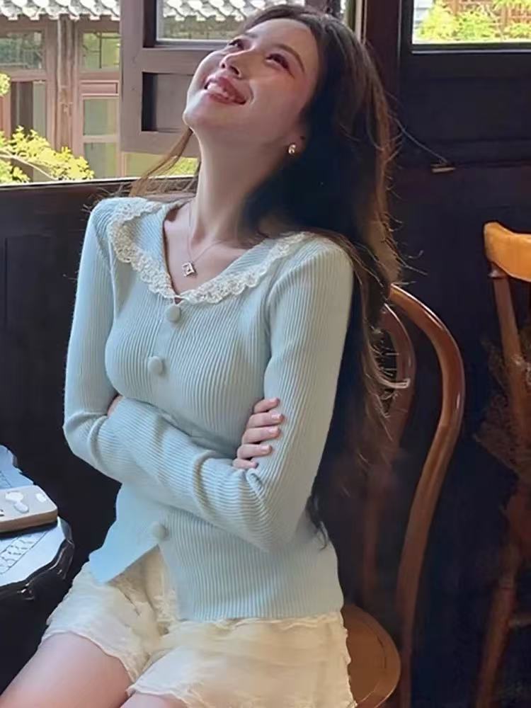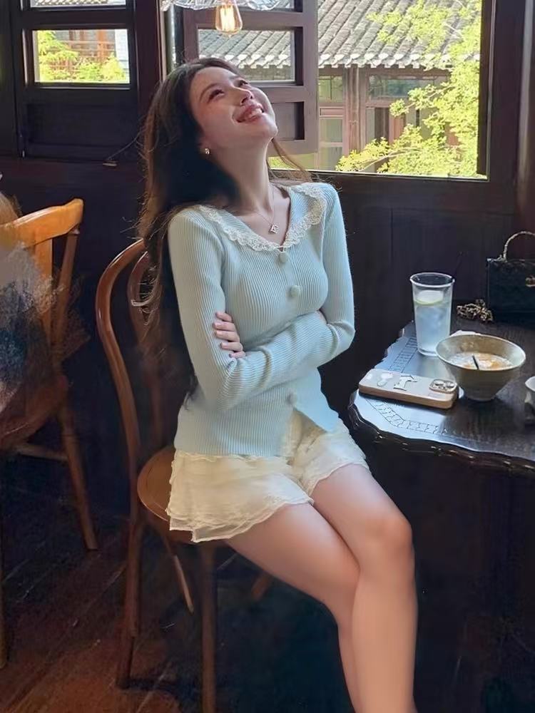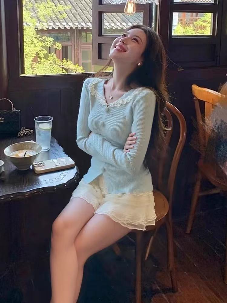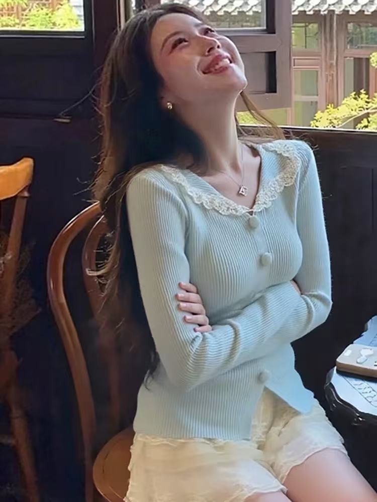 纯欲甜辣妹蕾丝拼接长袖上衣设计感秋冬绝美修身翻领针织打底衫女