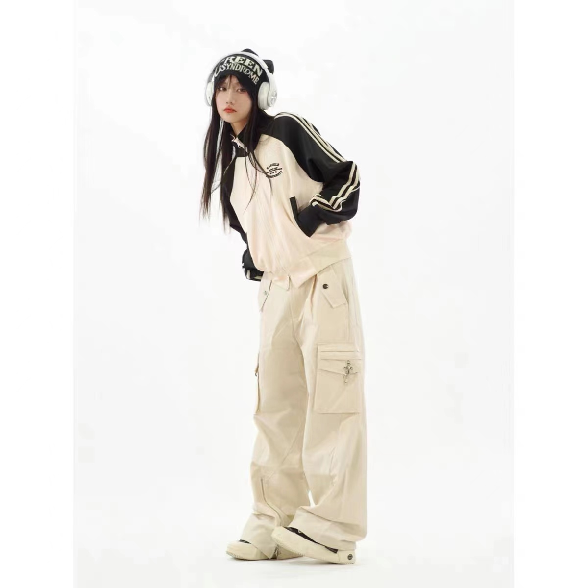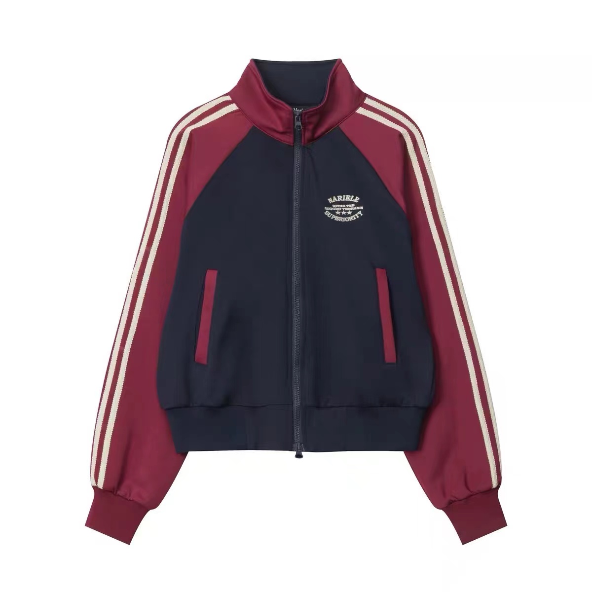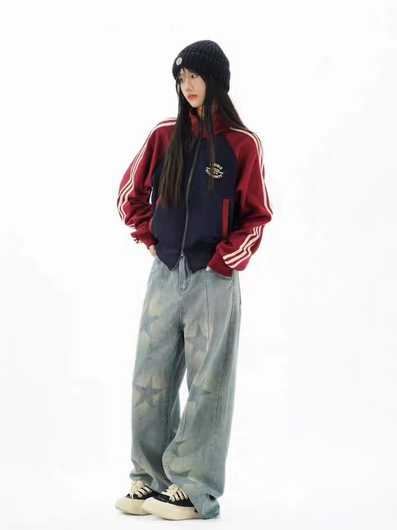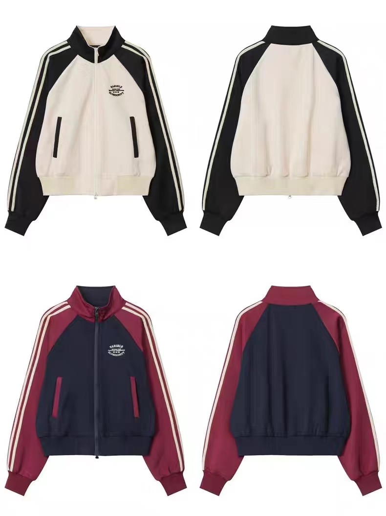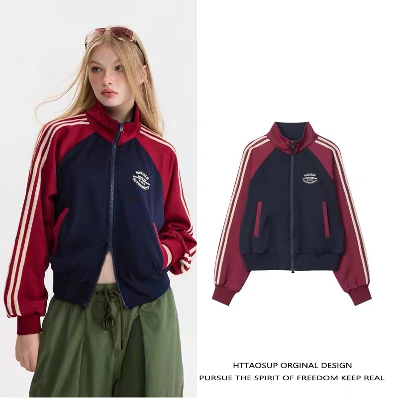 美式复古外套显瘦百搭学院风辣妹短款拉链开衫女条纹拼色立领