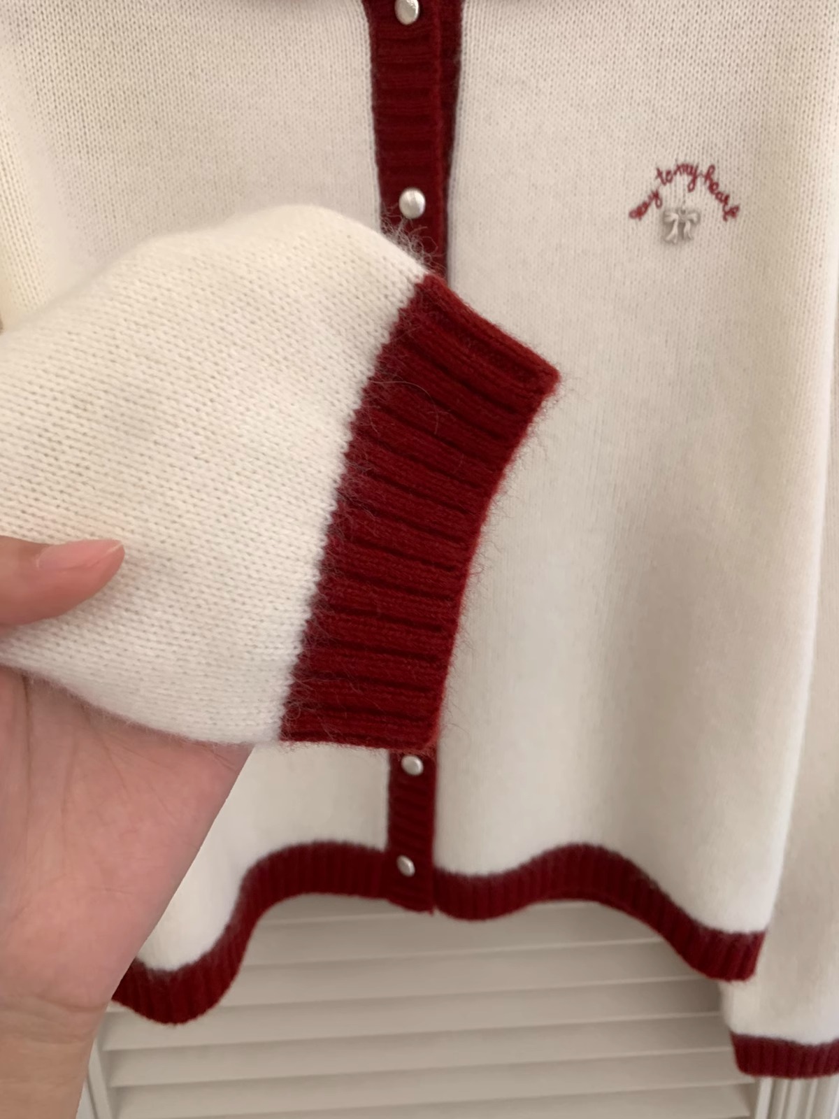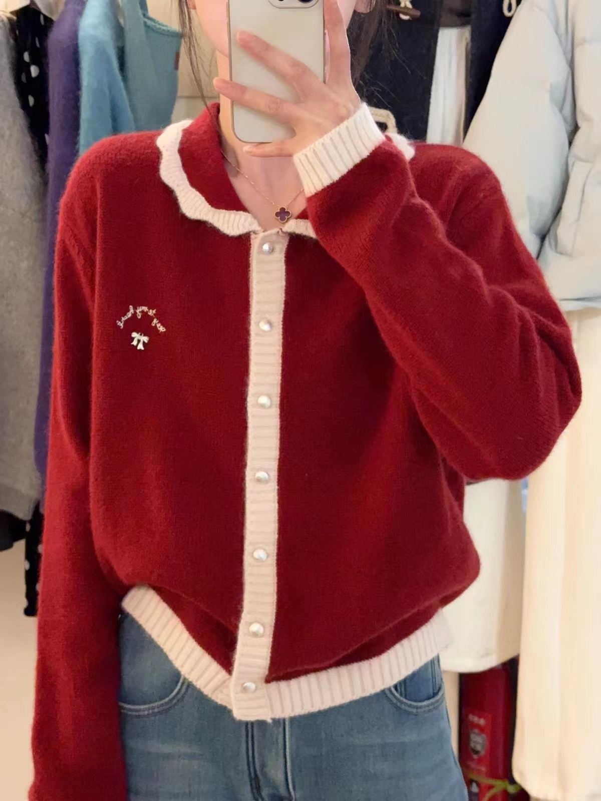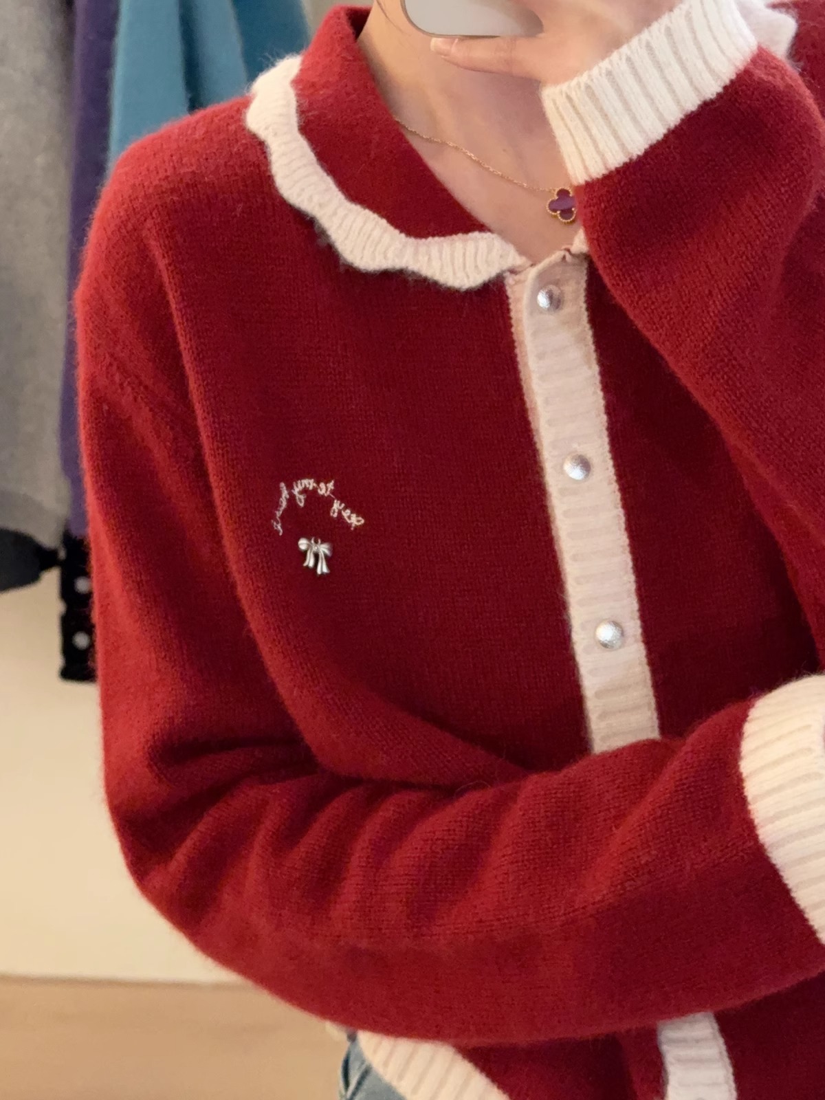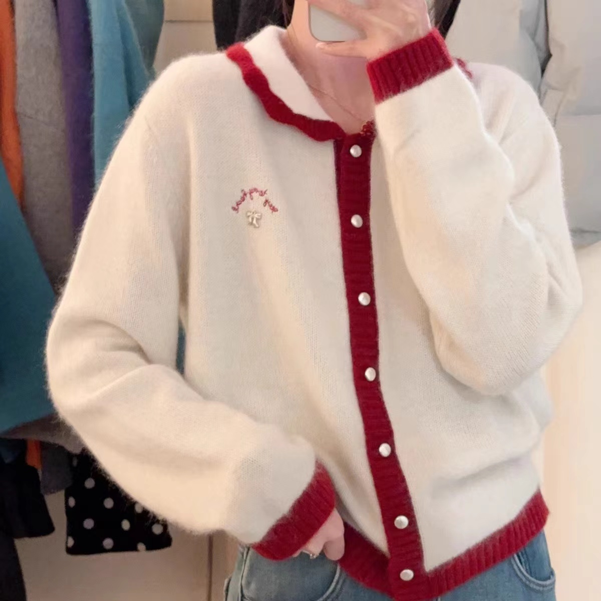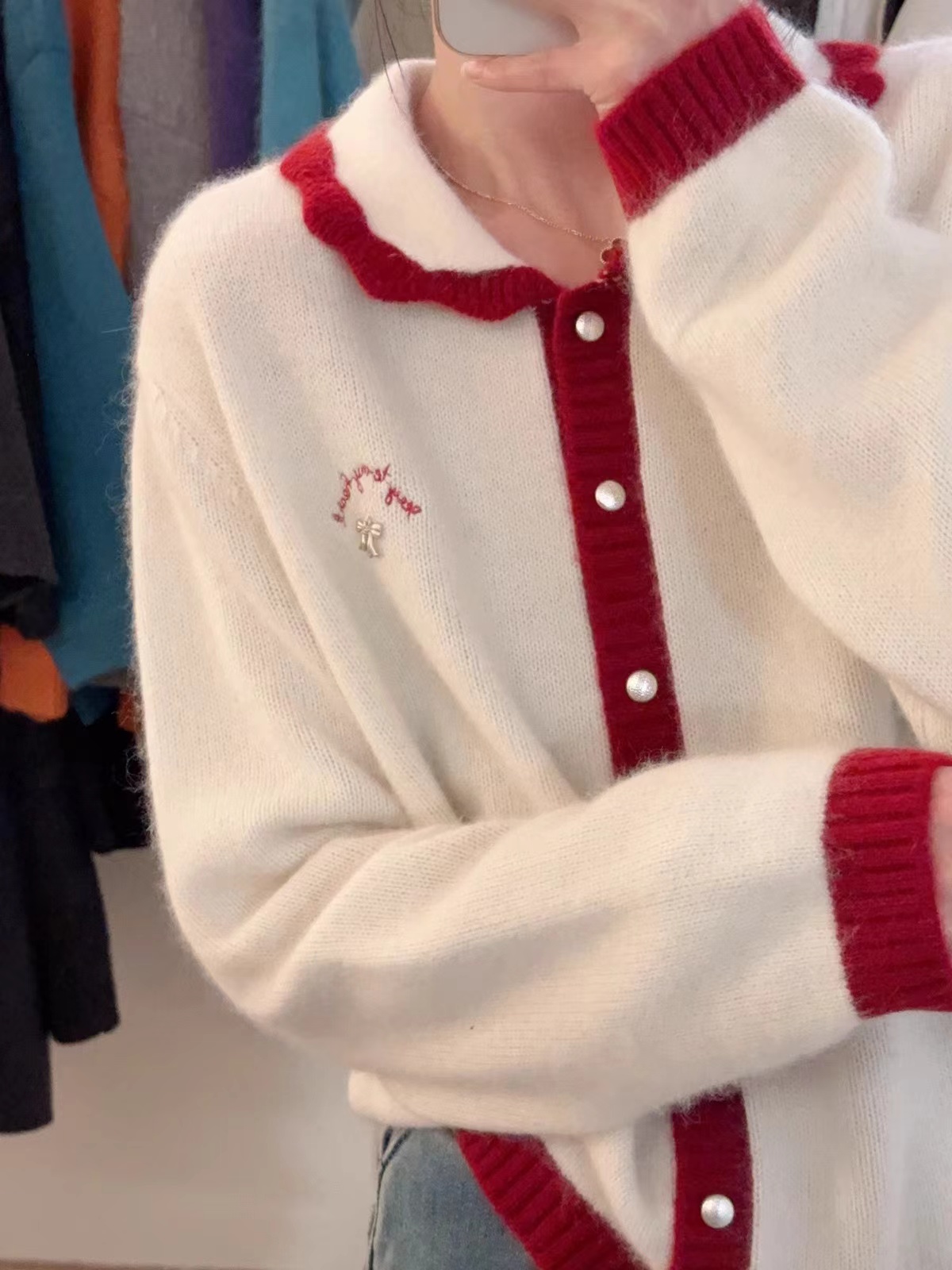 新年红色毛衣外套女冬季拼色小翻领蝴蝶结字母刺绣蜜熊绒针织开衫