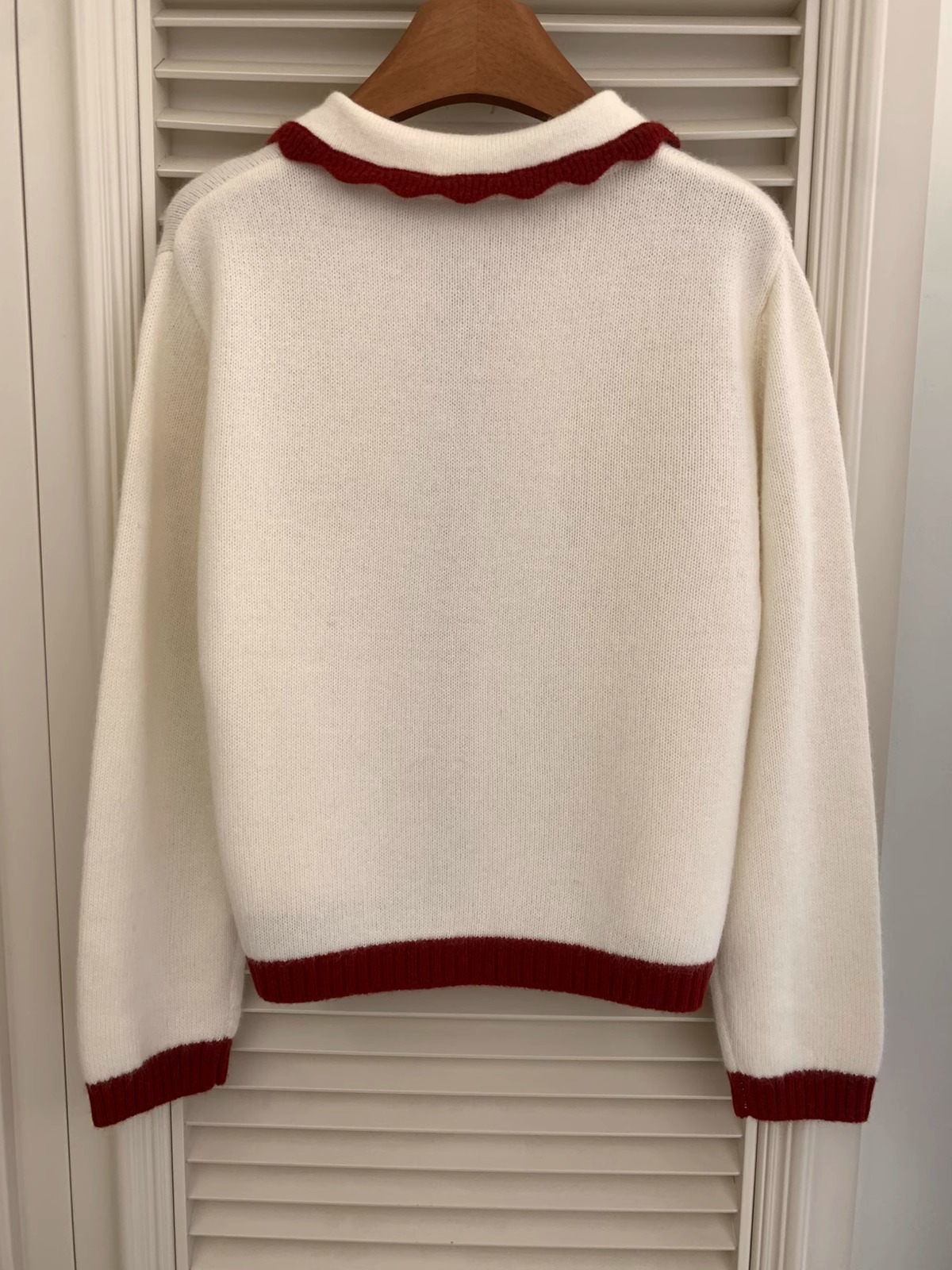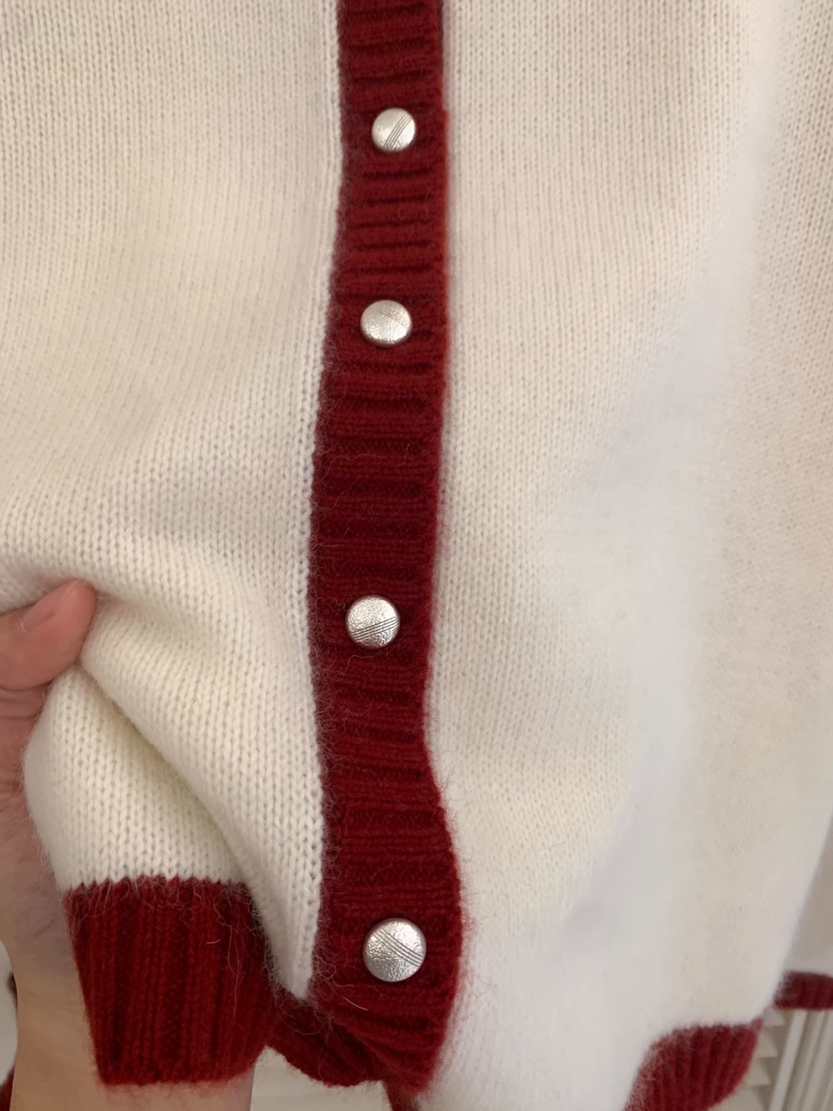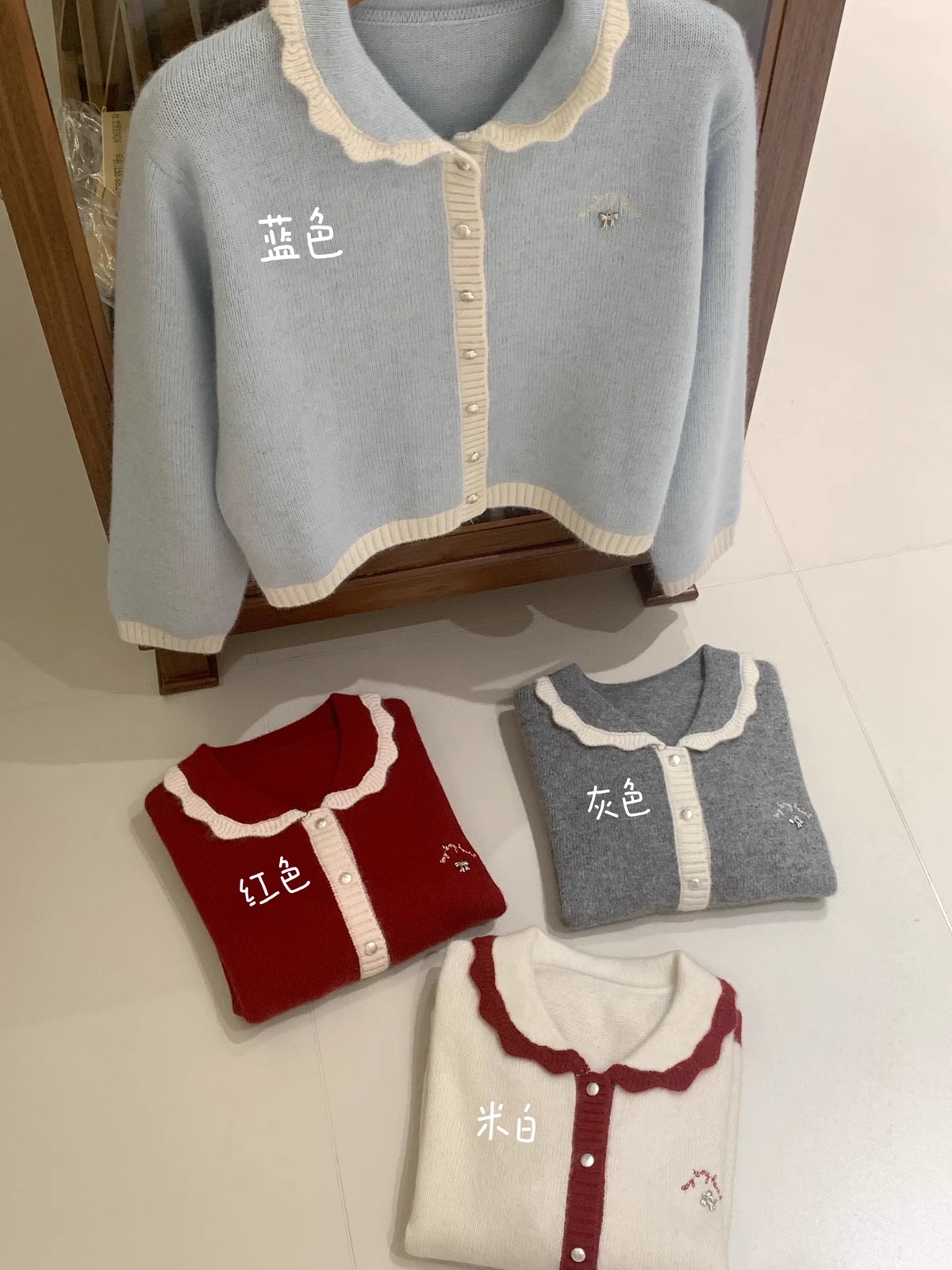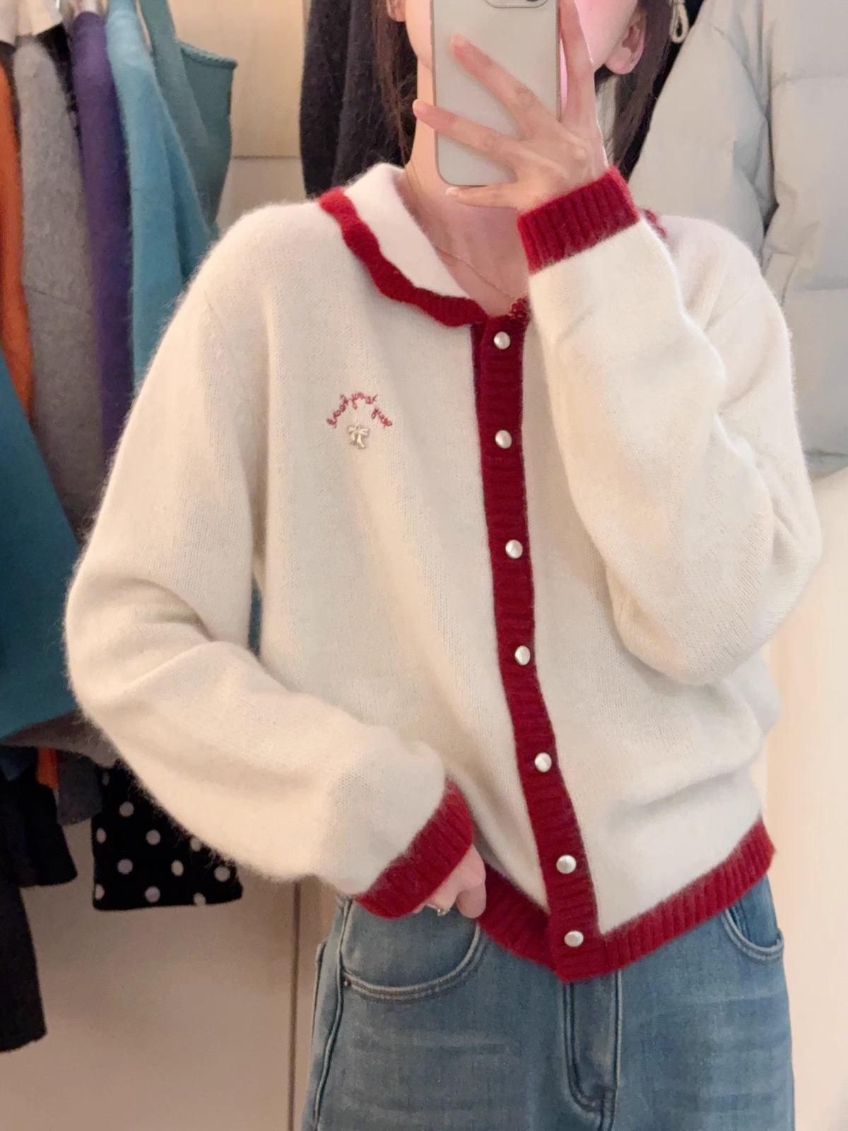 新年红色毛衣外套女冬季拼色小翻领蝴蝶结字母刺绣蜜熊绒针织开衫