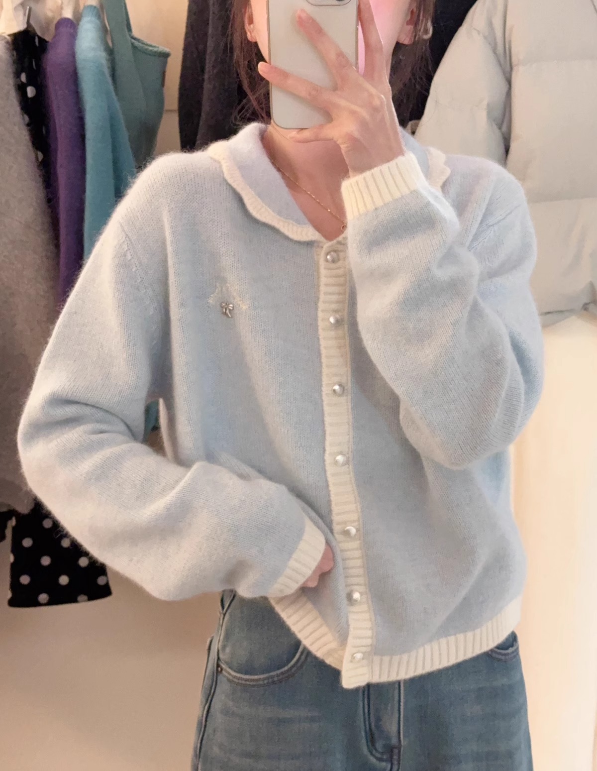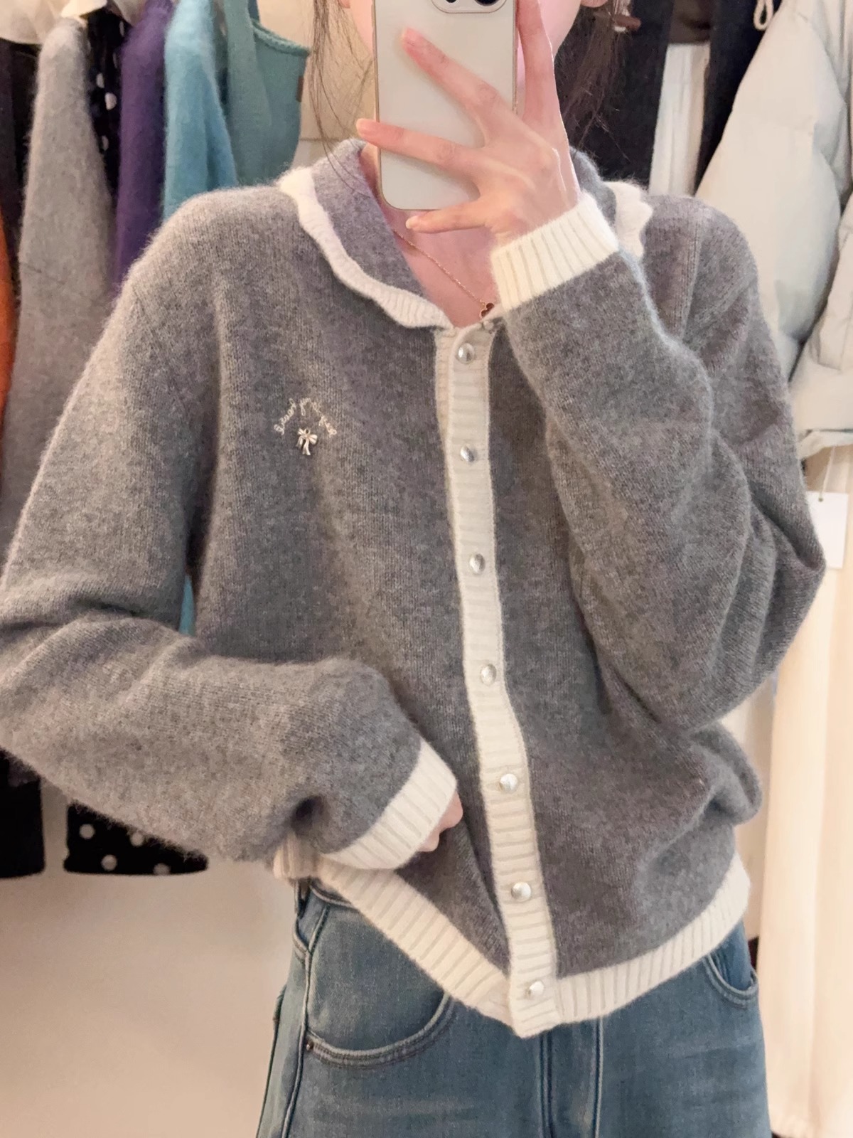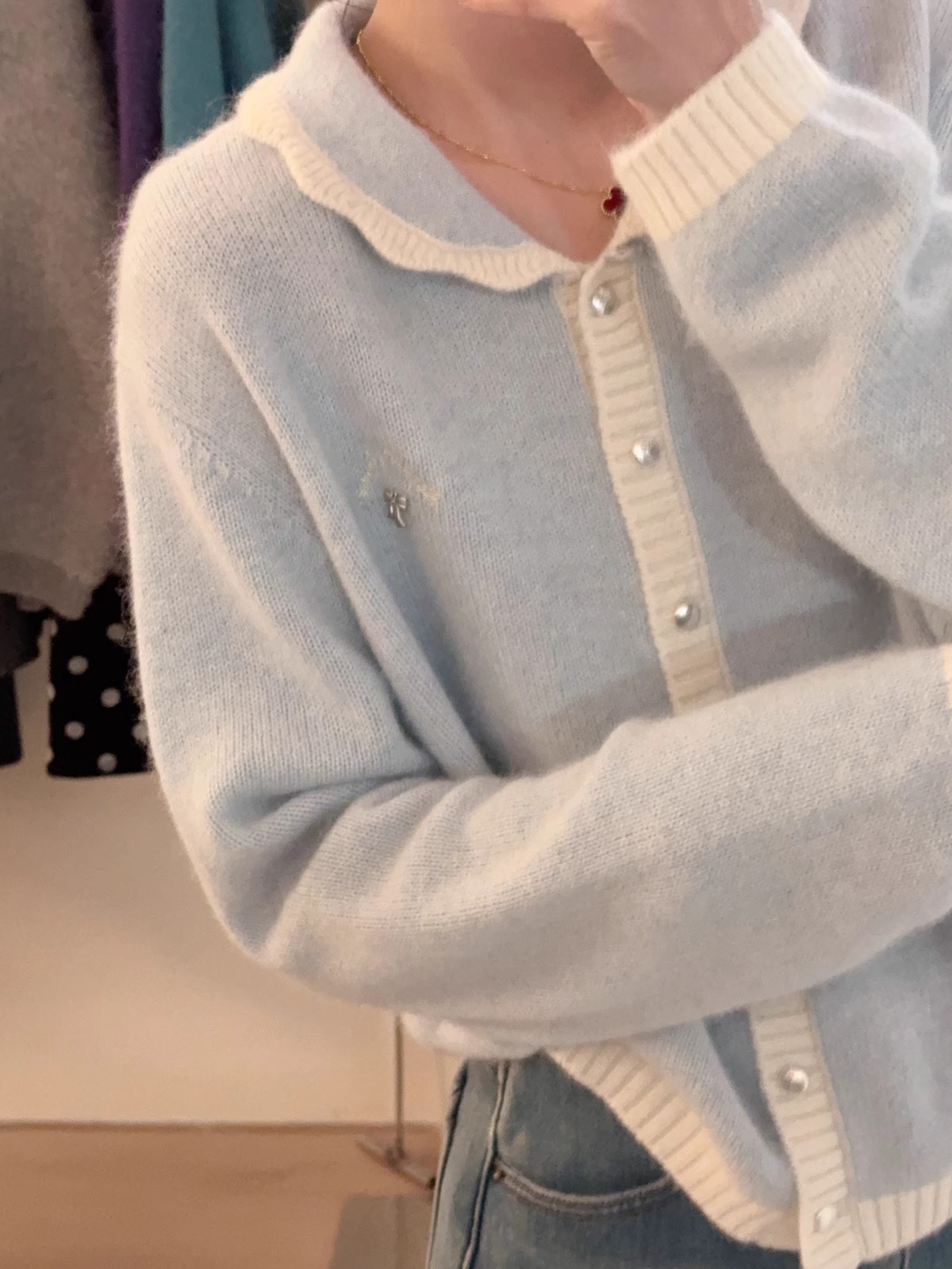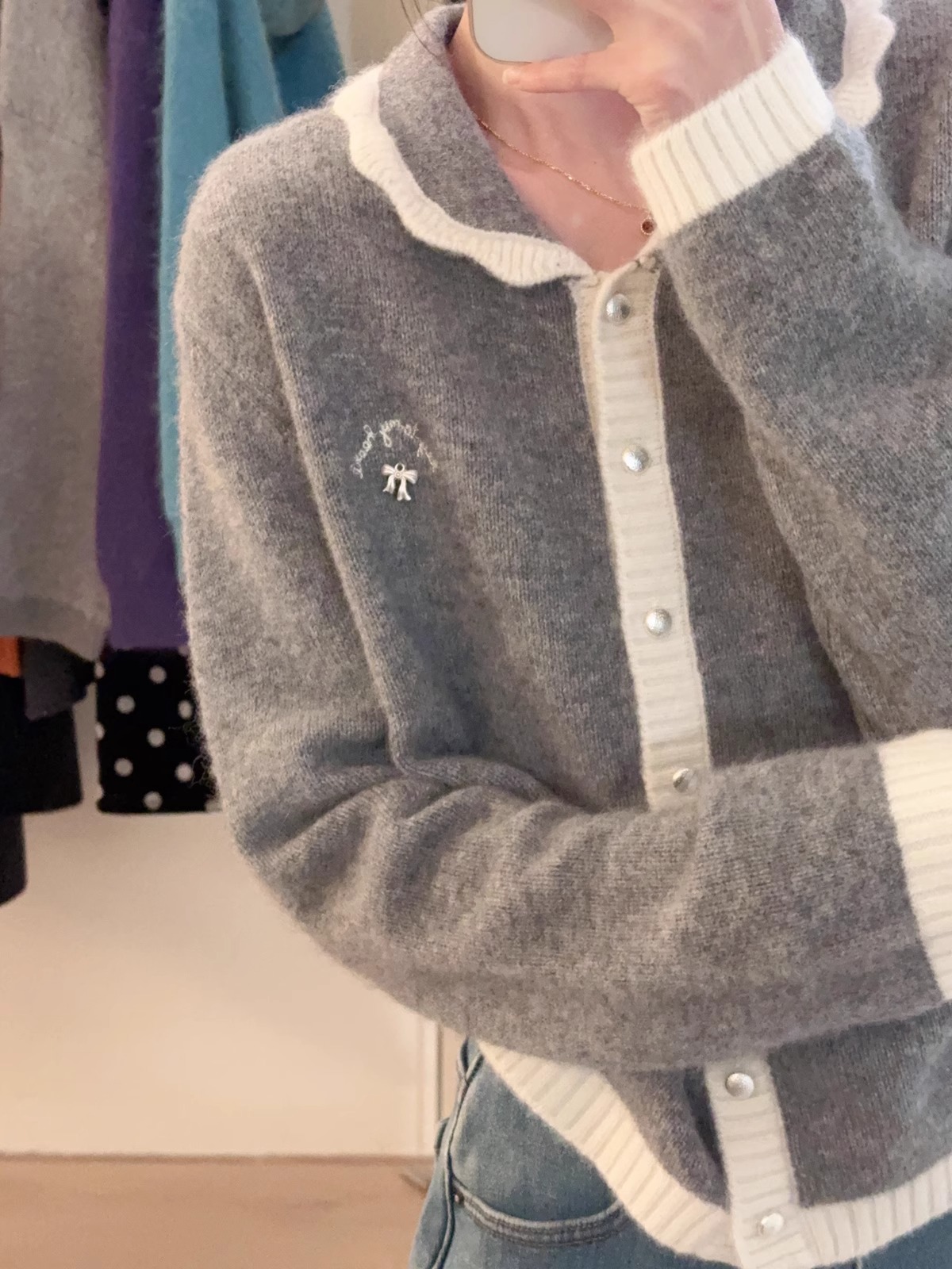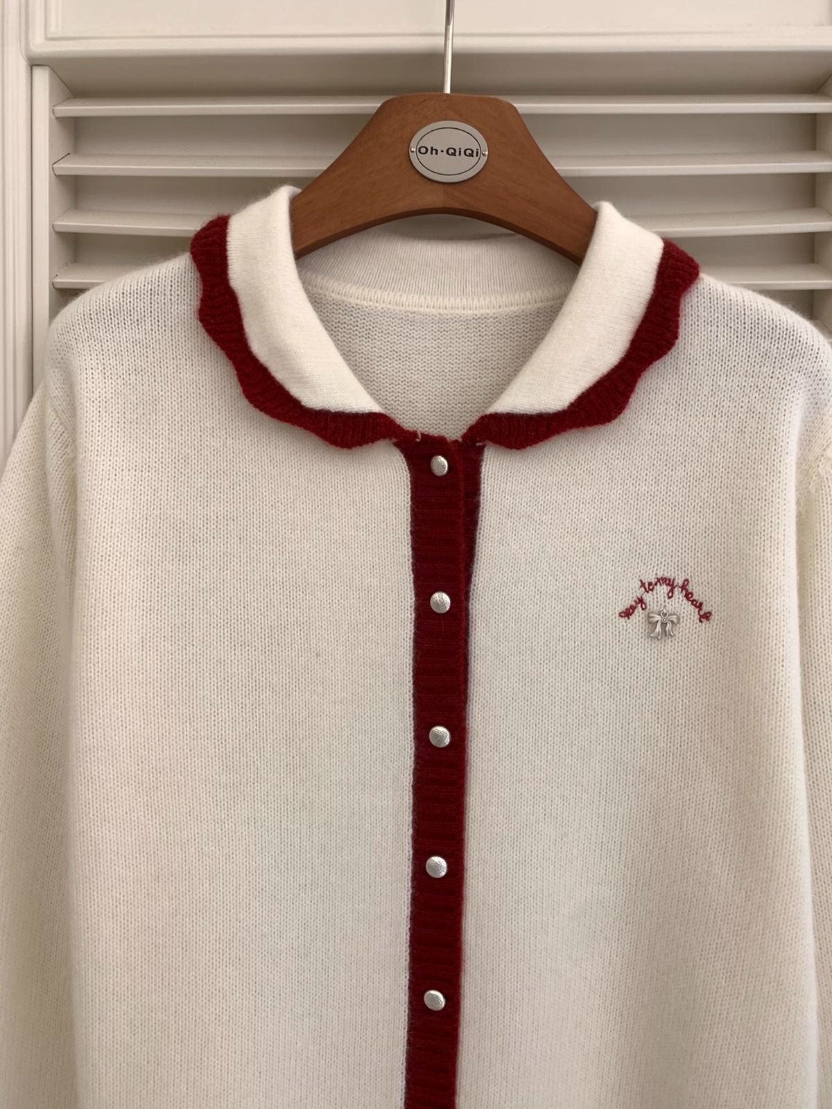 新年红色毛衣外套女冬季拼色小翻领蝴蝶结字母刺绣蜜熊绒针织开衫